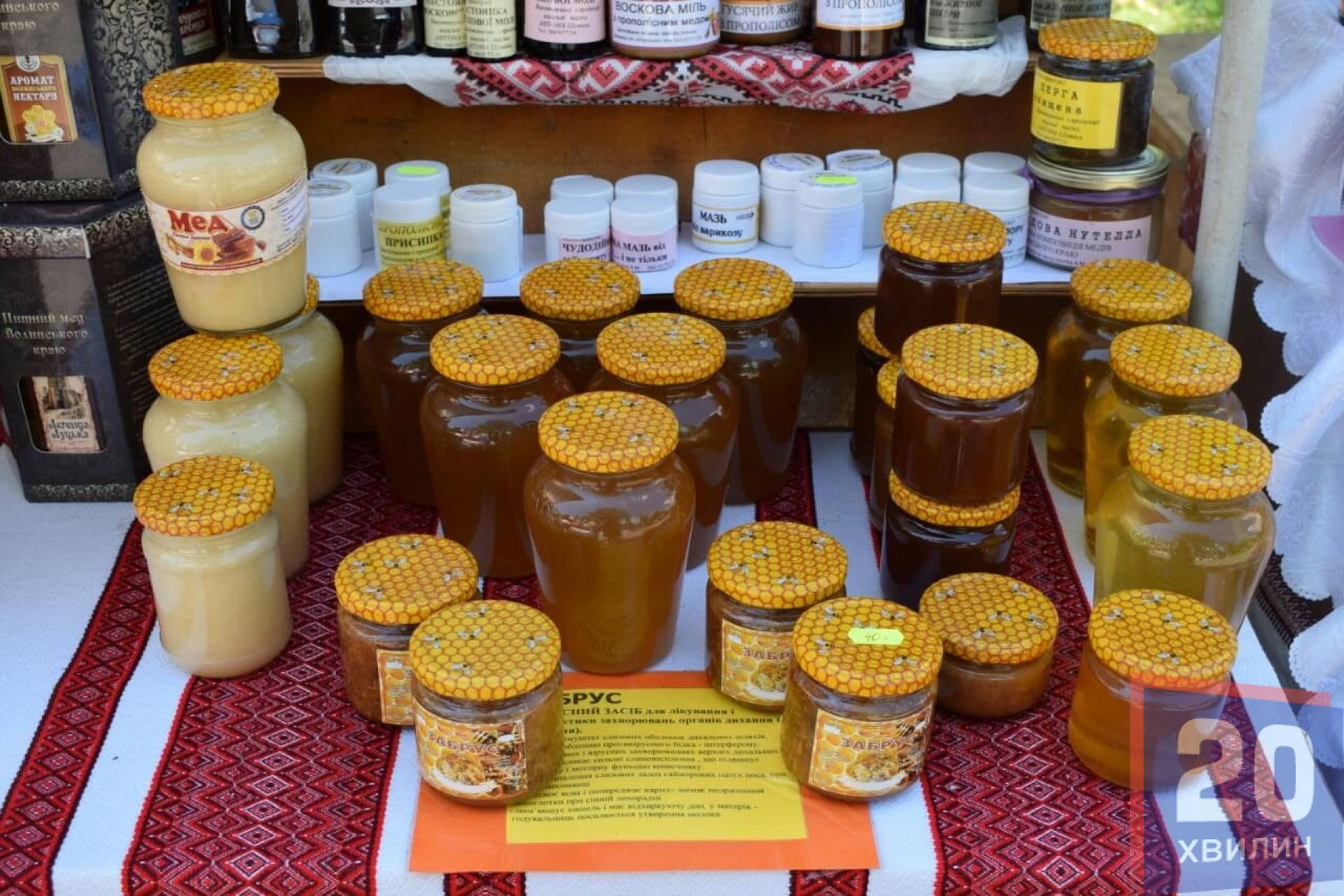 - Мед, медовуха, квас, прополіс, косметична продукція на основі меду, воскові свічки, різні медові смаколики. Чого тут тільки нема.