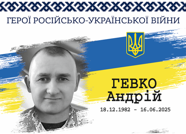 Андрій Гевко — 42-річний український військовик, молодший сержант, командир відділення дистанційного мінування 4 взводу ударних безпілотних авіаційних комплексів 1 роти ударних безпілотних авіаційних комплексів батальйону безпілотних систем військової частини А****. Отримав важке поранення 5 червня 2025 року після ураження автомобіля FPV-дроном поблизу населеного пункту Білицьке Покровського району Донецької області. Воїна госпіталізували до міської клінічної лікарні №4 у місто Дніпро. Медики боролися за його життя, однак врятувати Андрія не вдалося. 16 червня 2025 року від отриманих травм Герой помер.