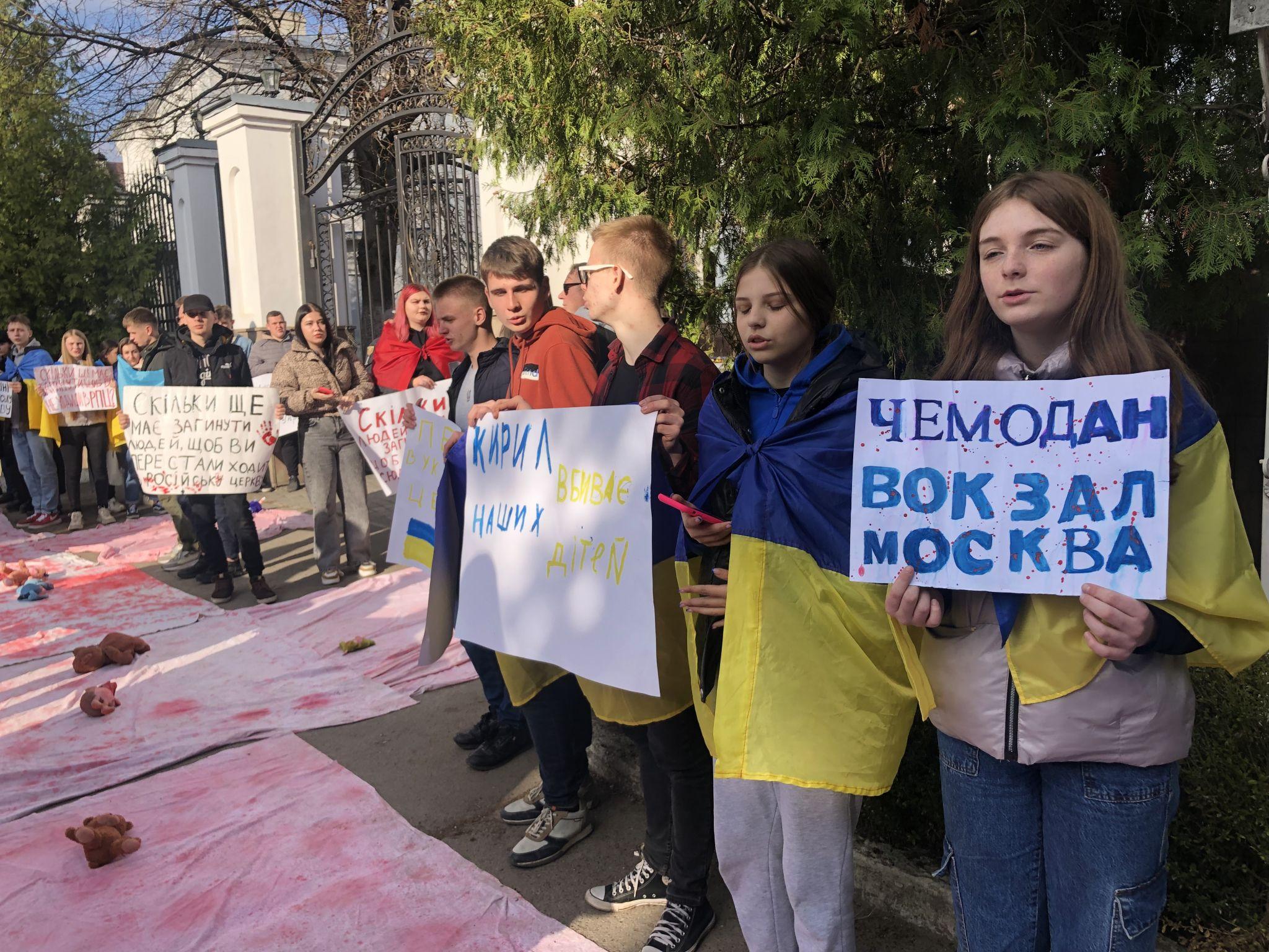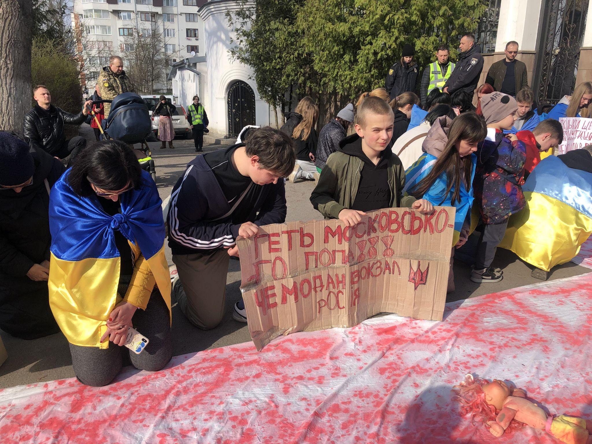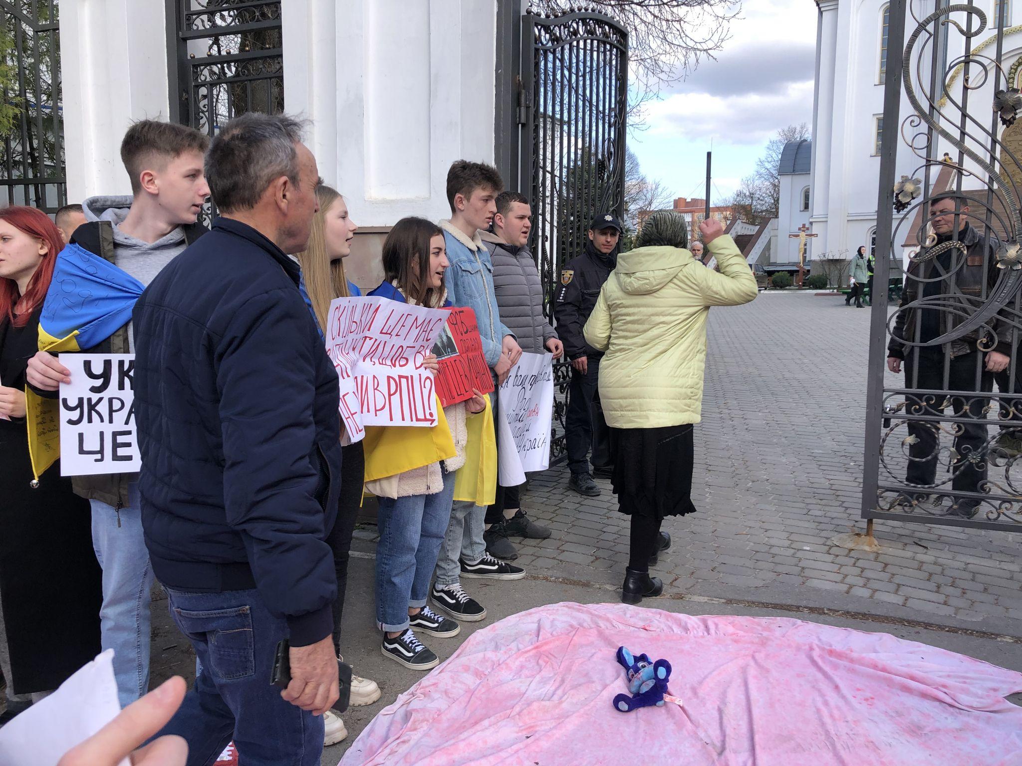 До храму молодь не заходить, а ось біля брами влаштовує мирні акції. Традиційно вони приносять плакати, полотна та іграшки у червоній фарбі. Таким чином хочуть звернути увагу вірян та священників до кількості загиблих українців через війну, що розпочала росія.