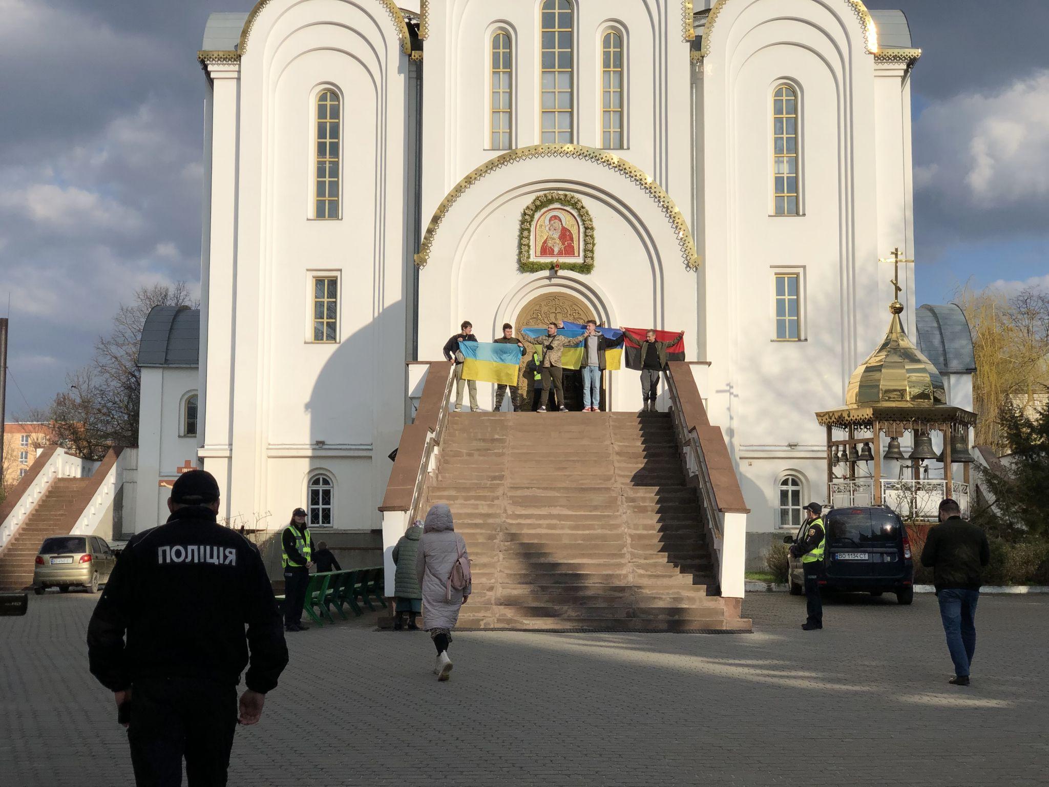 18.08 Учасники мирної акції розправили біля дверей храму українські прапори. Слава Україні!
