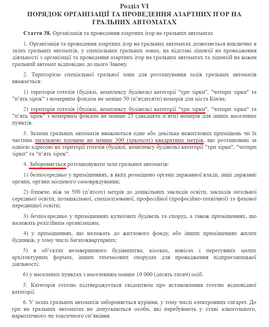 У статті 38 чітко описані вимоги до приміщення, де облаштовують залу ігрових автоматів.