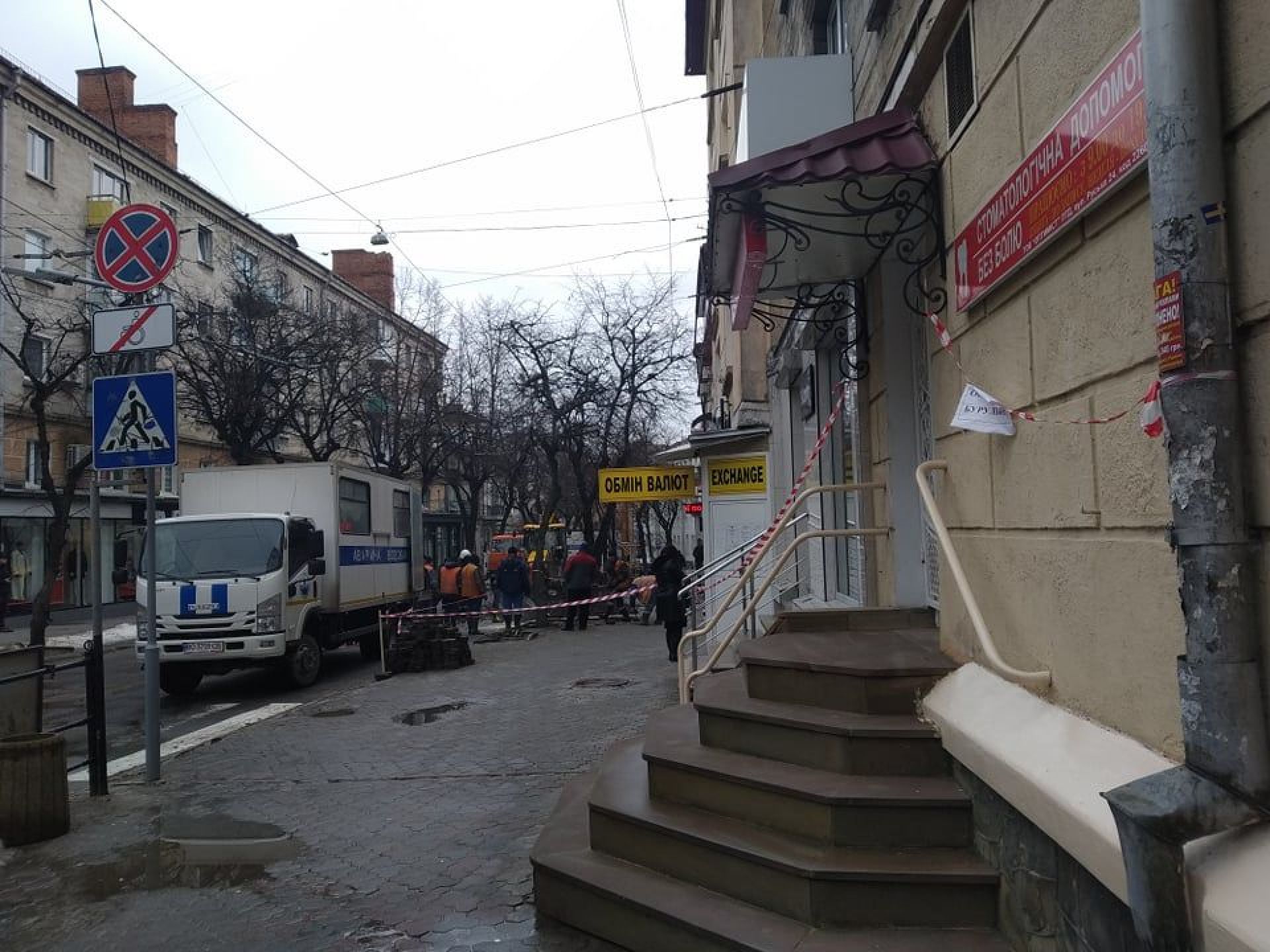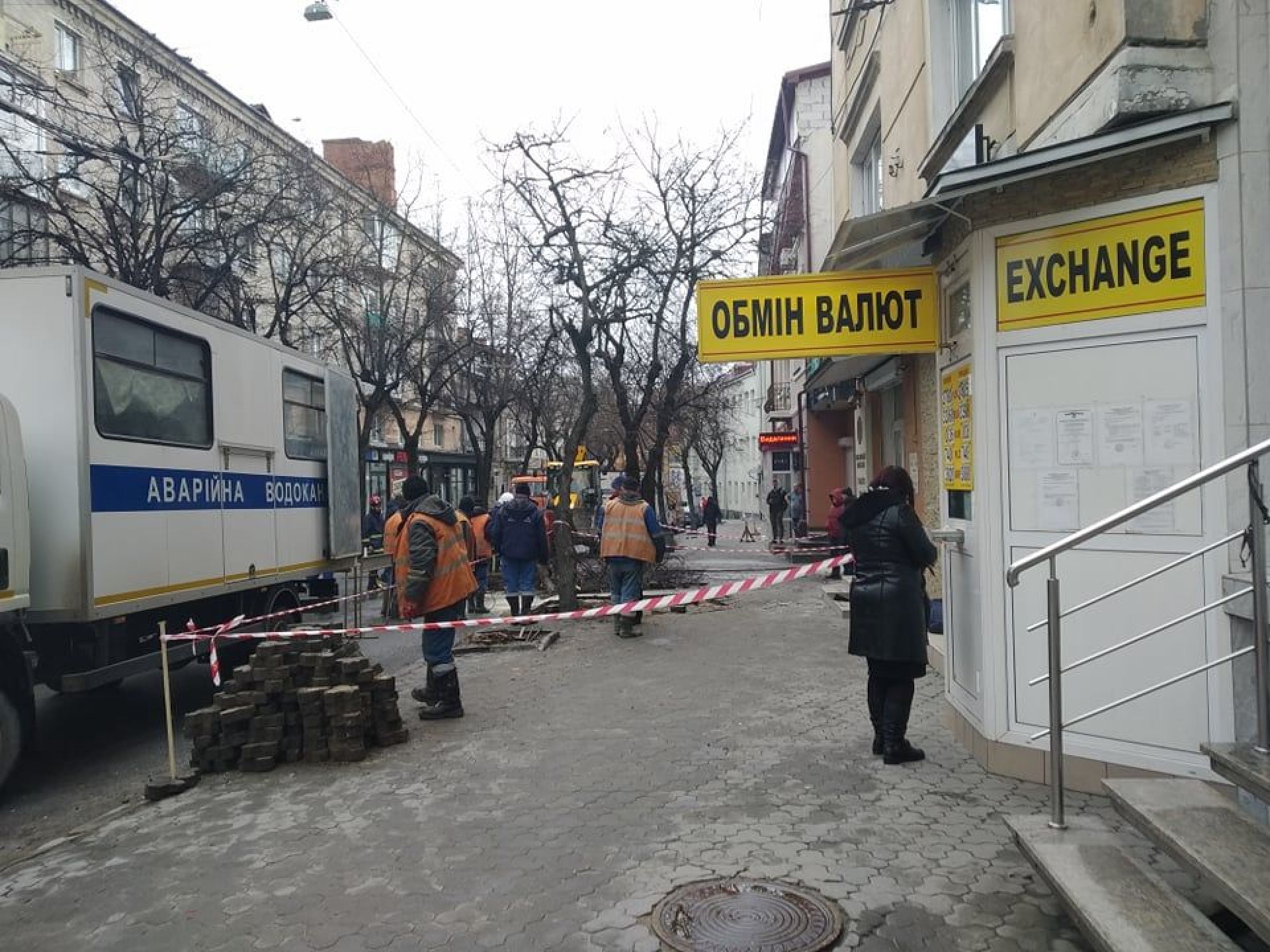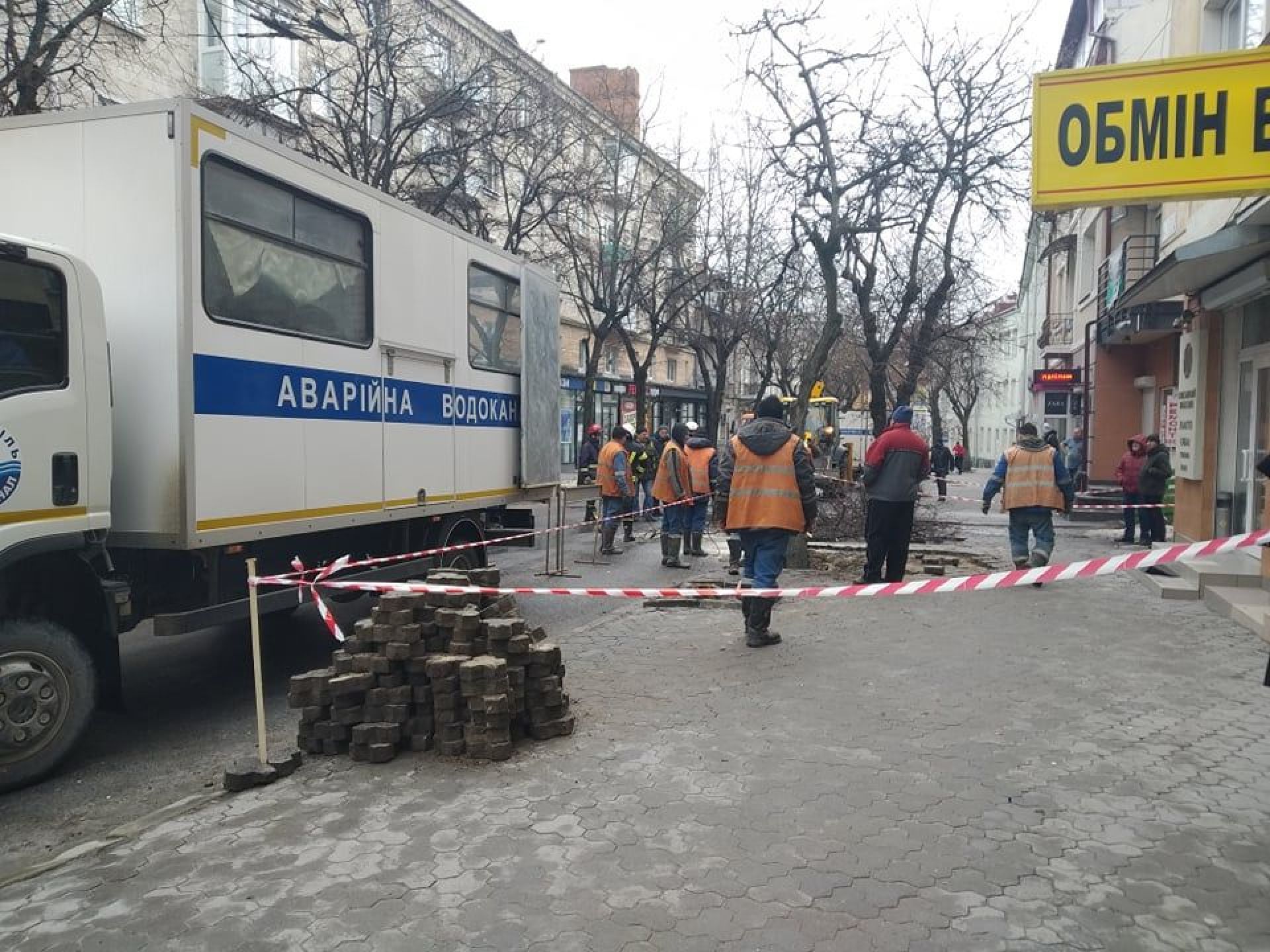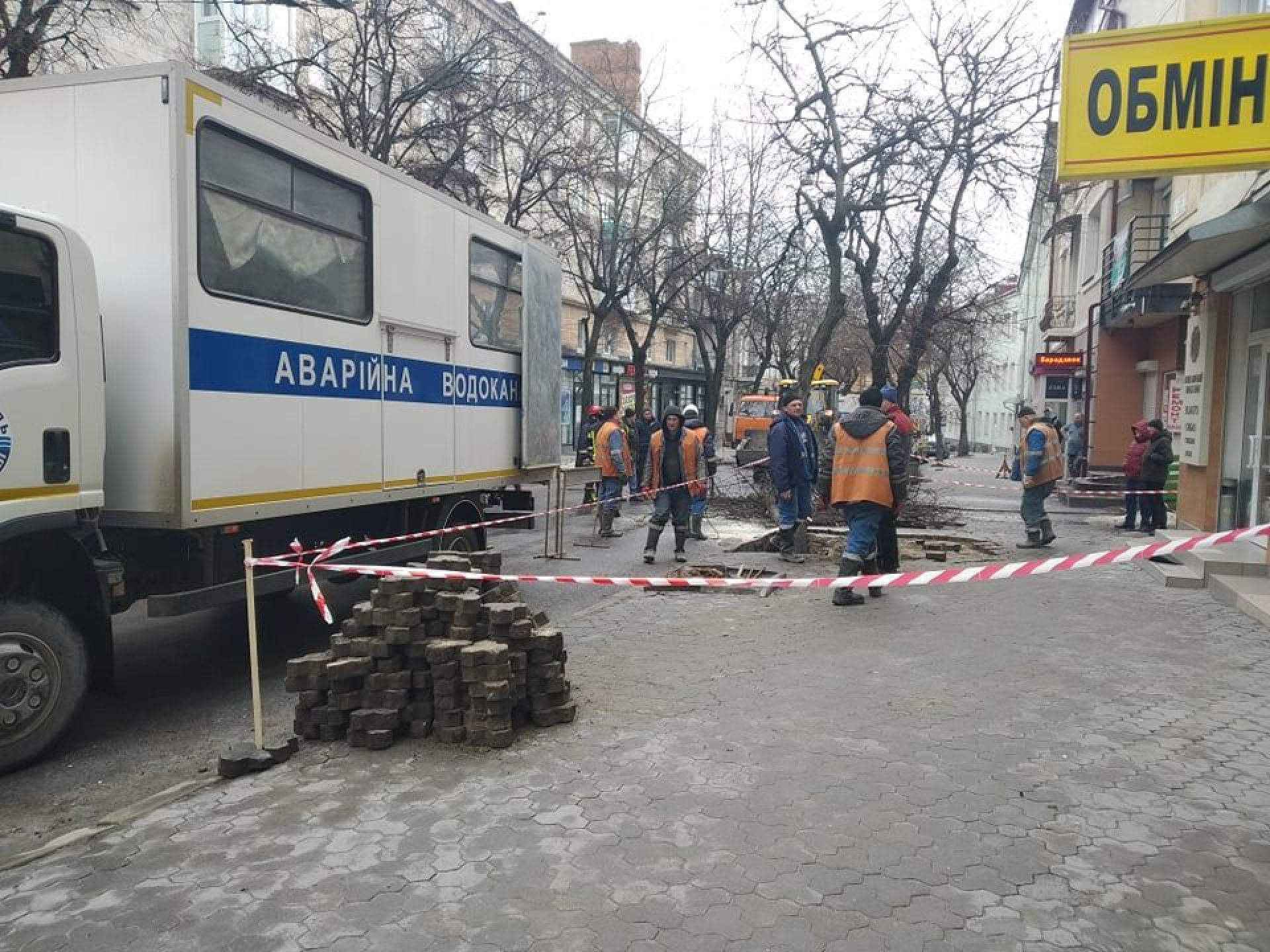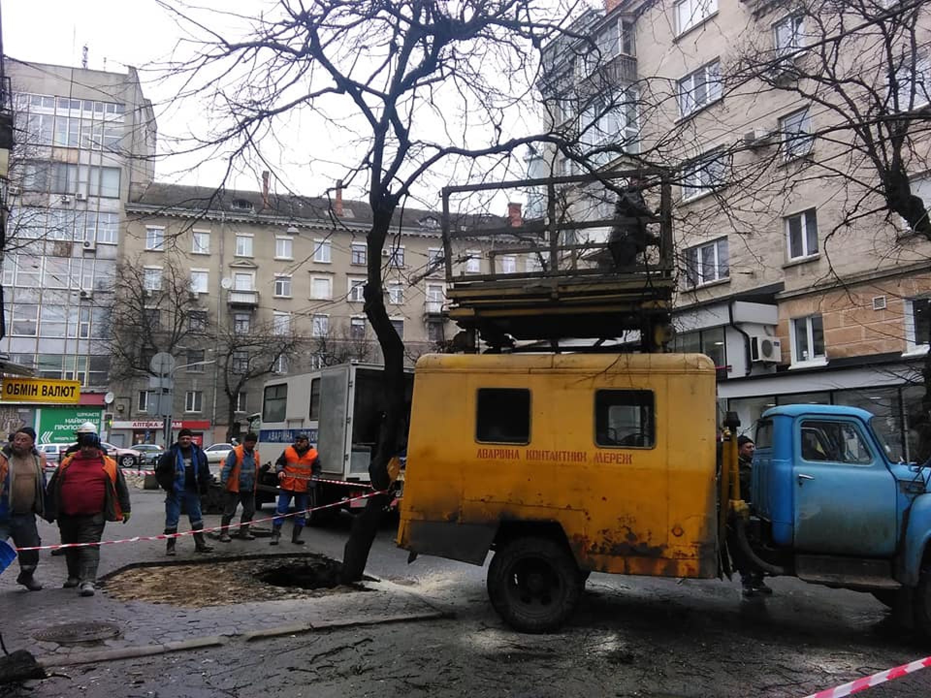 На фото видно, що на місці працює аварійна бригада. Місце обгороджене стрічкою.