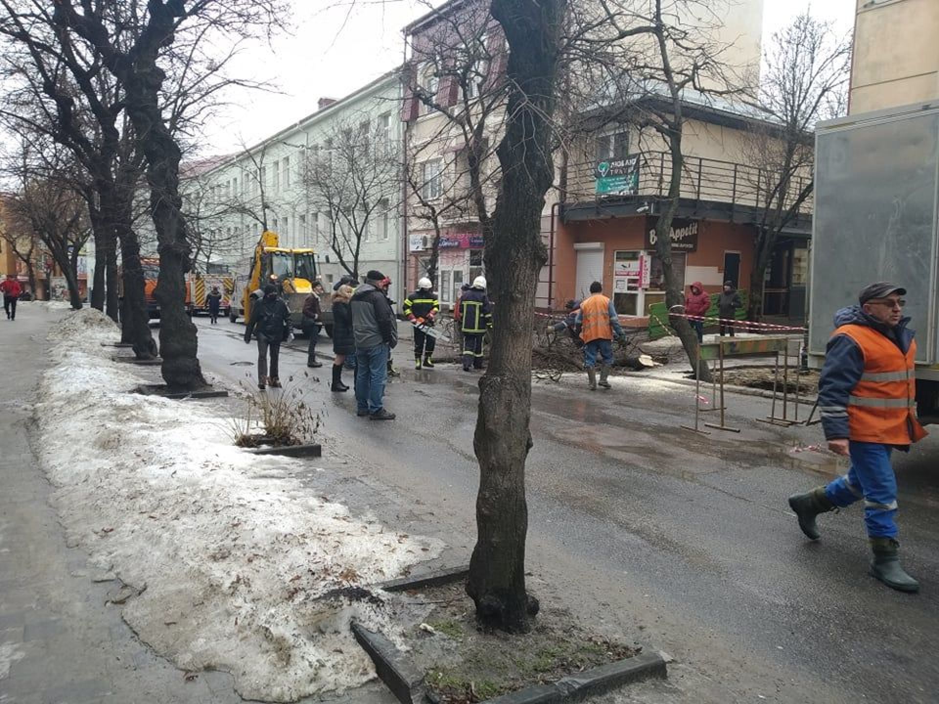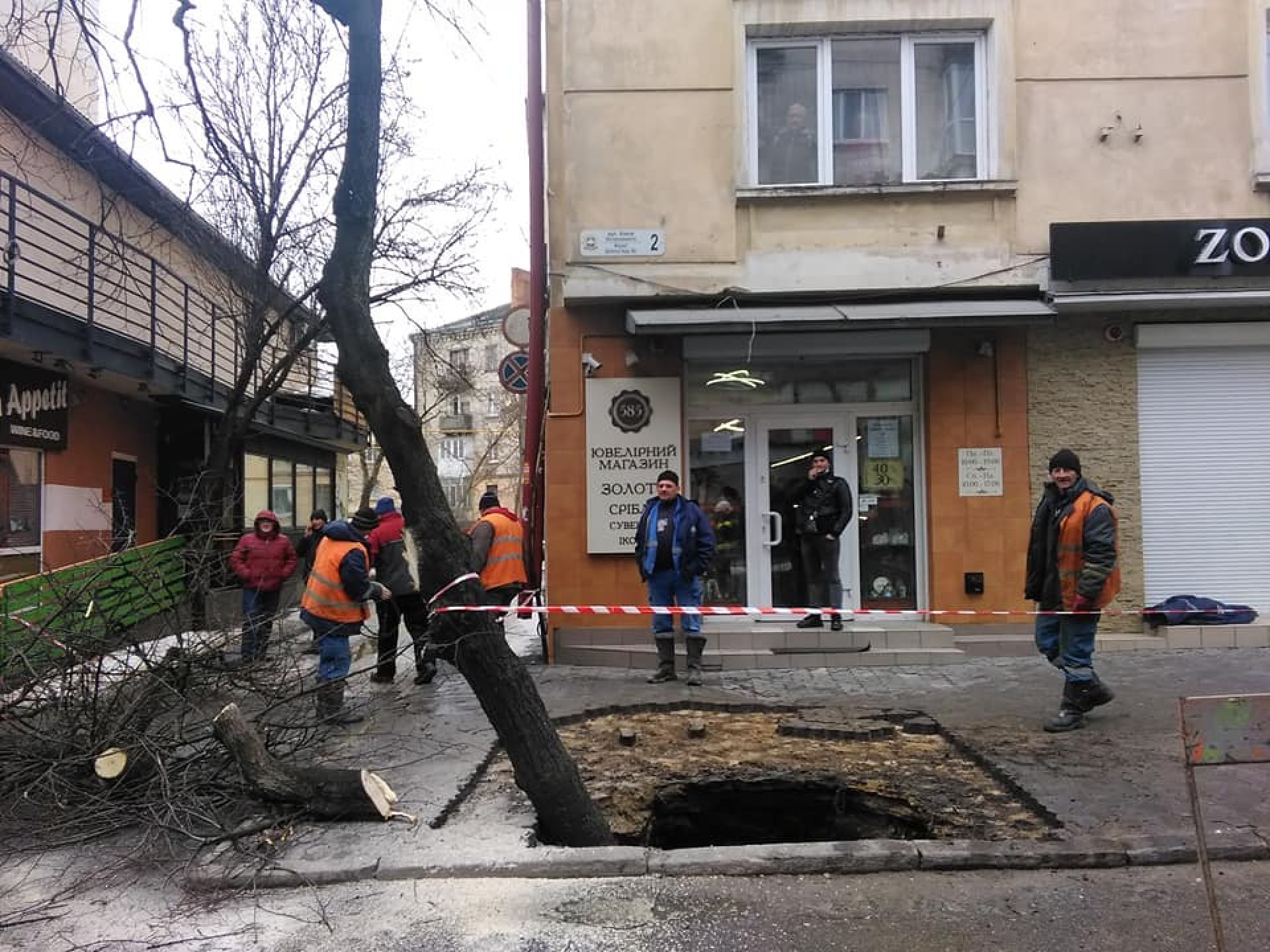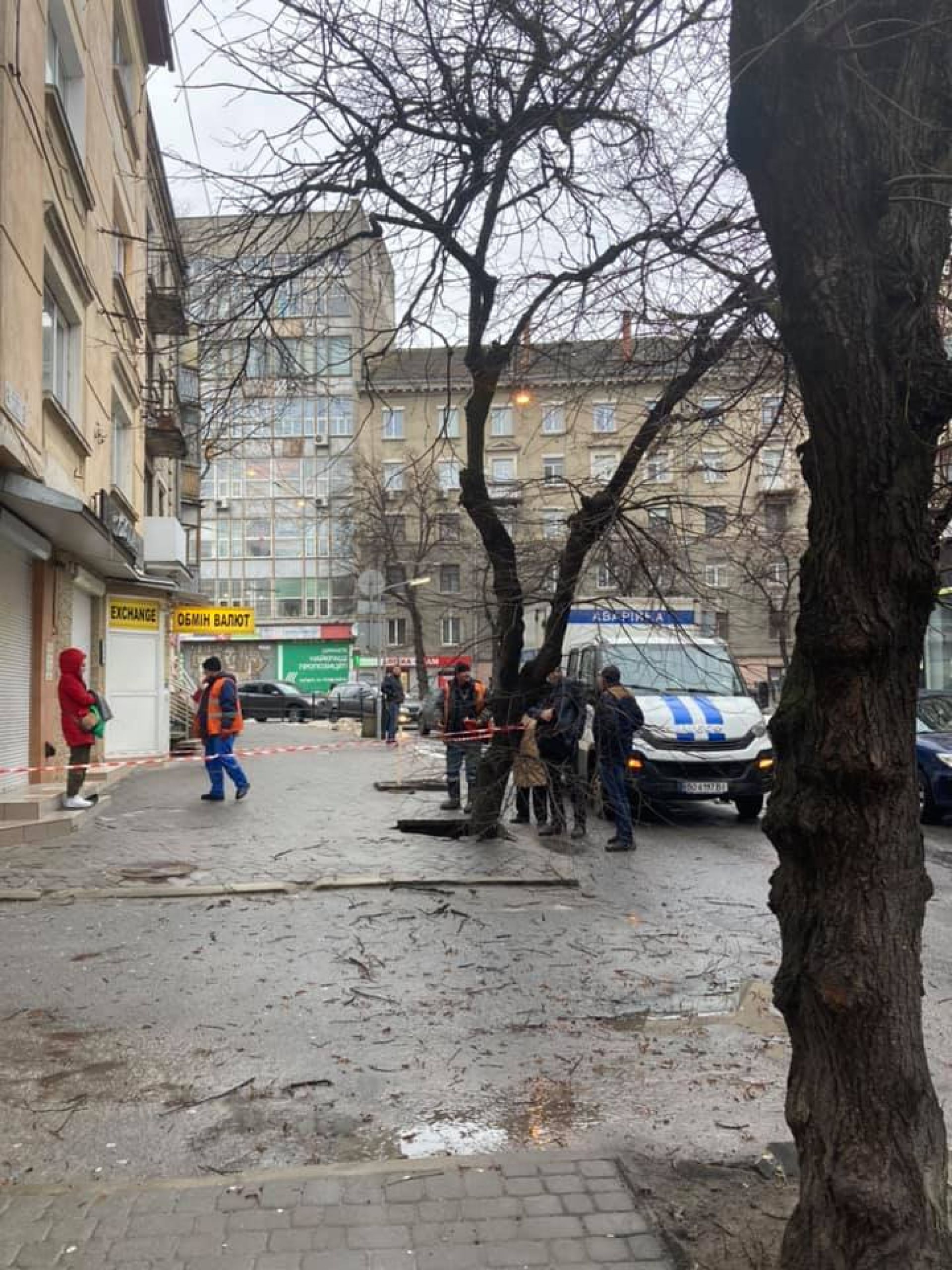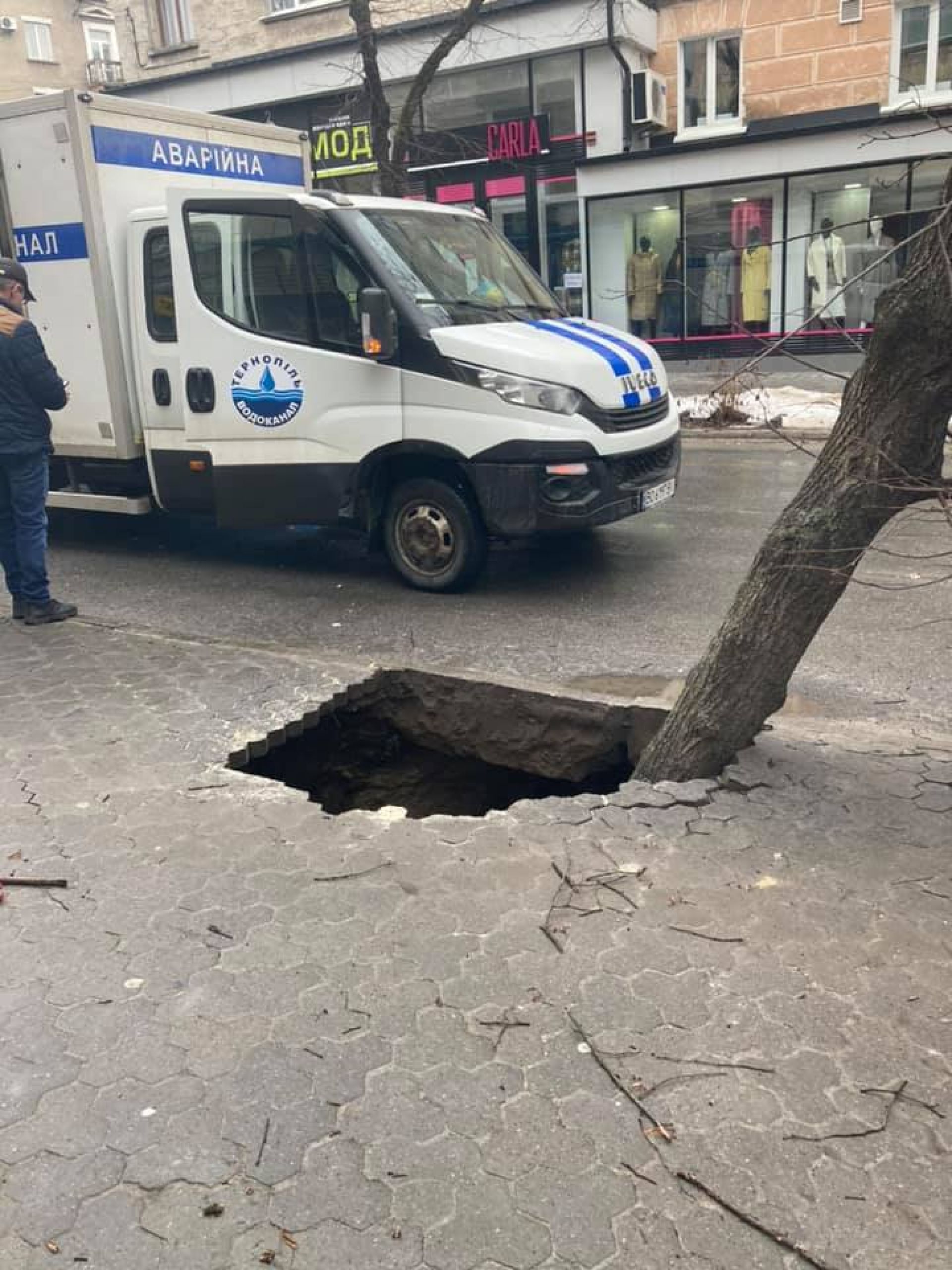 Зранку 27 лютого в групі в групі "Тернопільські плітки" Наталія Заяць опублікувала фотографії з вул. Острозького, на яких видно, що посіла бруківка і провалилося дерево.