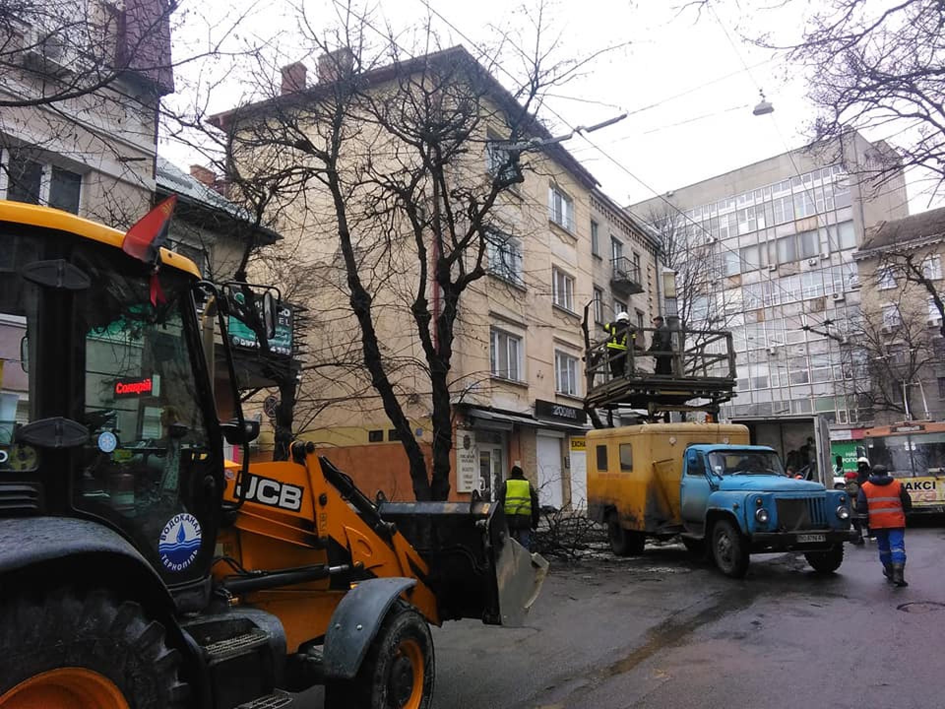 На вул Острозького побувала і наша журналістка. Вона повідомляє, що роботи тривають досі. Аварійне дерево спилювали. Станом на 12.30 дорога на вул. Острозького залишається перекритою. Громадський транспорт теж змушений об'їжджати.