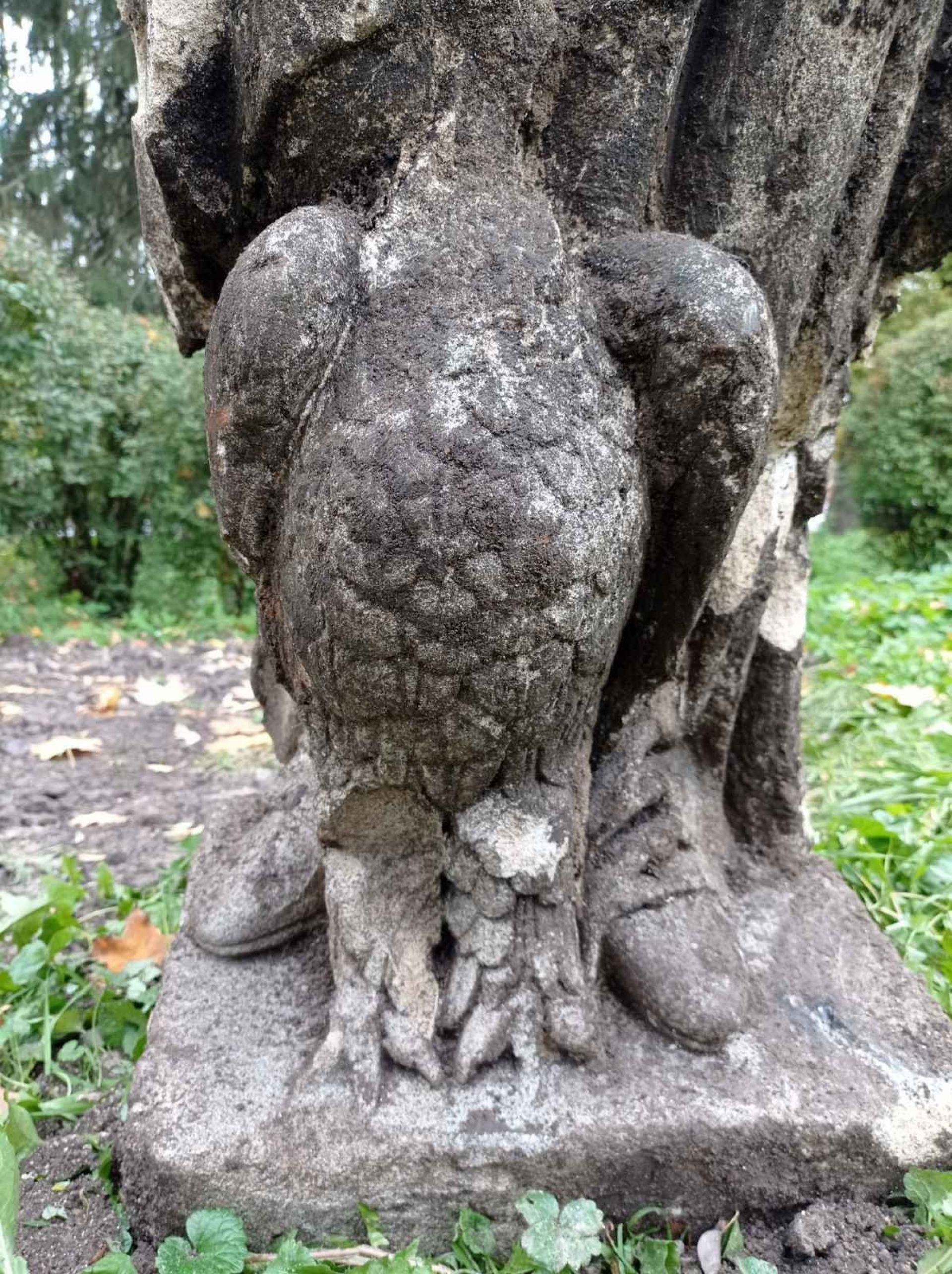 Volodymyr Moroz пише: Сучасна вулиця Грушевського була колись Святоіванівською. На ній розміщувалася одна з міських громадських криниць, а при ній - каплиця святого Івана. Орел - символ святого євангелиста Івана. Велика імовірність, що це залишок саме фігури святого Івана, зруйнованої, вочевидь, комуністами.