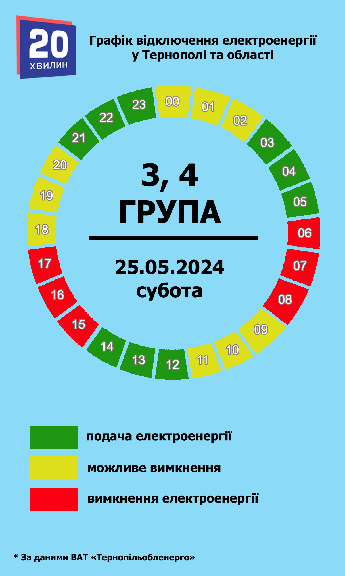 25 травня, для Тернопільської області, НЕК Укренерго встановило ліміти споживання з 20:00 до 24:00 год. Саме тому, вимкнення електроенергії в інші години поки що не прогнозується.