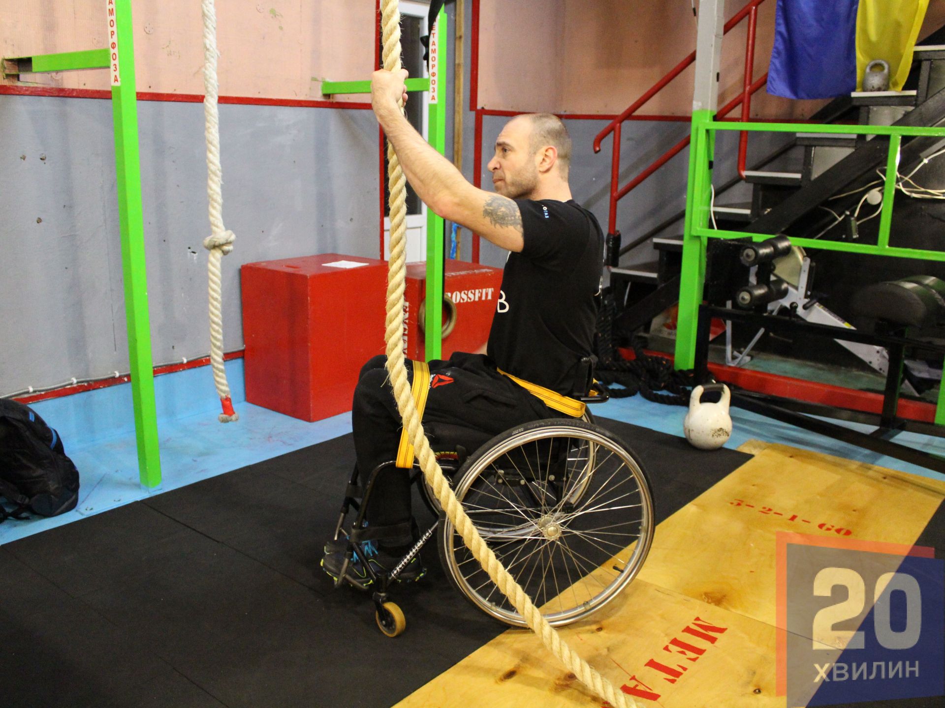 Ми спілкувалися зі Святославом Олійником під час його тренувань. Він показав одну із вправ, яку готує до змагань. Чоловік легко піднімається догори по канату разом з інвалідним візком.