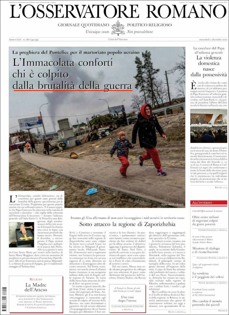 Ватикан «L osservatore romano»: — «Молитва Понтифіка про страждає український народ, чиє благополуччя зруйноване жорстокостями війни»