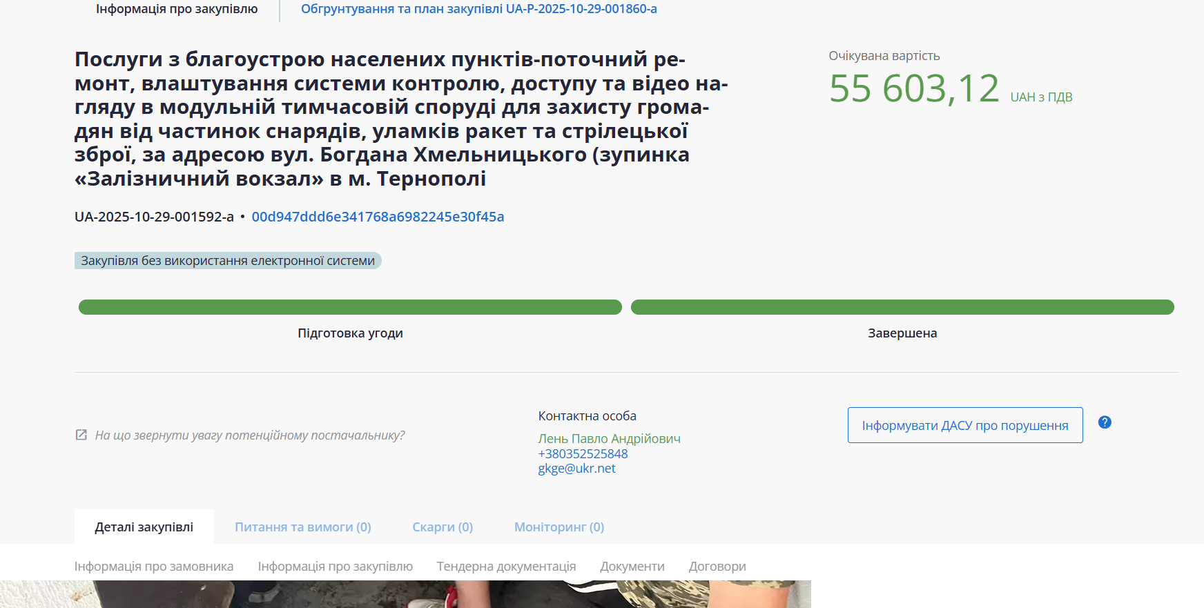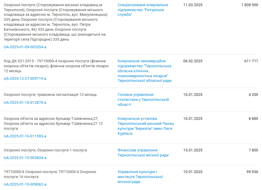 На це мають витратити 55 603 грн. Договір уклали з ТзОВ «Максима-Т». Компанія, як свідчать дані аналітичної платформи YouControl, зареєстрована з 2002 року та займається охоронною діяльністю, обслуговуванням систем безпеки.