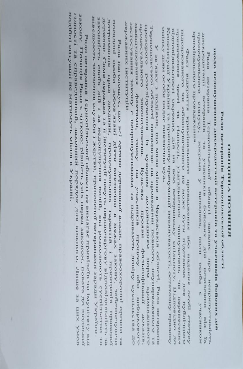 У звʼязку із подіями, що мали місце в Черкаській області, Рада Ветеранів Тернопільської області наполягає на проведенні повного, неупередженого та прозорого розслідування із суровим дотриманням норм кримінального процесуального законодавства. Будь-які прояви фальсифікації доказів,маніпулювання фактами, тиску на учасників процесу або вибіркового застосування Закону є неприпустимими та підриють довіру суспільства до державних інституцій, — озвучив позицію голова Ради ветеранів Тернопільської області Олег Любінський.