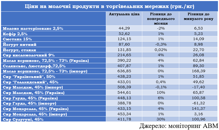 «В січні ціни виросли на 4% і вище на вершкове масло інших вітчизняних брендів жирністю від 72,5% до 73%, на сир кисломолочний, на сири Гауда та Моцарелла порівняно до грудня. Вірогідно подальше підвищення цін на кисломолочну продукцію, тверді та напівтверді сири, вершкове масло, оскільки проблема дефіциту молока-сировини в Україні нікуди не зникла. Попри те, що у 2023 році молочно-товарні ферми вийшли за обсягами надоїв на довоєнні рівні, їх потужності все одно не вистачає щоби компенсувати різке скорочення виробництва молока в господарствах населення», — йдеться в повідомленні.