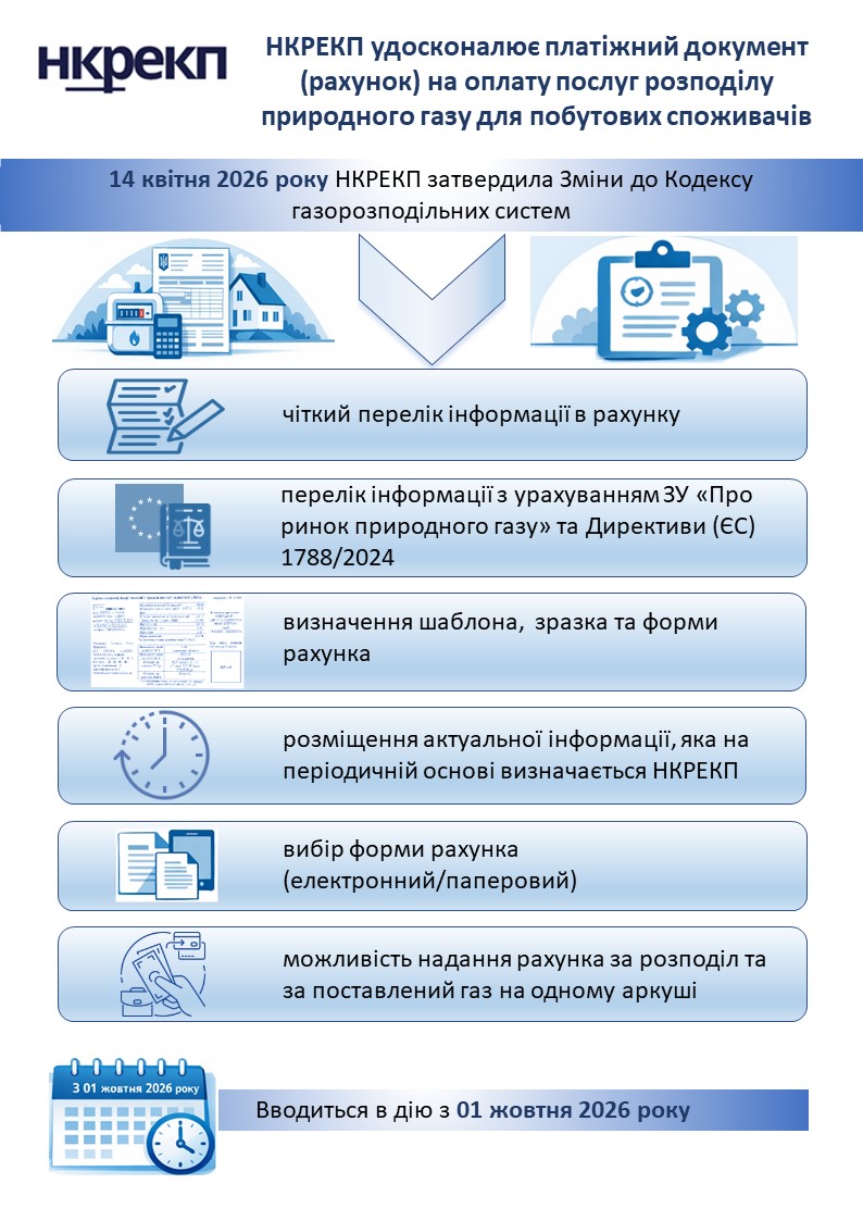 - Єдина квитанція: З 1 жовтня 2026 року оператори ГРМ зможуть друкувати рахунки за споживання та розподіл газу на одному аркуші.