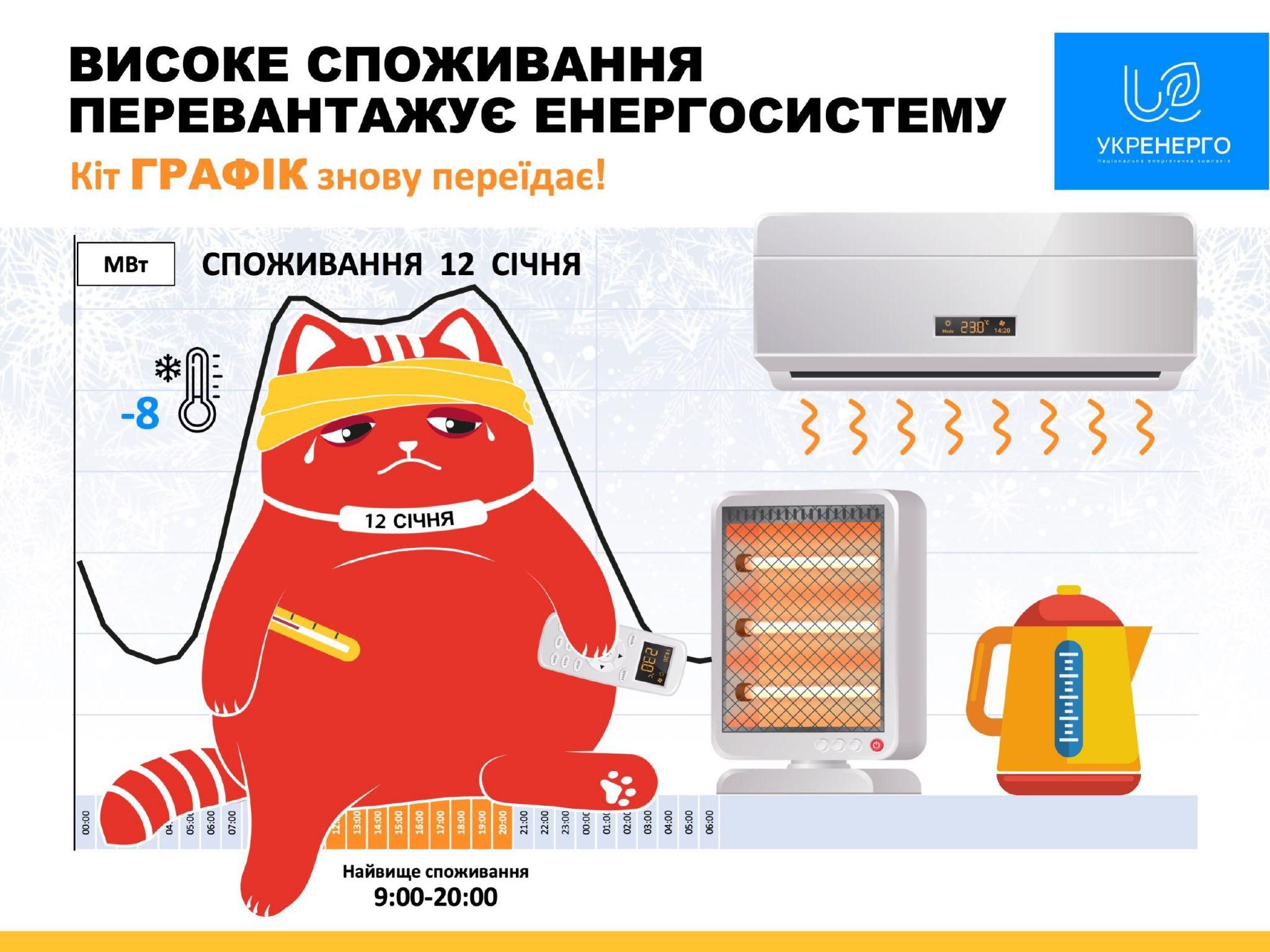 Графік споживання електроенергії у холодну пору року в компанії візуально порівняли з котом. Його вушка – це піки споживання, коли енергосистема найбільше потерпає від перенавантаження. Проміжок між вухами – зменшення споживання вдень.