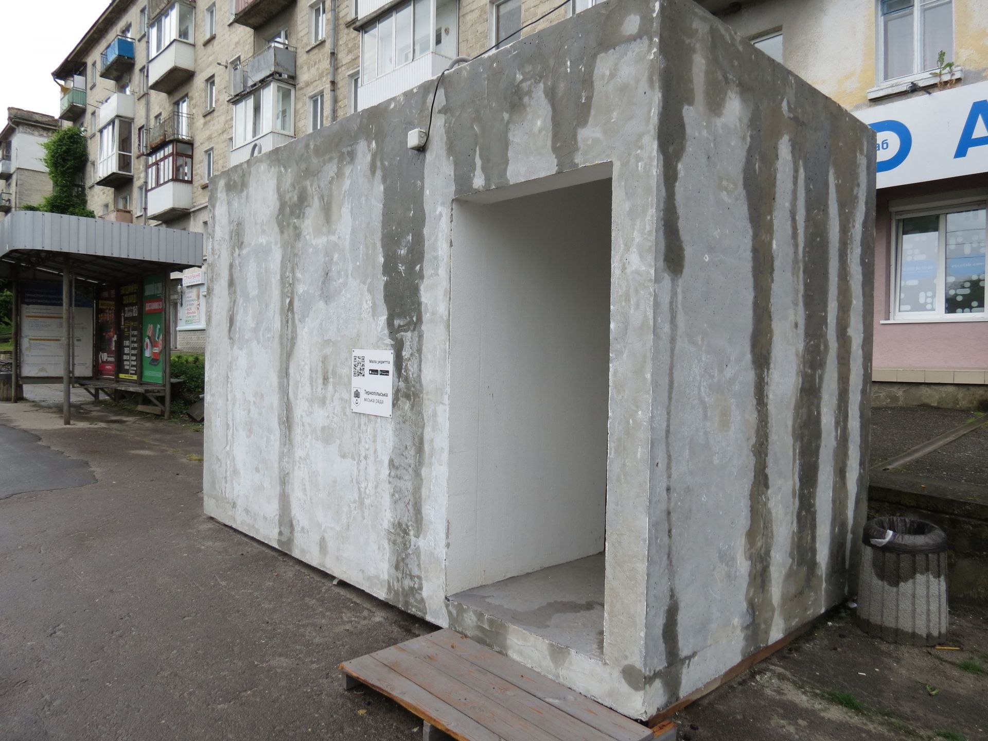 В цьому укритті ми побували близько 11:40. Саме в цей час тривала повітряна тривога. Як ми побачили, тернополяни чекали громадський транспорт на зупинці. Укриття було порожнє.