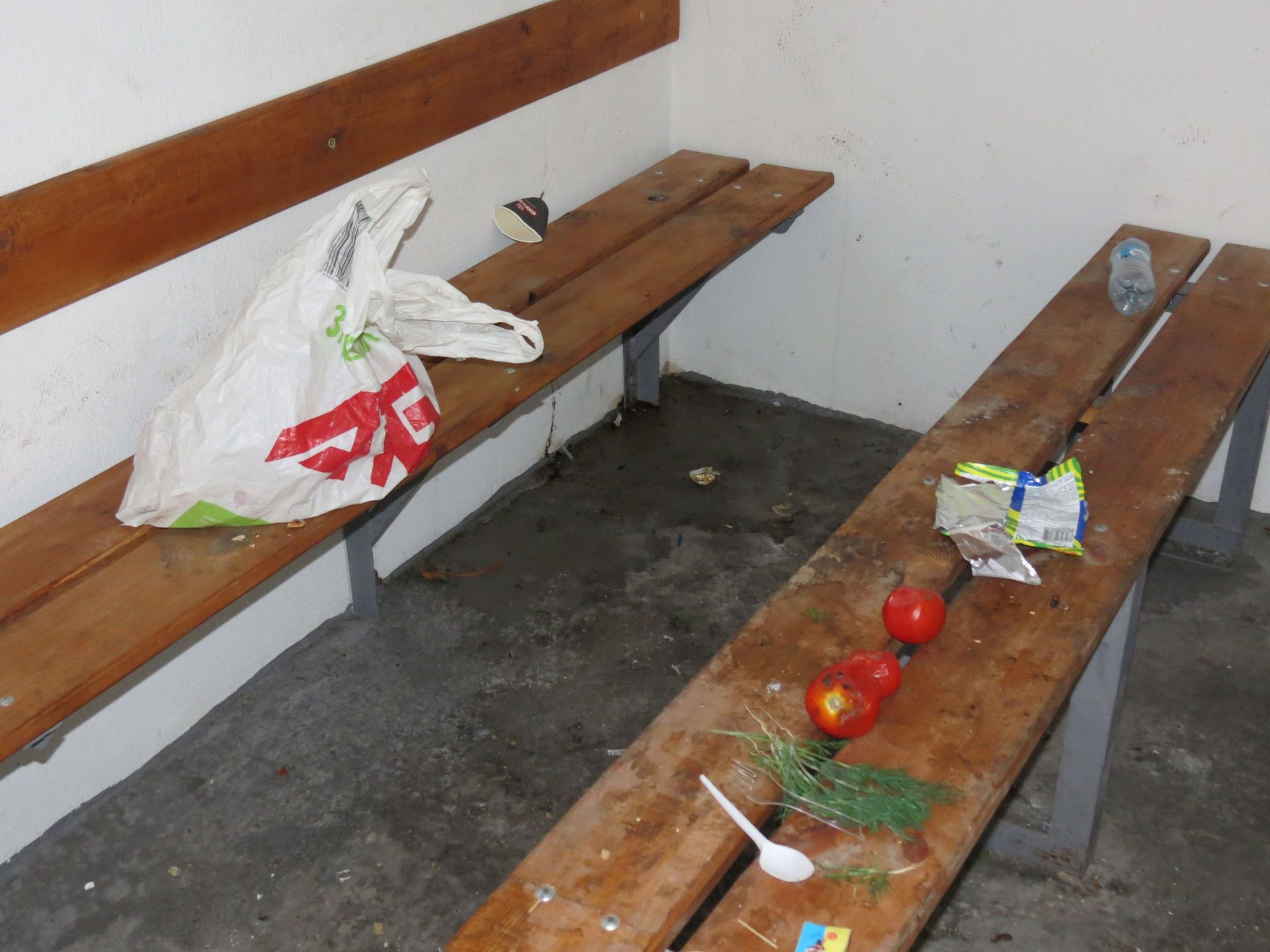 Всередині укриття хтось влаштував «застілля». Ми побачили купу сміття. З лавки в центрі зробили імпровізований стіл. Там лежали залишки їжі, помідори, кріп, сірники. Були розкидані пакети зі сміттям, коробки з-під цигарок. Вся підлога встелена недопалками. Підлога була брудна та у калюжах.