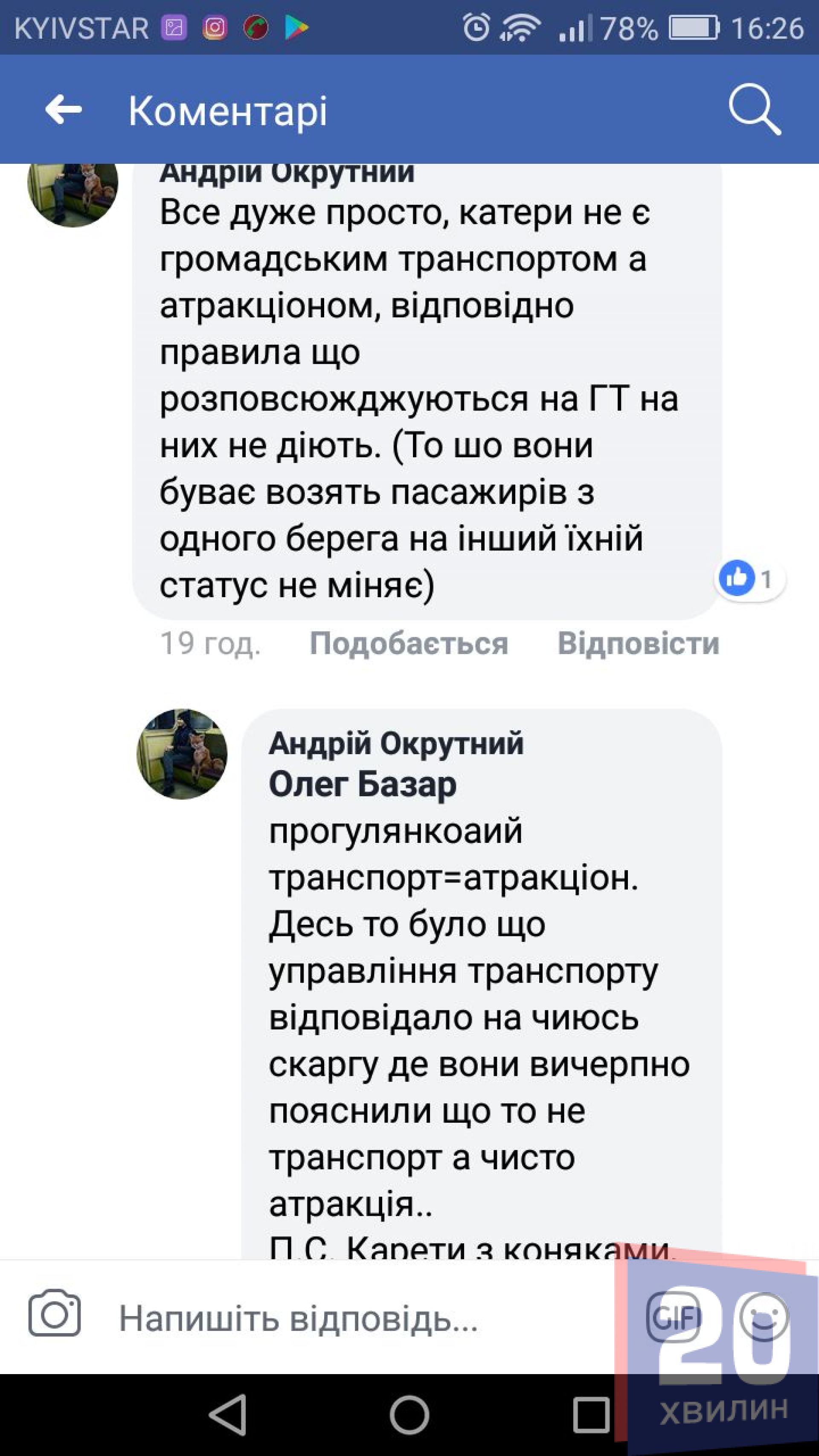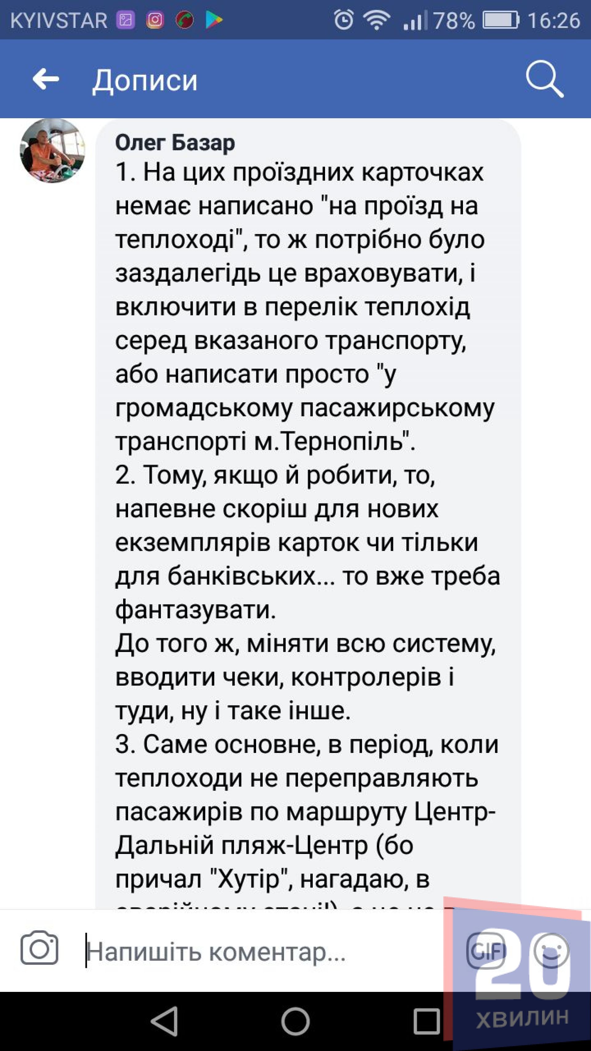 "Кажуть, що тернопільський електротранс ще не всі транспортні засоби, зокрема водні, обладнав валідаторами для розрахунку за проїзд картою тернополянина чи електронним проїзним, - йдеться в повідомленні в одній з груп у соцмережі facebook. - Питання: чому місцяни мають платити на карман матросам стільки ж, як неприписані з села?!"