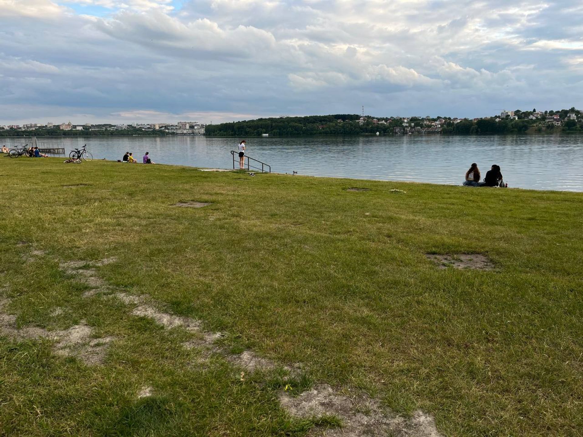 На перевірку пляжу журналісти нашого медіа прибули третього червня о 19.55. Десятки людей ми помітили у воді та на узбережжі. На території пляжу піску майже немає, переважно трава.