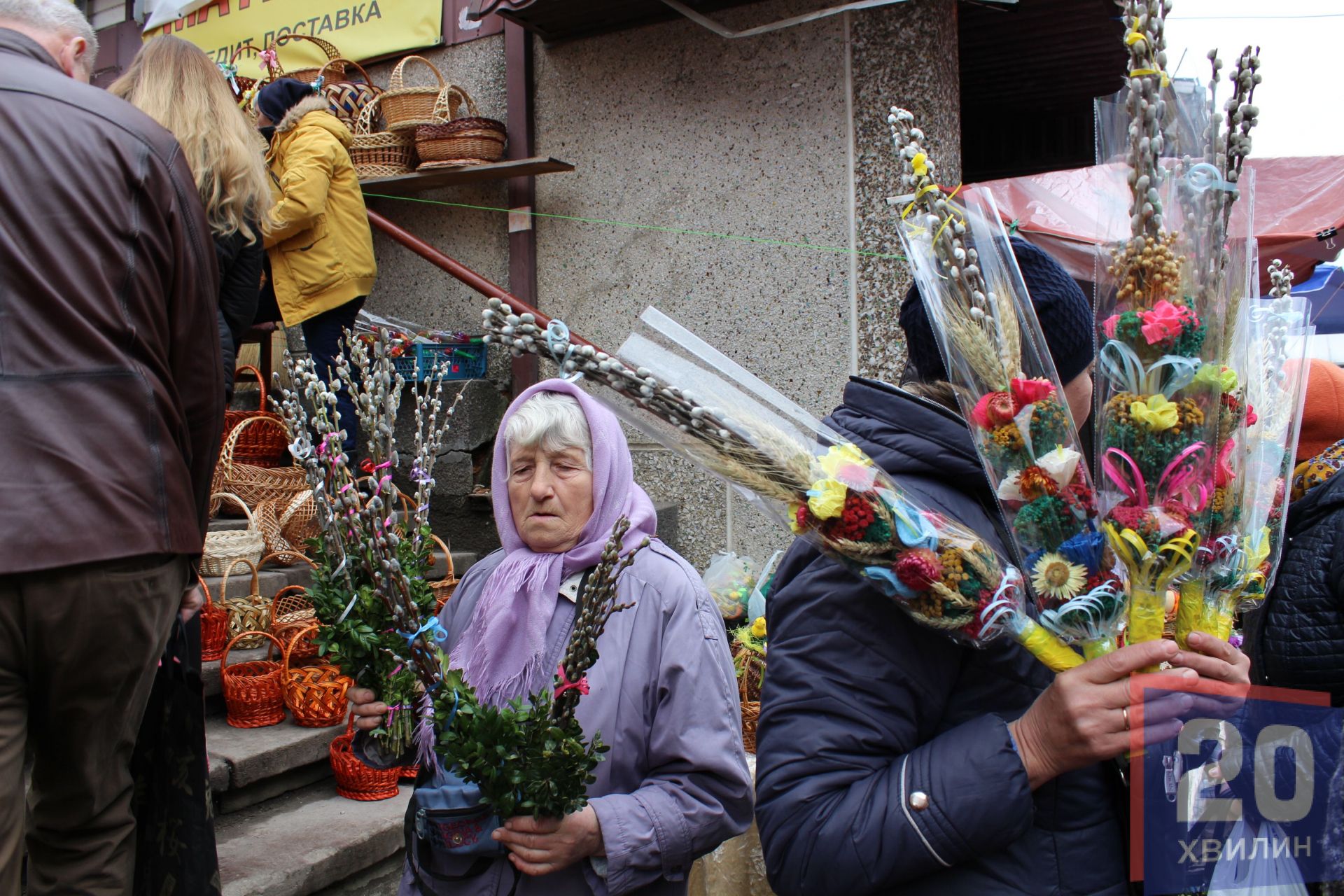 Біля кошиків продають і вербу, яку святять у Вербну неділю. Продавці пропонують і окремі гілочки верби, і цілі букети.