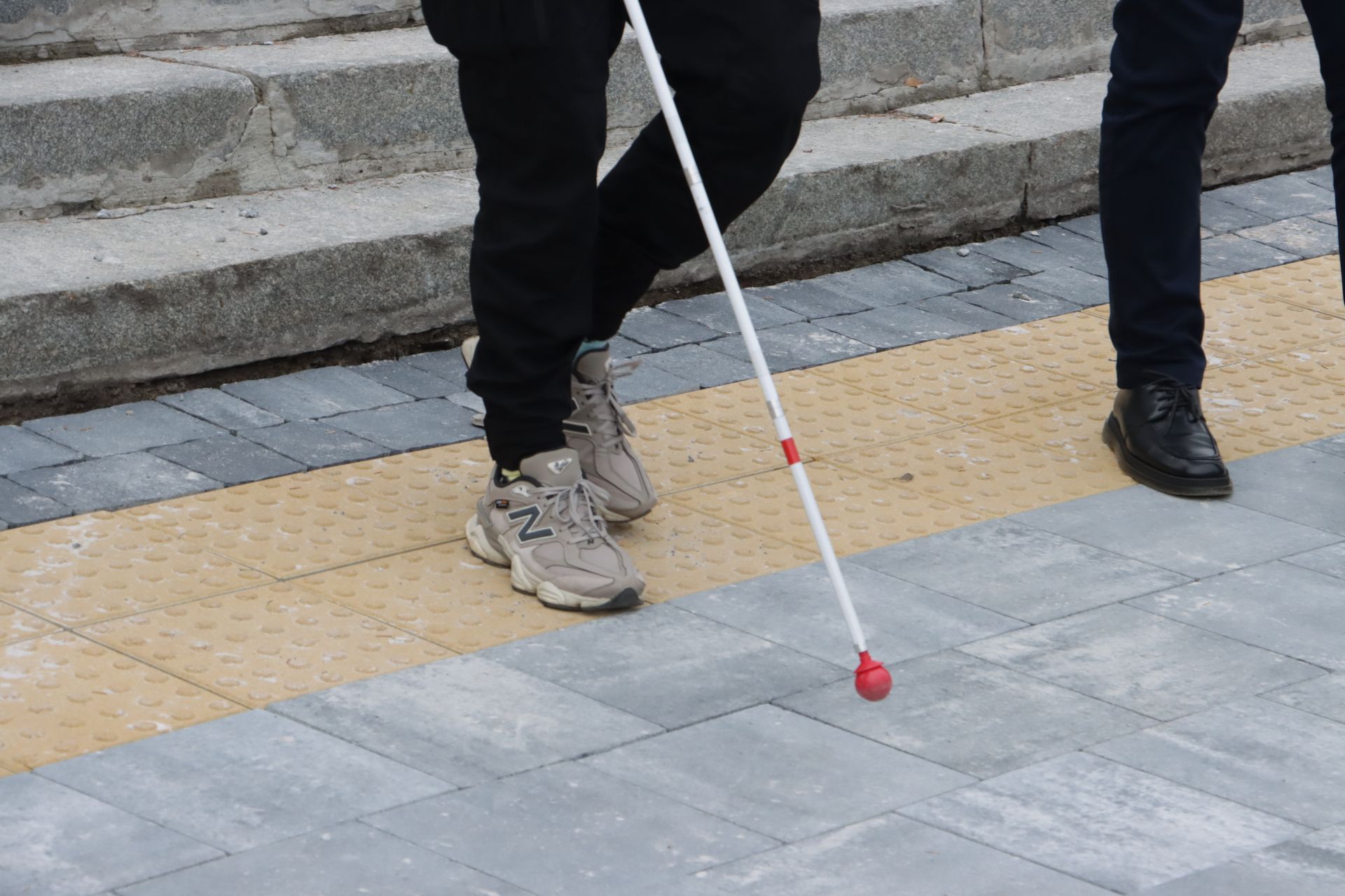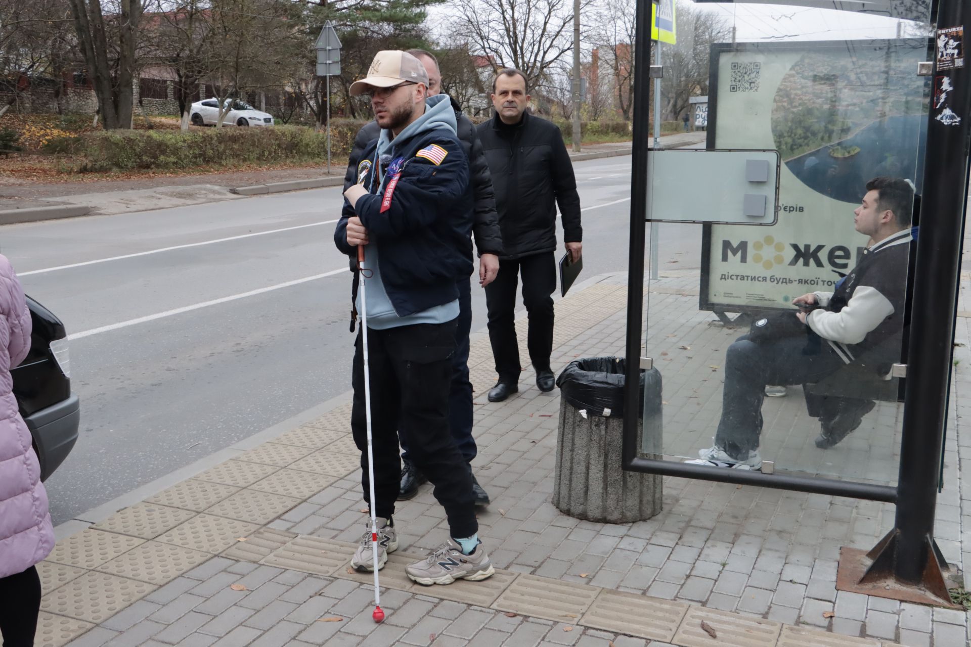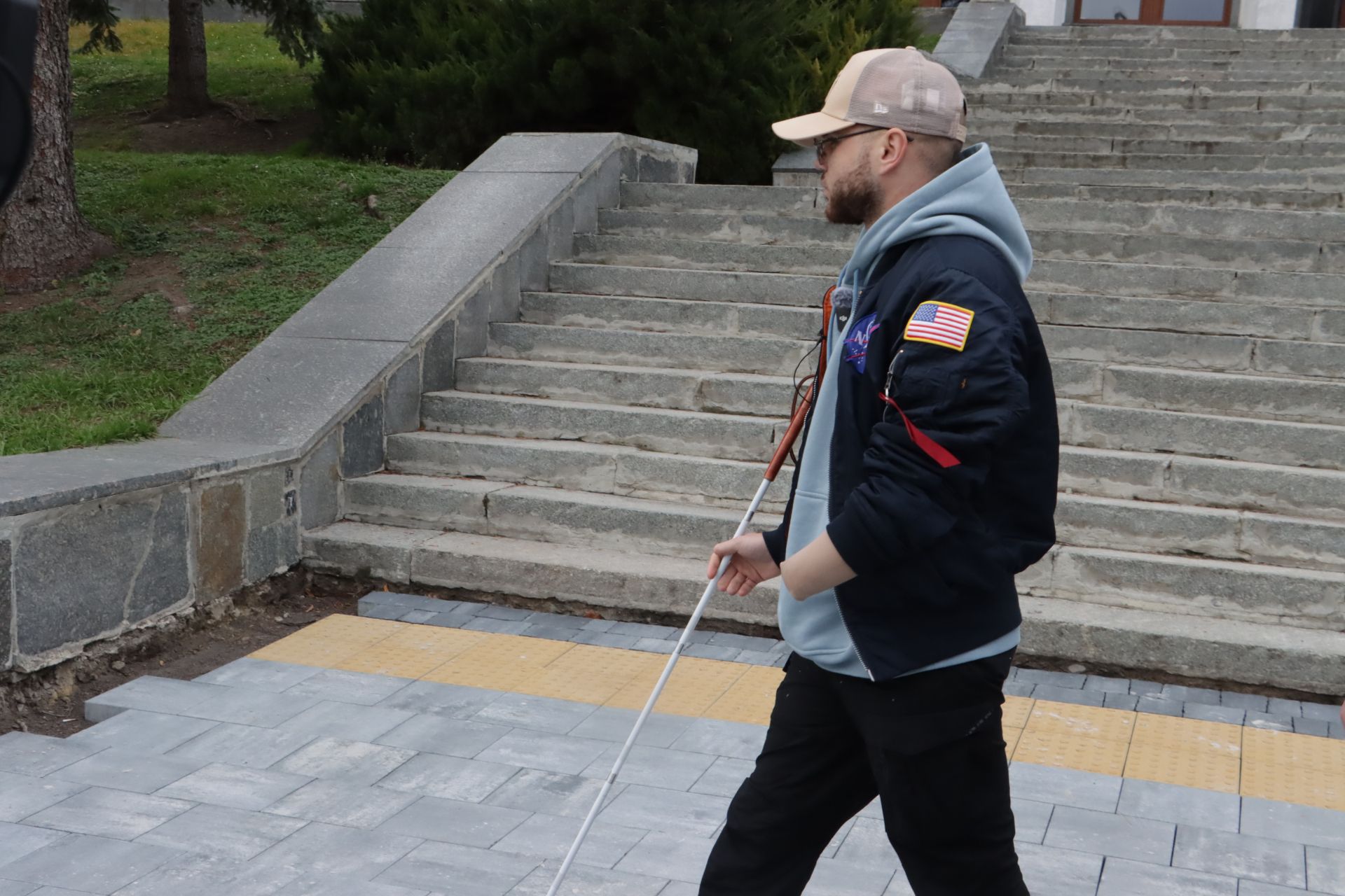 Захисник пересувається зі спеціальною тростиною. Він каже – для людей з порушенням зору вкрай важливо мати орієнтири для безпечного пересування. Це не лише тактильна плитка, а і яскраві кольорові покажчики, звукові системи на пішохідних переходах, вказівники зі шрифтом брайля.