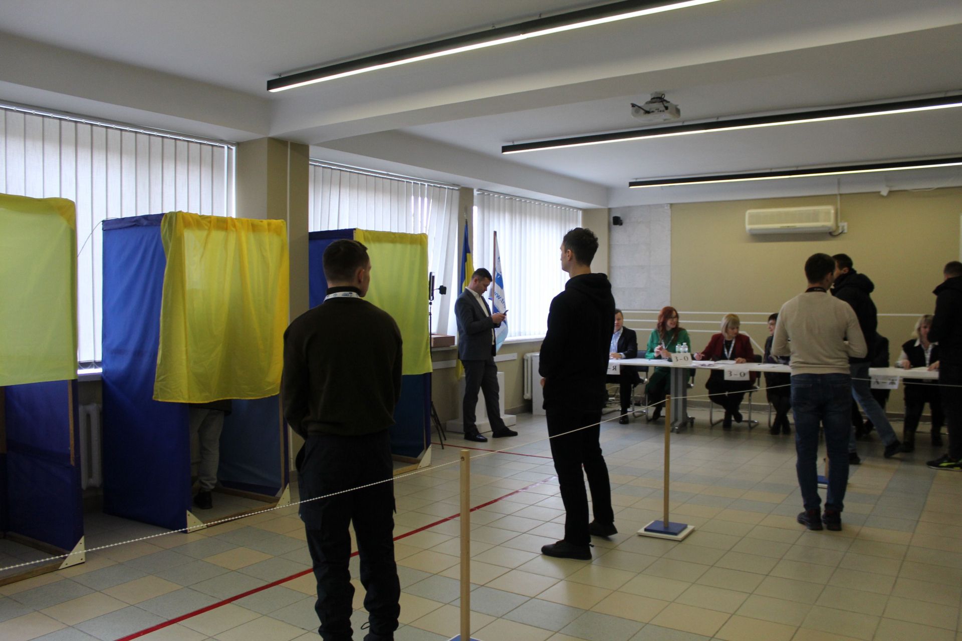 10:50. Повітряна тривога закінчилась, пролунав сигнал про відбій. Перші виборці відразу почали ставити у чергу перед дверима Освітнього Хабу, де відбуватиметься голосування за ректора. За лічений час перед дільницею вже стояло 15-20 осіб. Це здебільшого працівники університету. Всередину нікого не пускали.