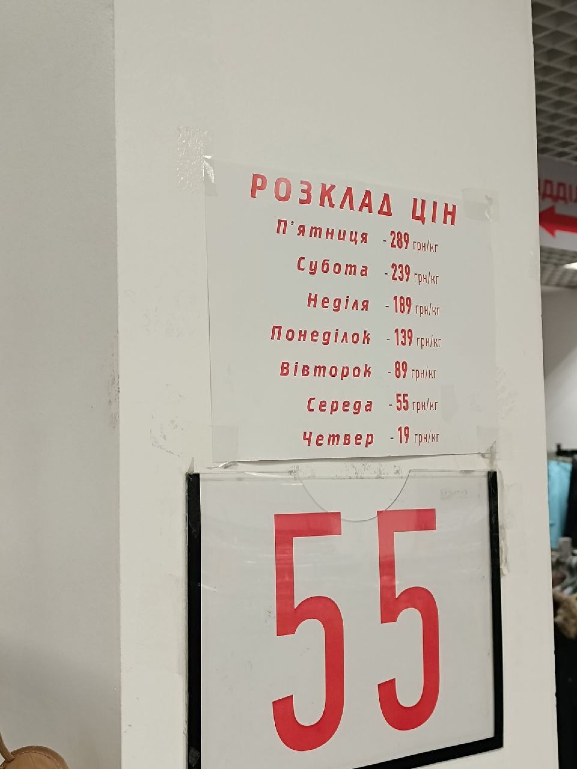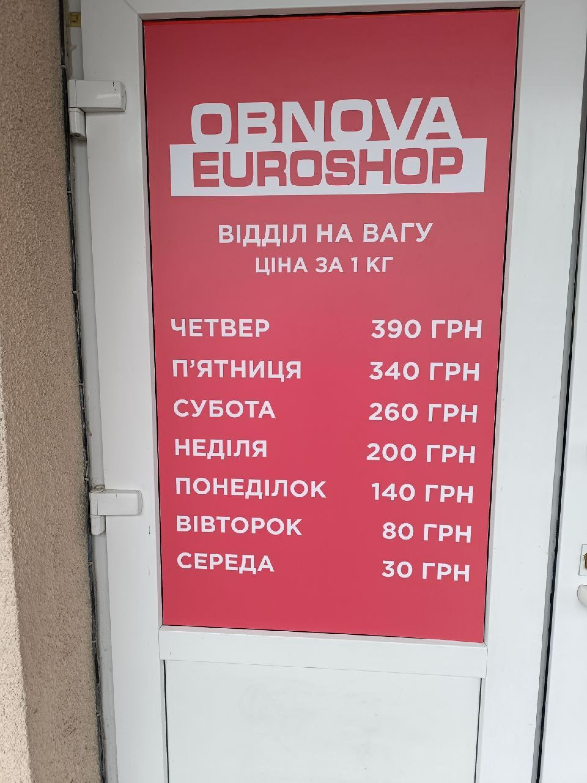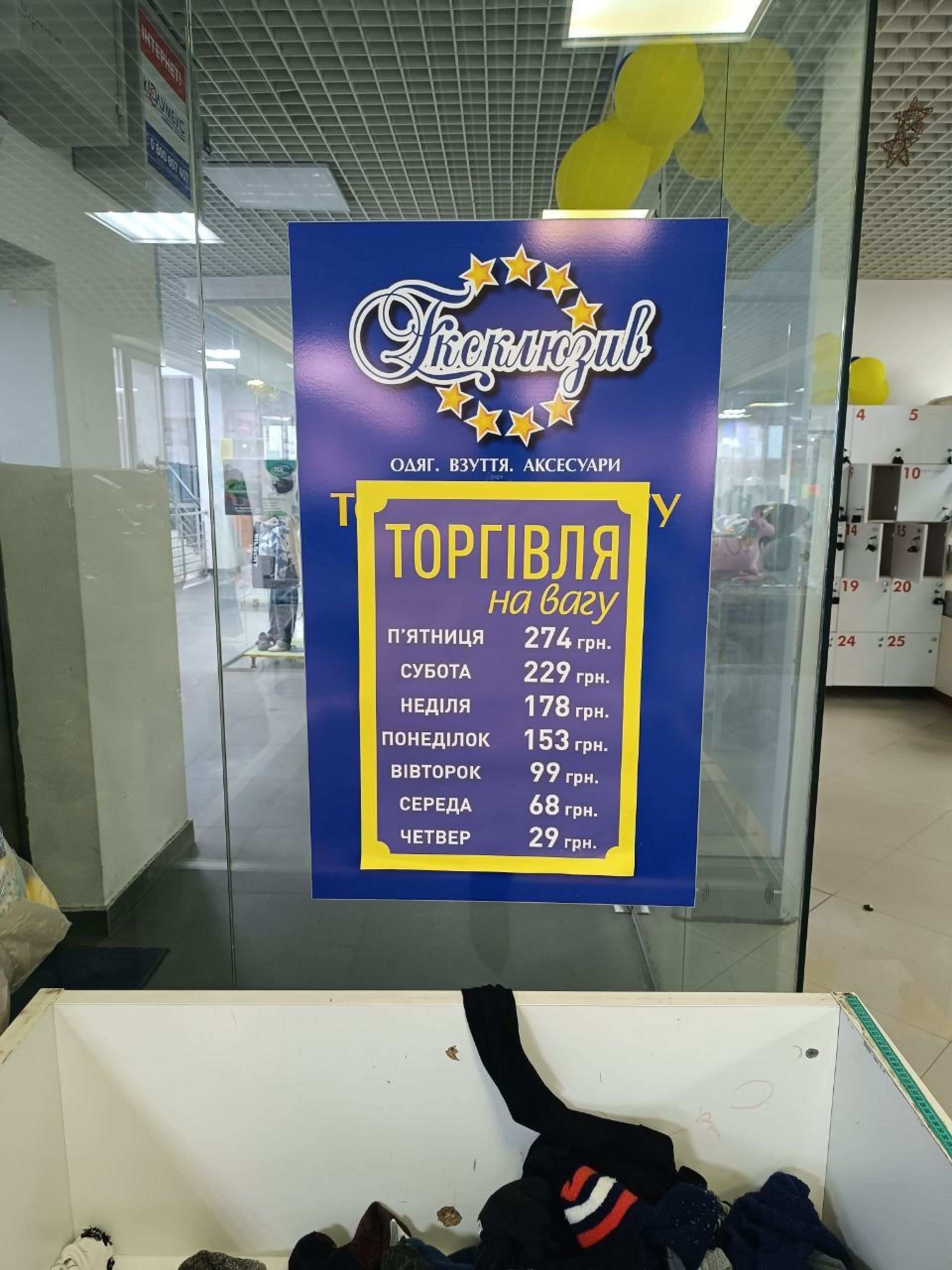 У цьому магазині продають різний одяг та взуття на вагу. Взуття було в хорошому стані та чисте. Також є нові стокові речі. Наприклад, джинси можна придбати по 200-400 гривень. Футболки в середньому по 150-200 грн. Шторки примірочних не просвічуються. Можна купити різну побутову техніку та навіть меблі. Вони мають фіксовані ціни. Наприклад, на прилавку був аерогриль за 10000 грн, шафа за 2100 грн, кондиціонер за 8500 грн, а також різні товари для дому, електроінструменти тощо.