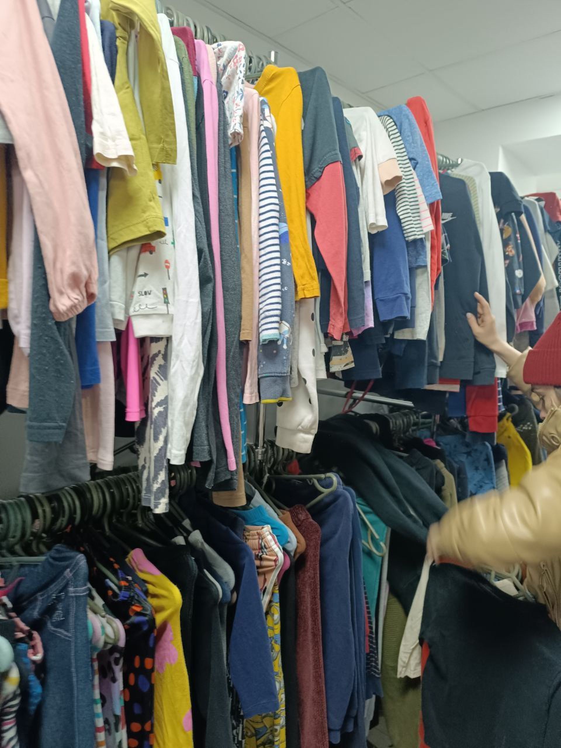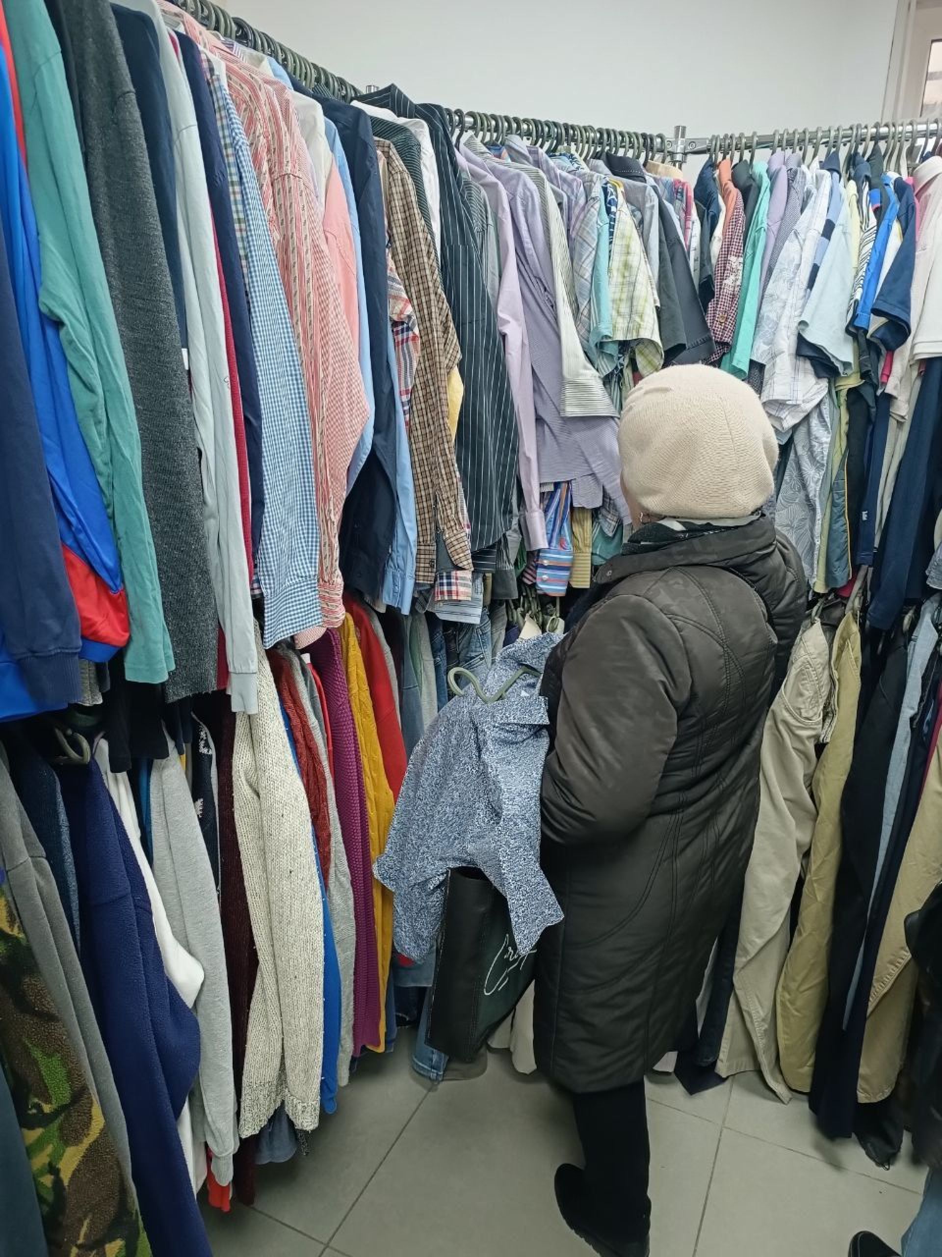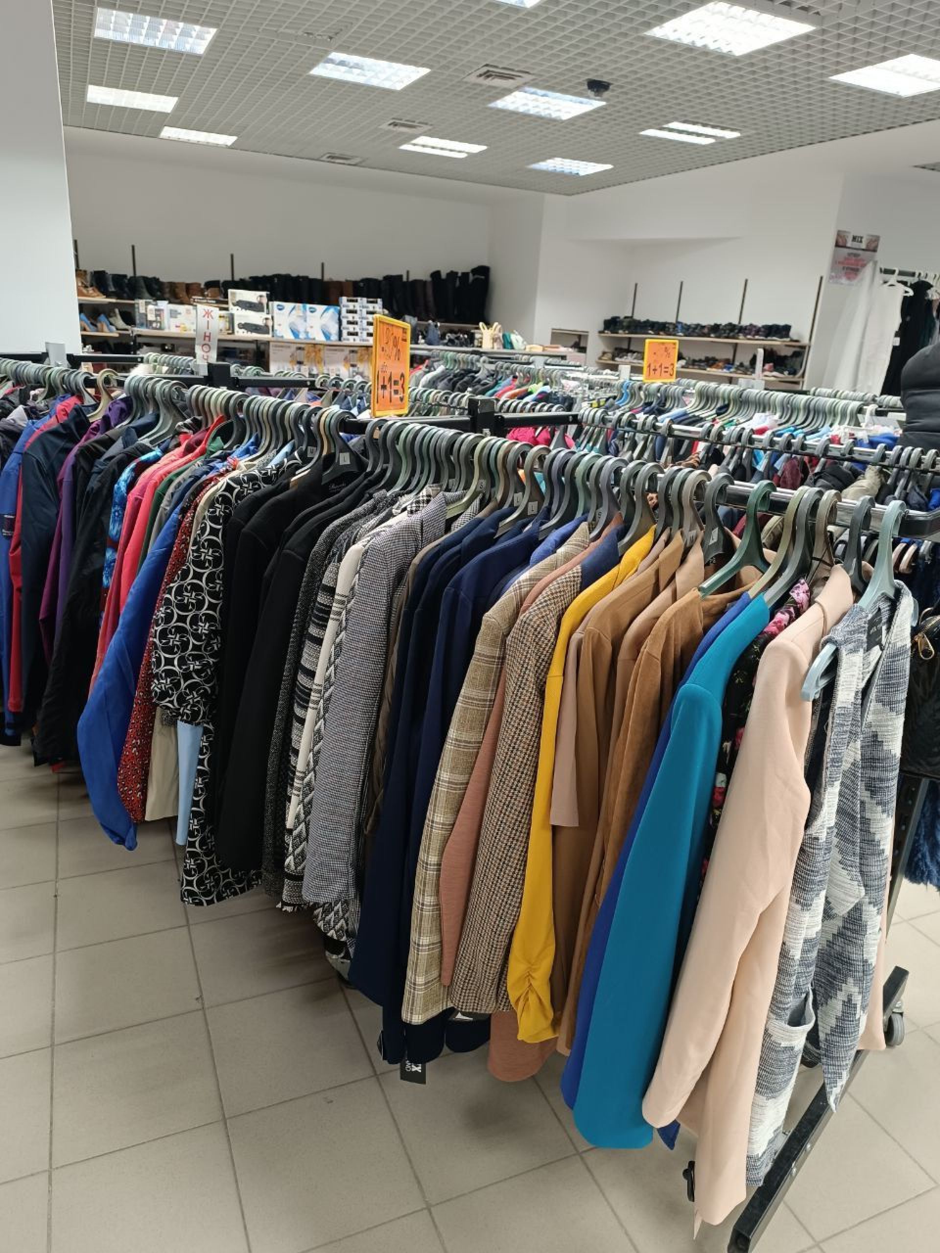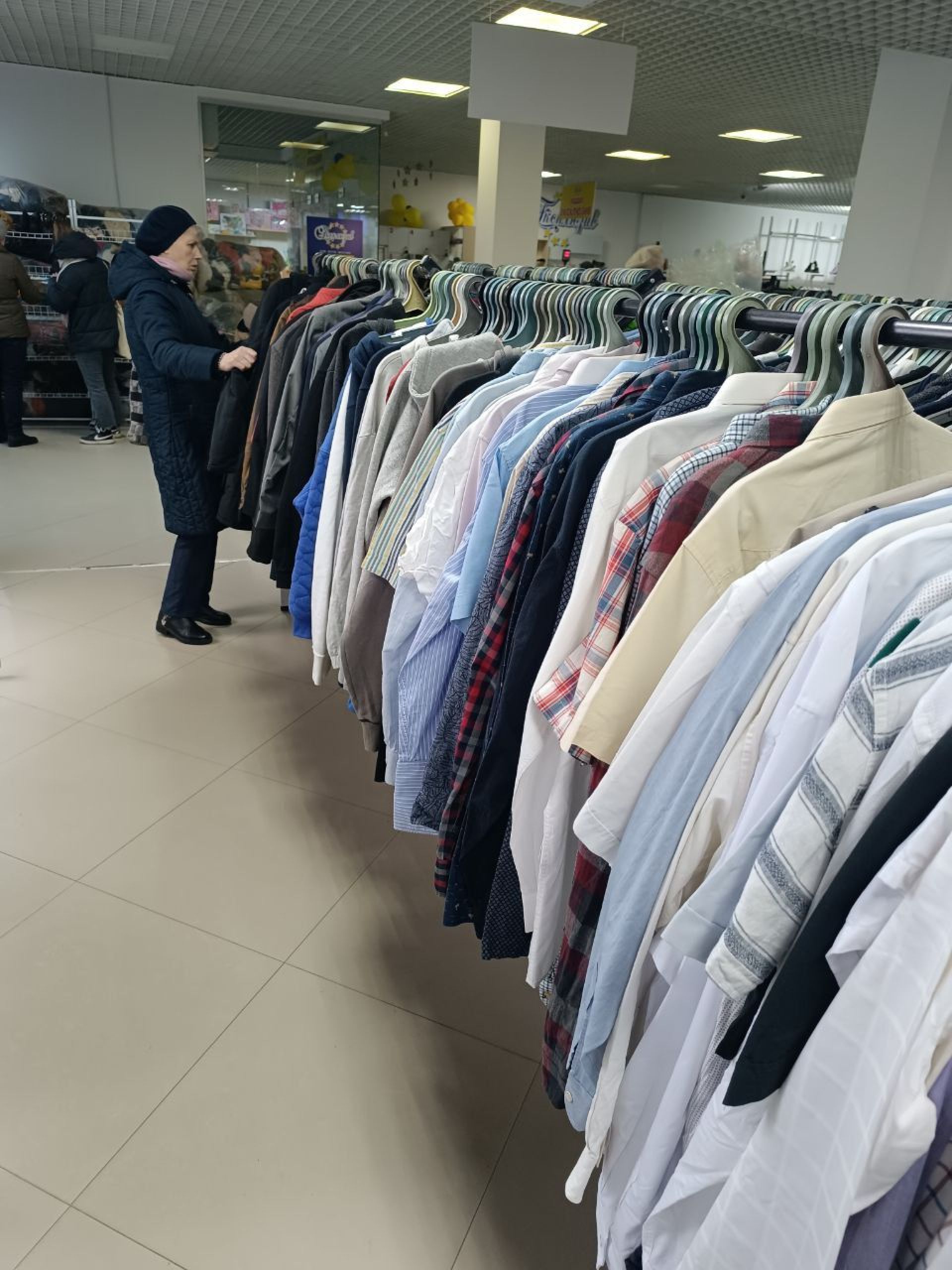 У секонд-хенді є дві категорії речей – звичайні та люкс (на жовтих вішалках). Серед асортименту – одяг, взуття, сумки та рюкзаки, м’які іграшки, постільна білизна, ковдри тощо. У примірочних є шторки з цупкого матеріалу, який не просвічується.