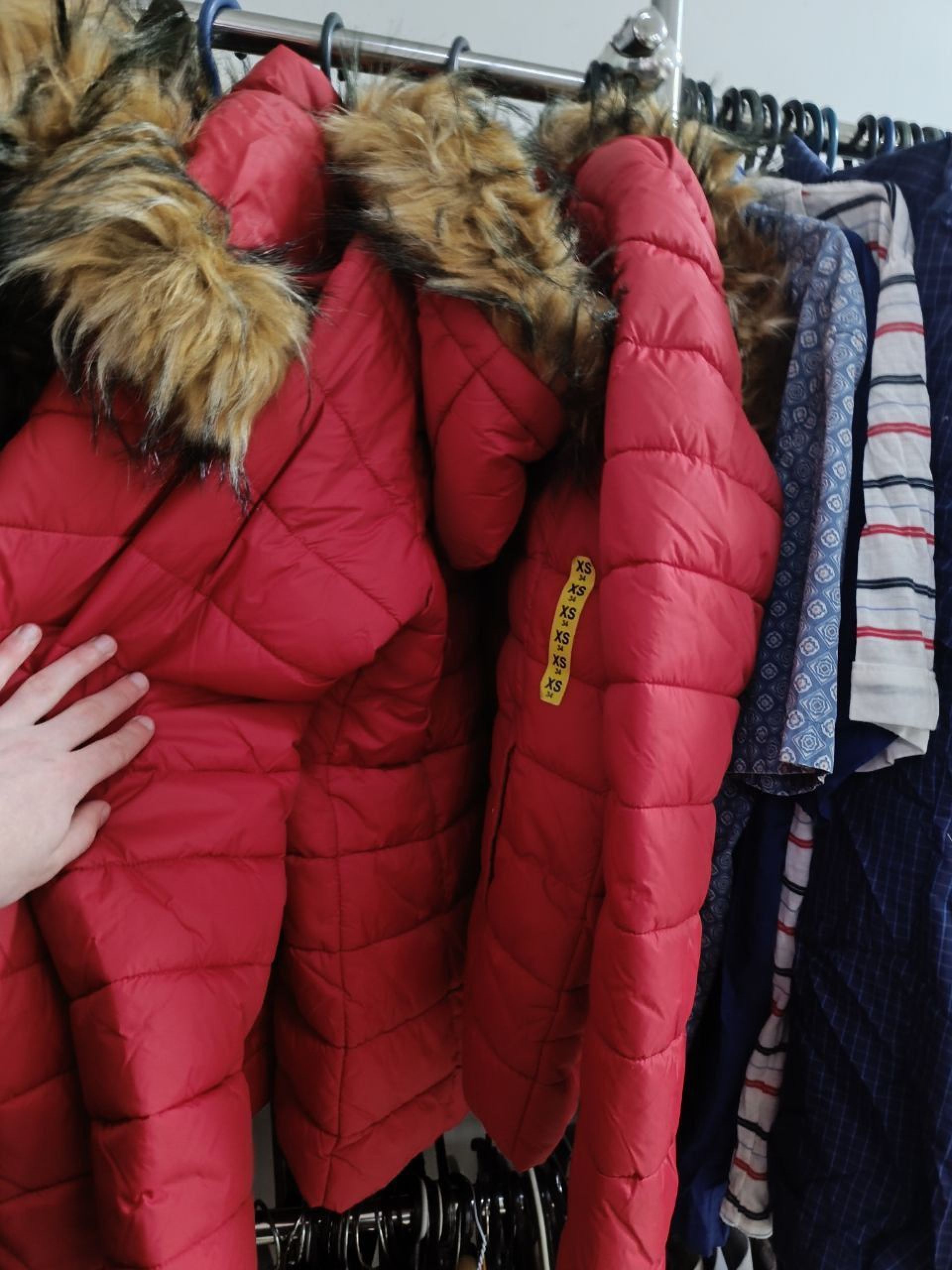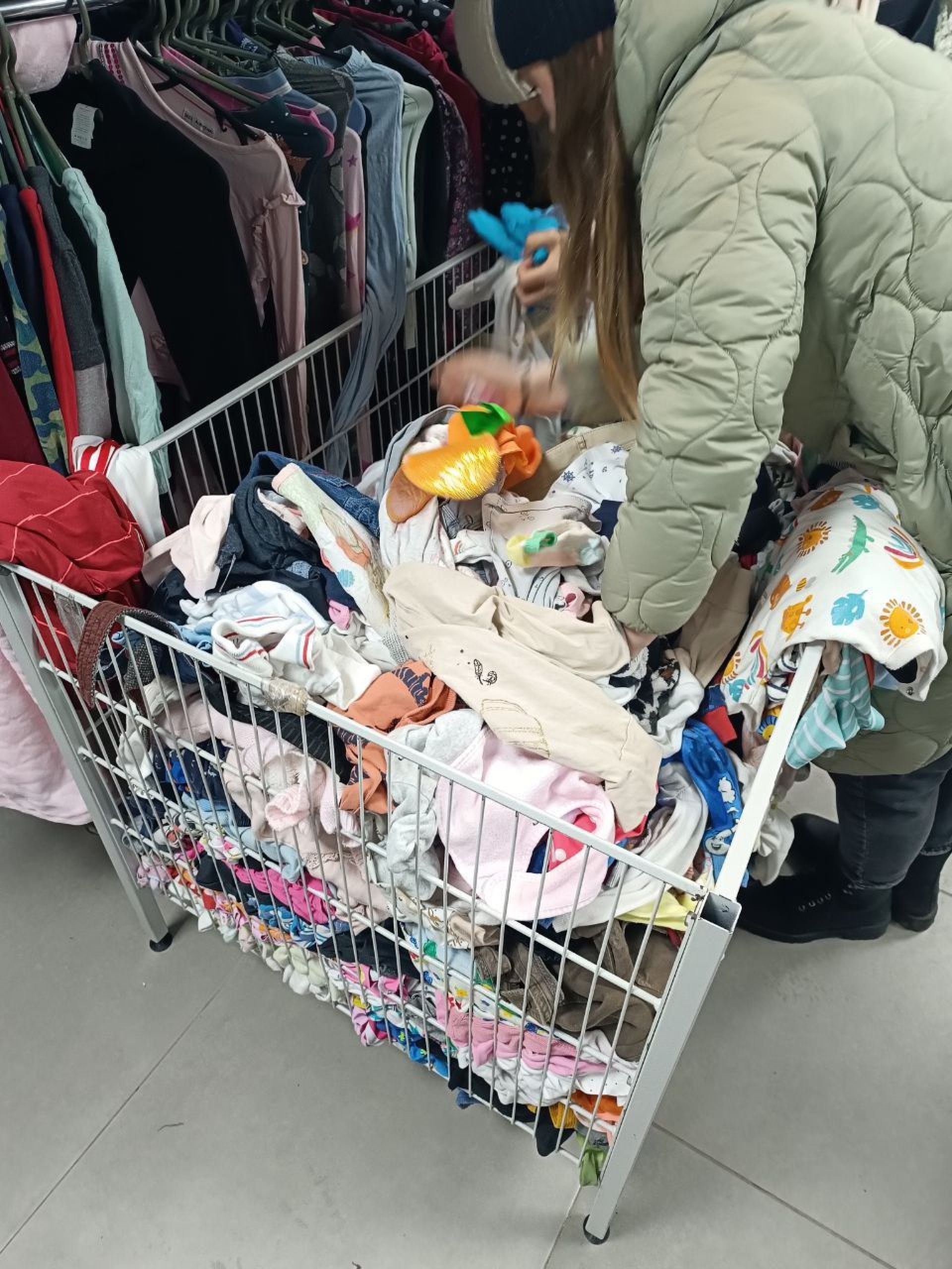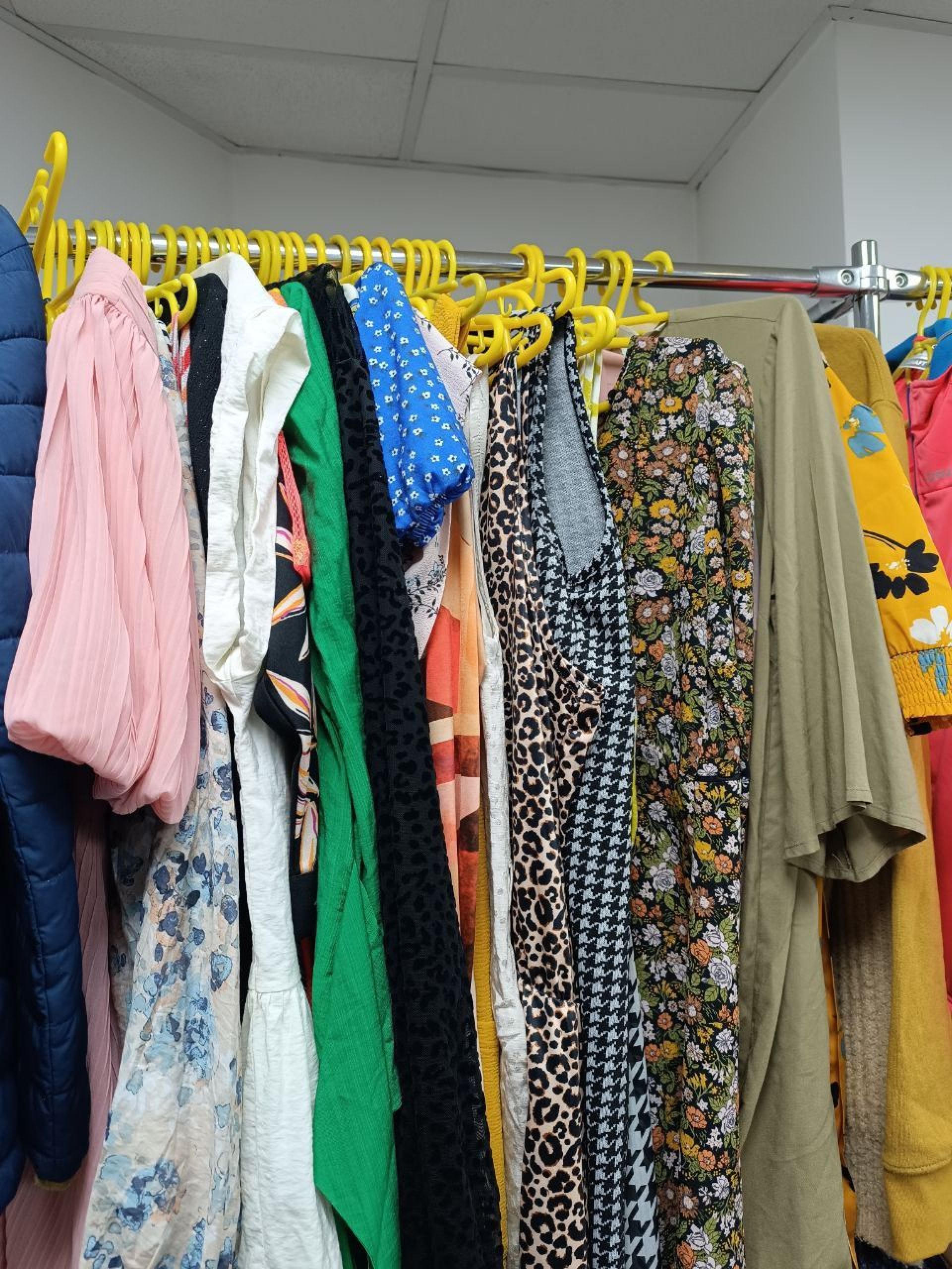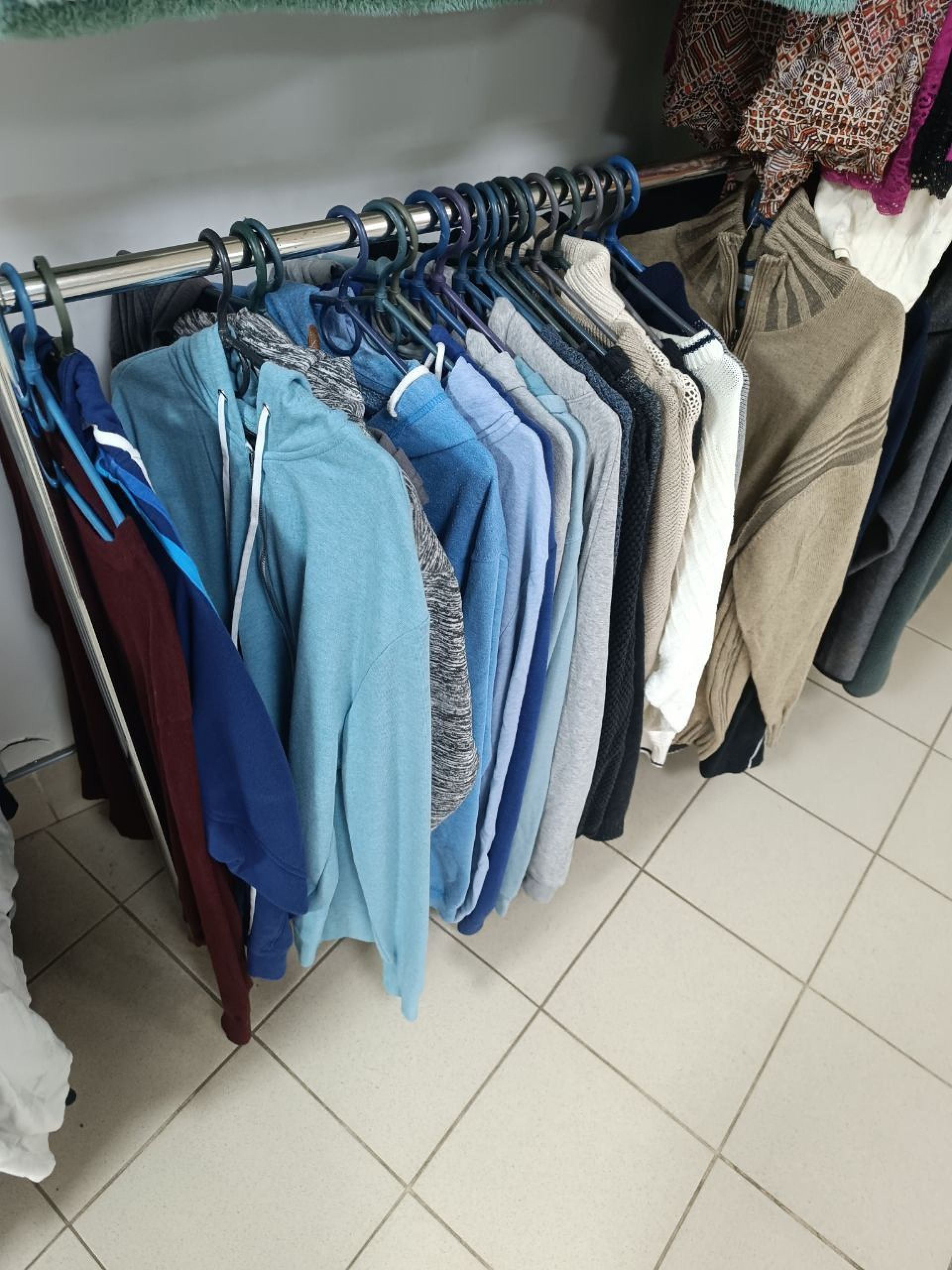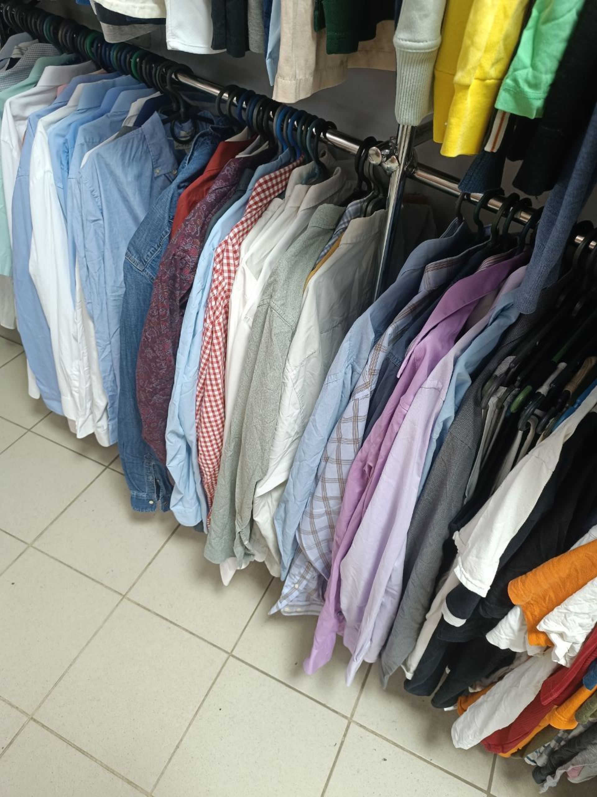 У секонд-хенді є дві категорії речей – звичайні та люкс (на жовтих вішалках). Серед асортименту – одяг, взуття, сумки та рюкзаки, м’які іграшки, постільна білизна, ковдри тощо. У примірочних є шторки з цупкого матеріалу, який не просвічується.