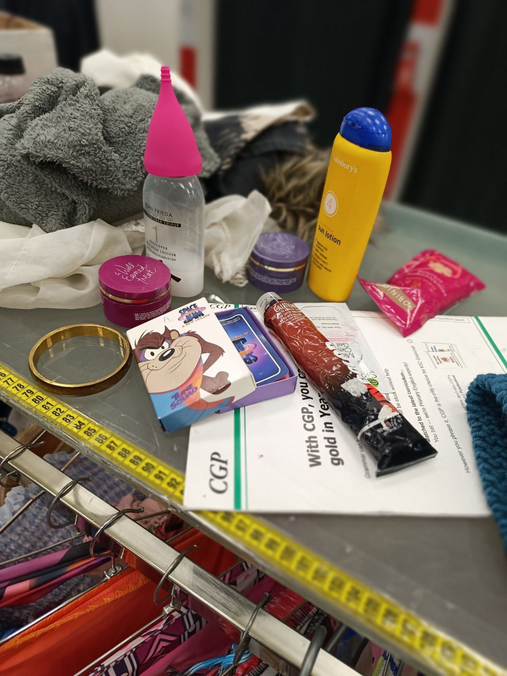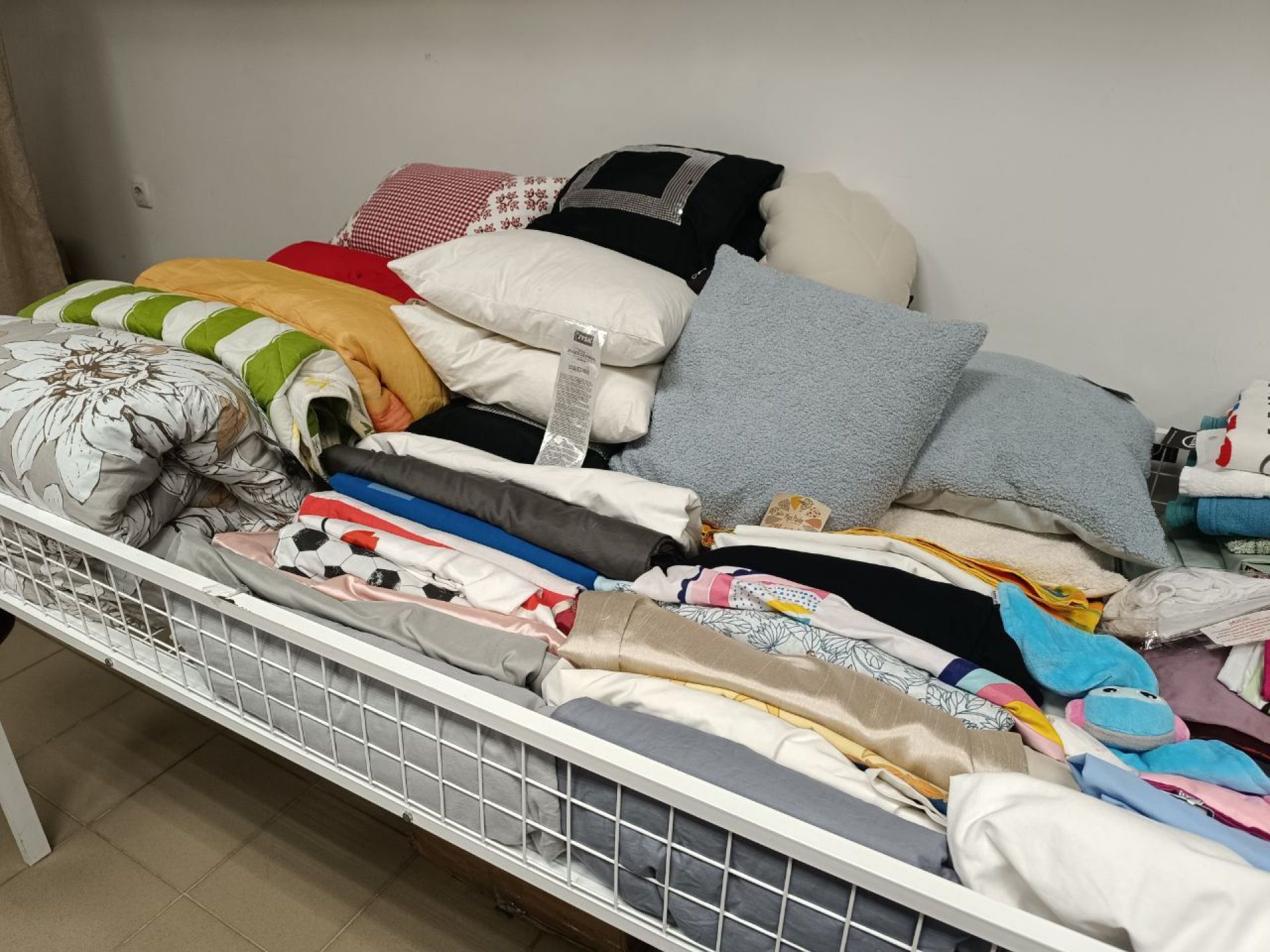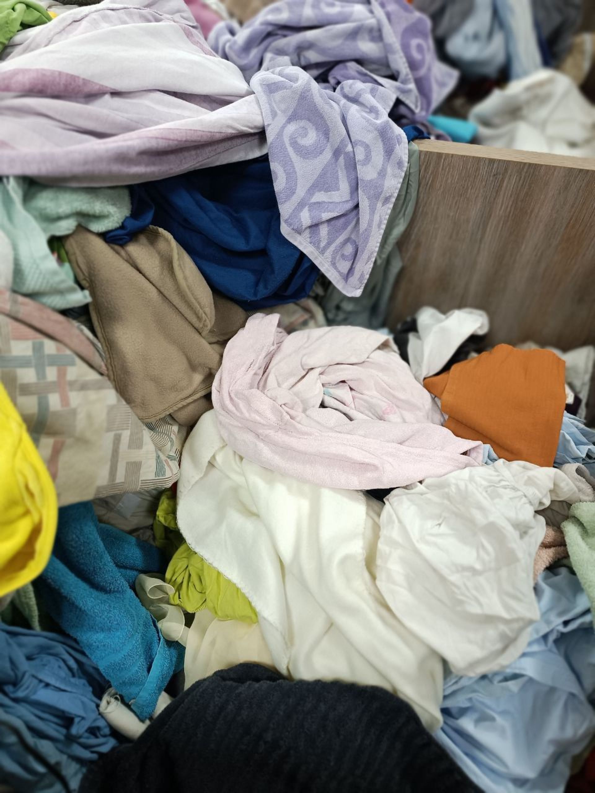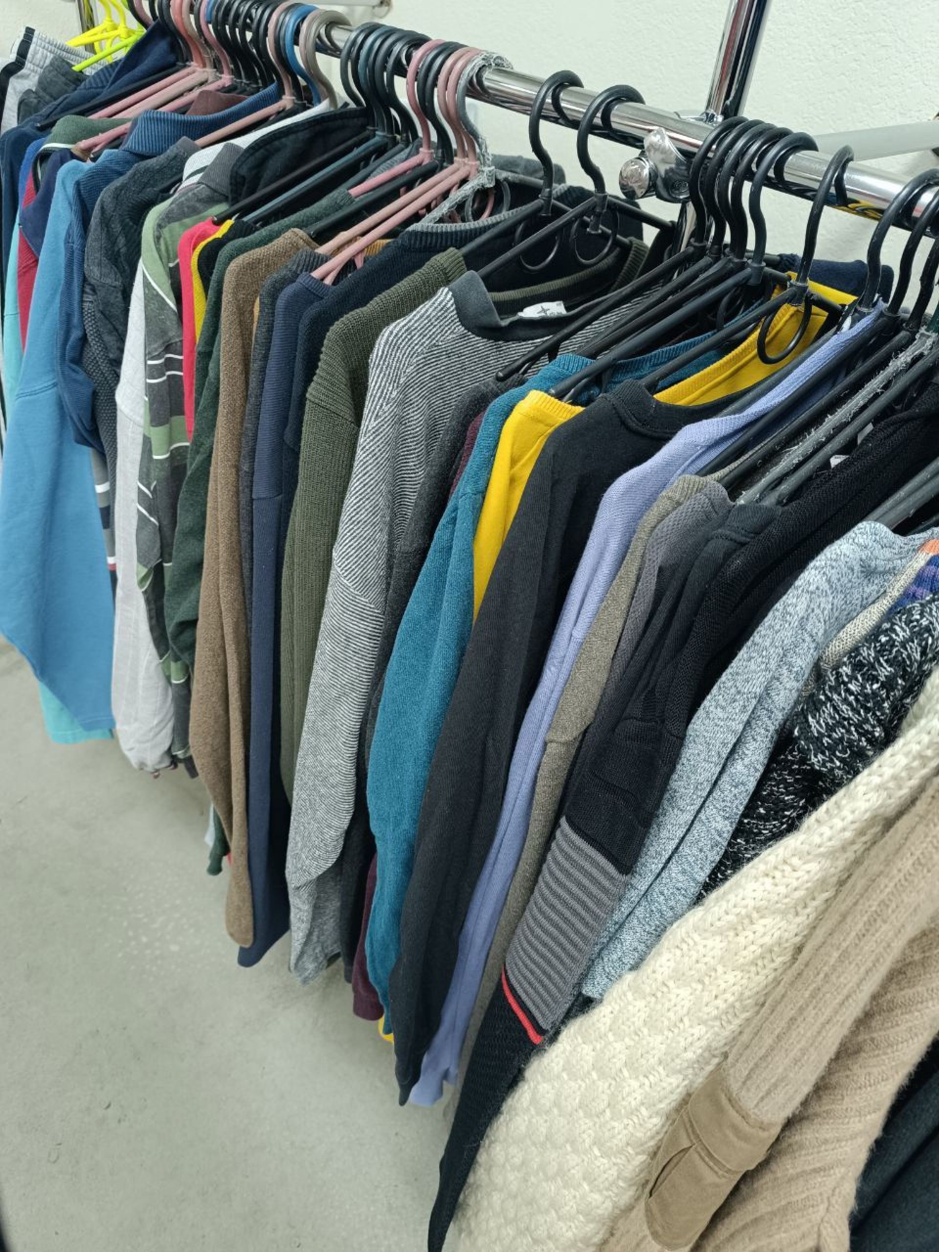 У секонд-хенді є дві категорії речей – звичайні та люкс (на жовтих вішалках). Серед асортименту – одяг, взуття, сумки та рюкзаки, м’які іграшки, постільна білизна, ковдри тощо. У примірочних є шторки з цупкого матеріалу, який не просвічується.