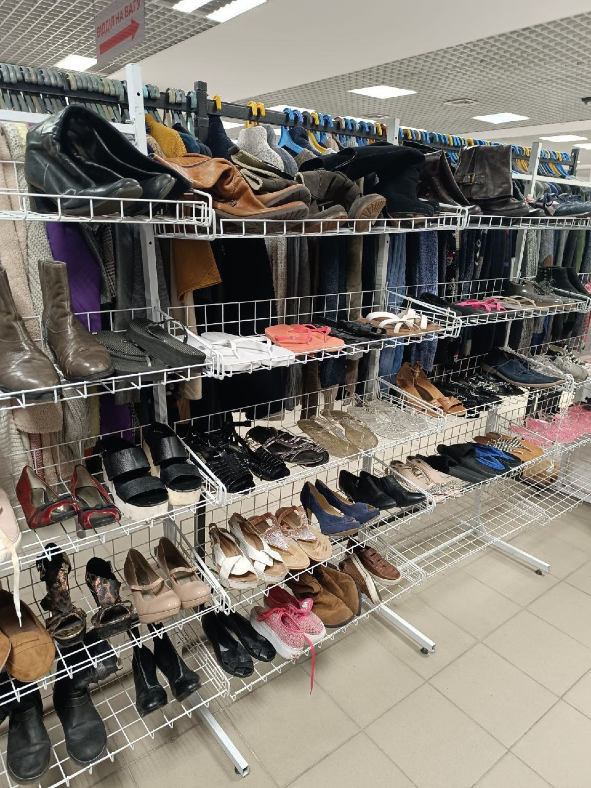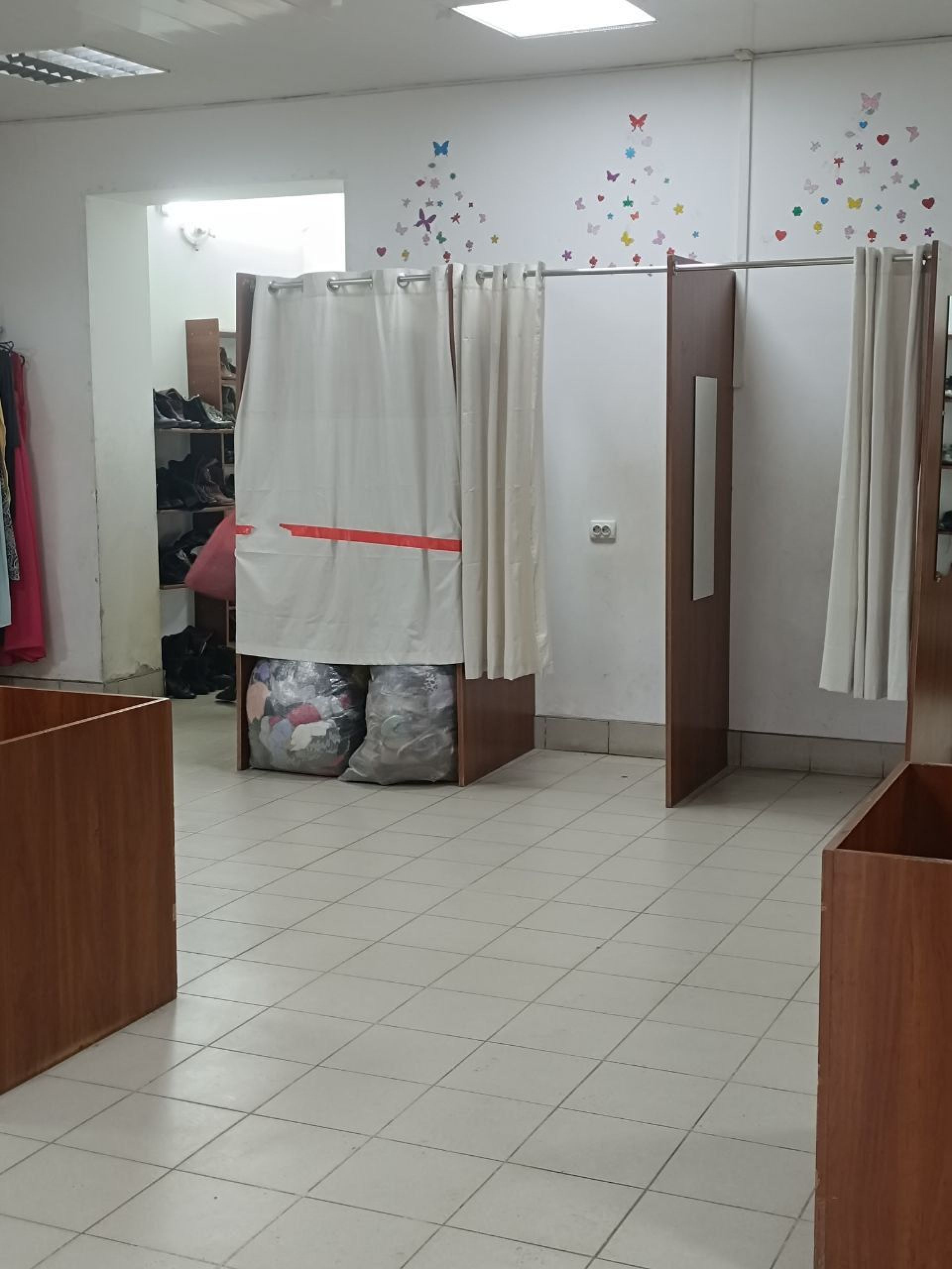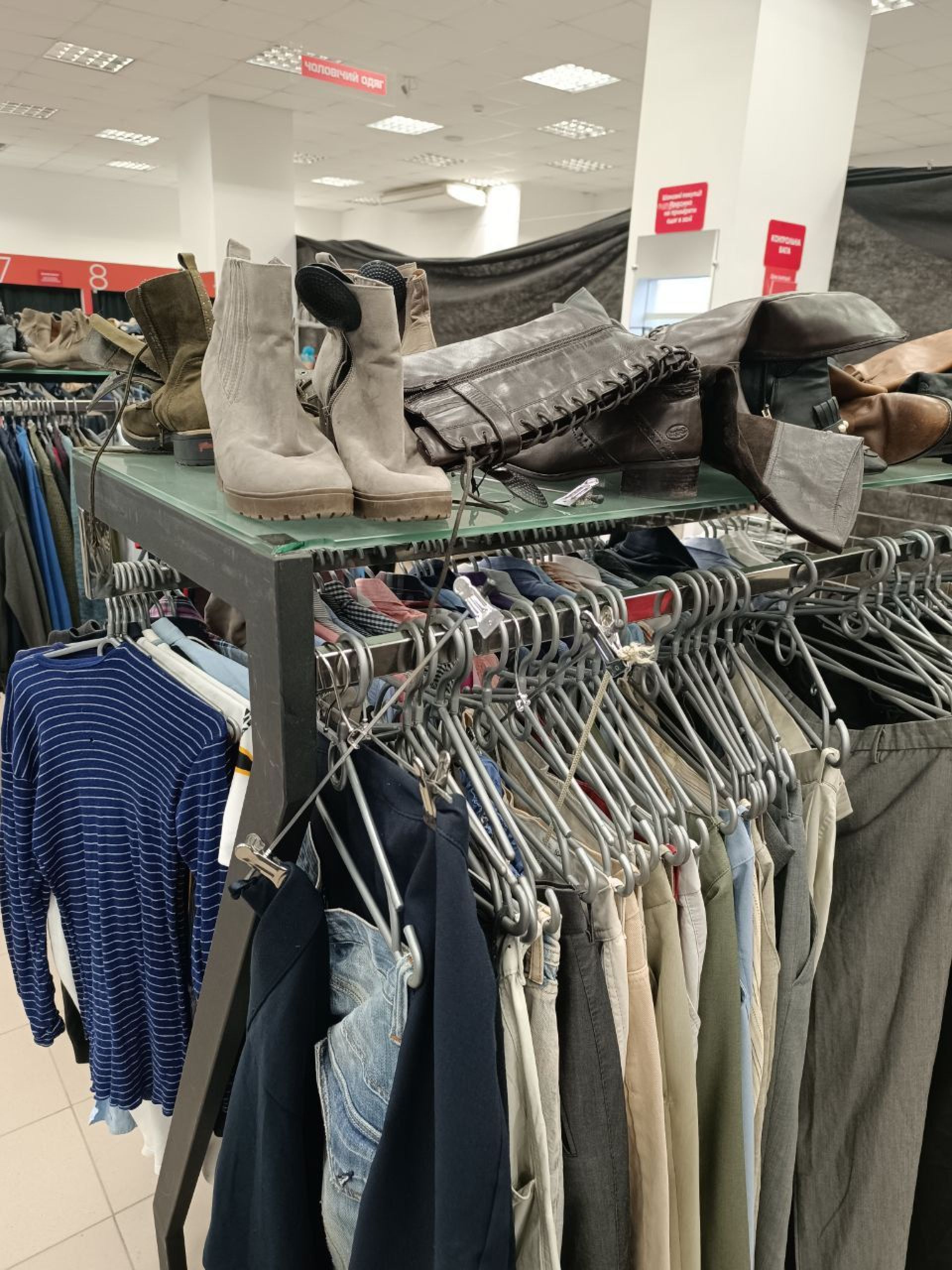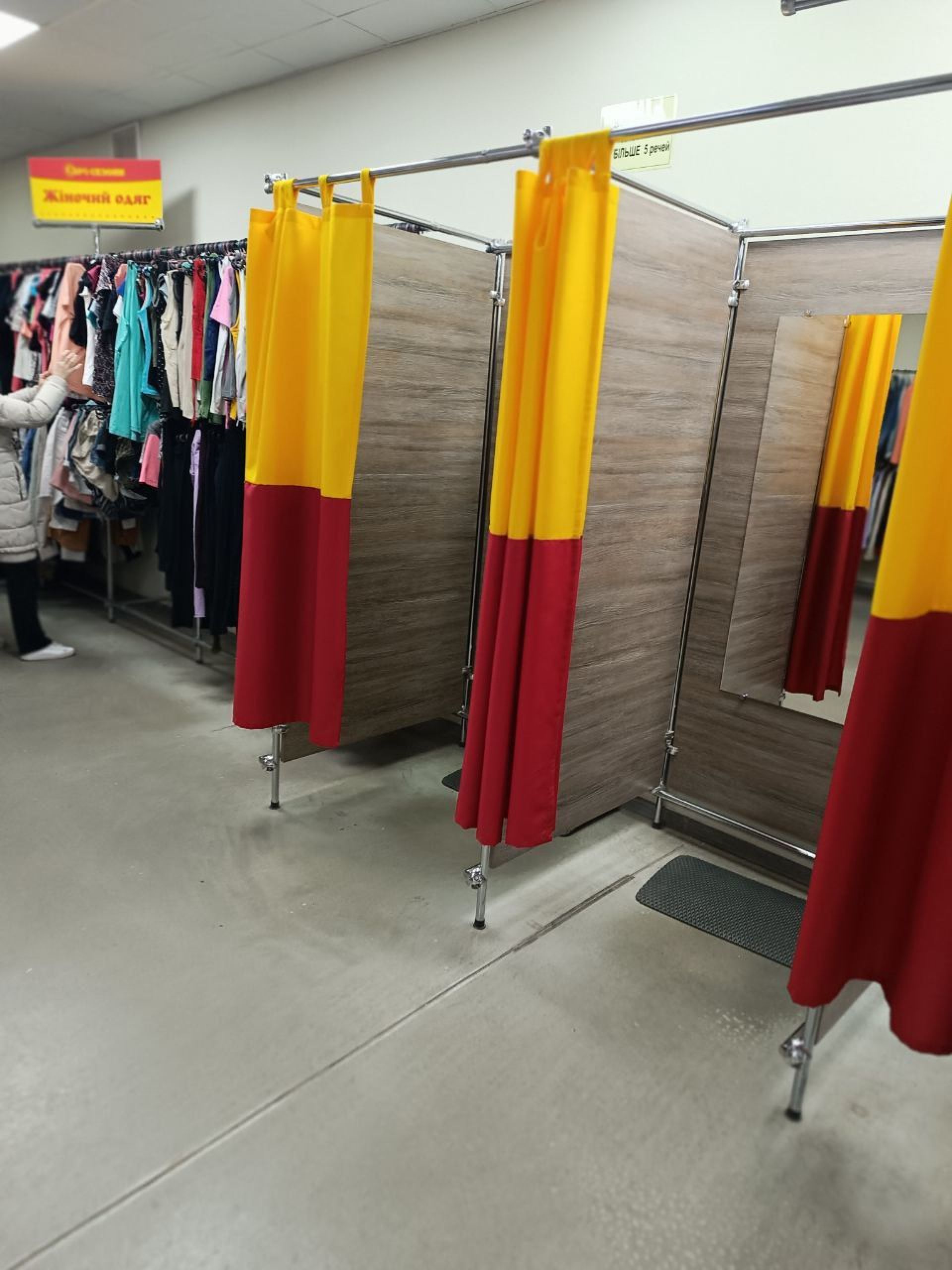 Біля каси є полиця зі взуттям та одягом у хорошому стані за фіксованими цінами. А от шторки у примірочних просвічуються, тож переодягатися не зовсім комфортно.