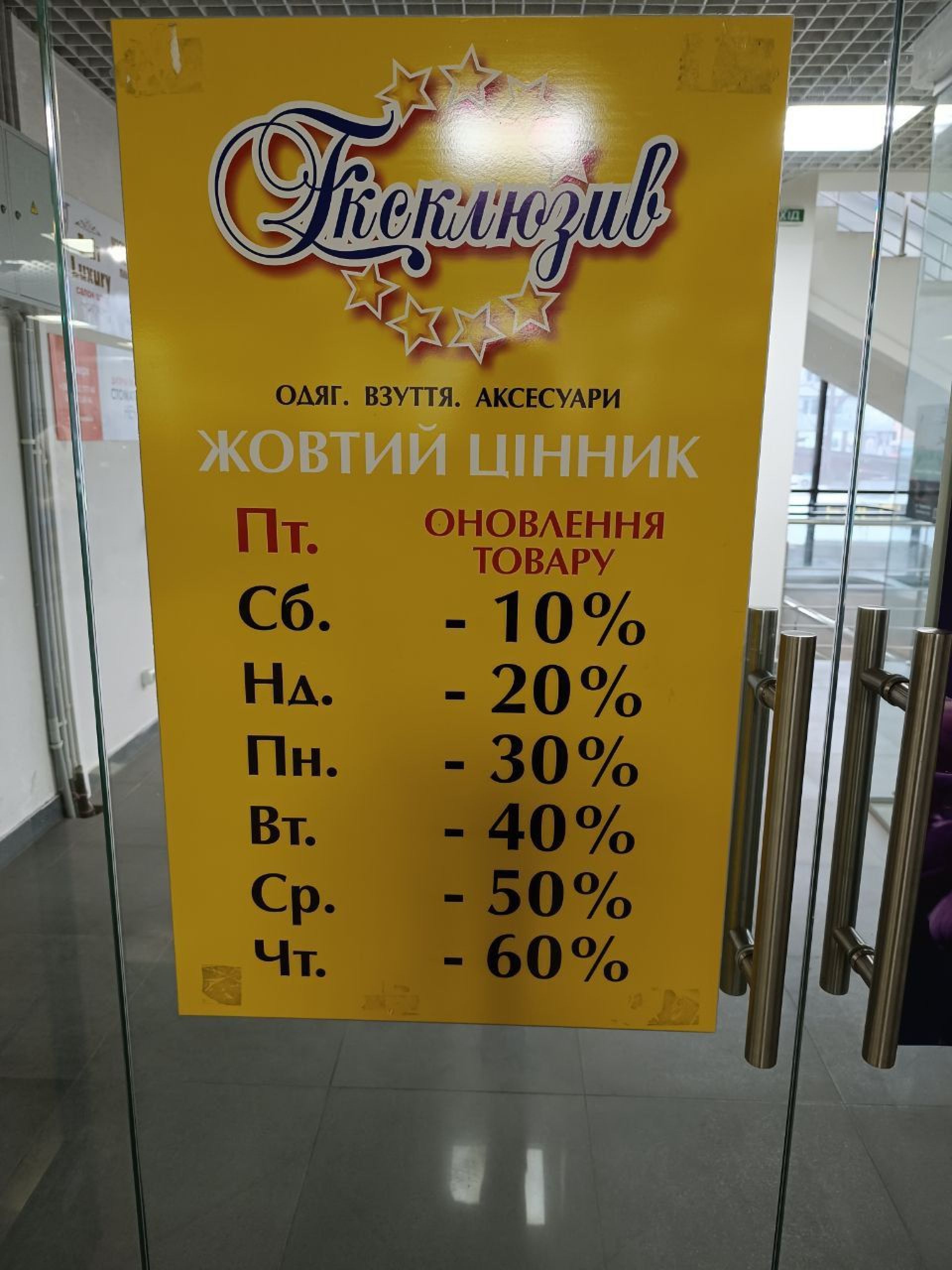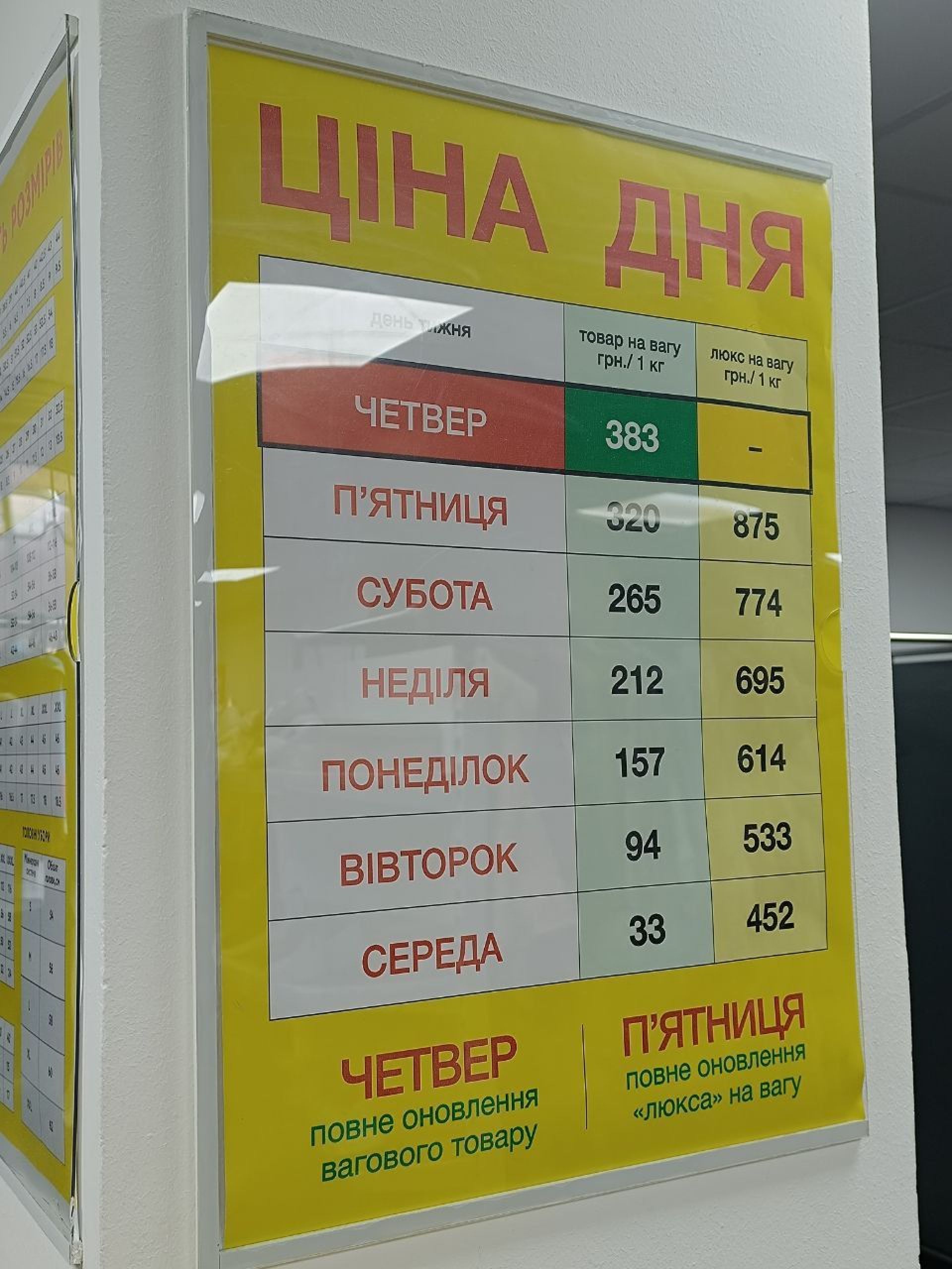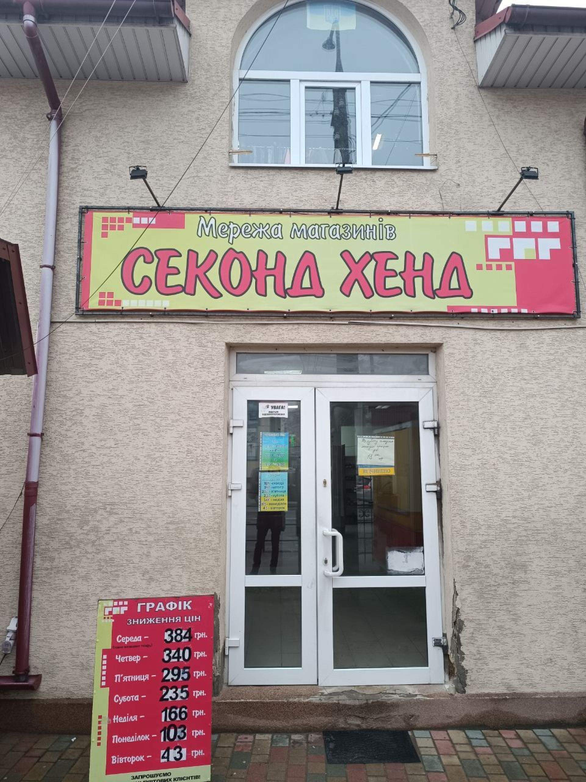 У цьому секонд-хенді зала розділена на дві частини з одягом на вагу та фіксованими цінами. Продається чоловічий, жіночий та дитячий одяг, взуття. У відділі з фіксованими цінами також діє система знижок. Після завозу з кожним днем вартість знижується на певний відсоток – від 10 до 60%. Наприклад, початкова ціна на жіночі блузки в середньому 200-300 гривень. Ціни на взуття – від 200 гривень. Є примірочні з цупкими шторками.