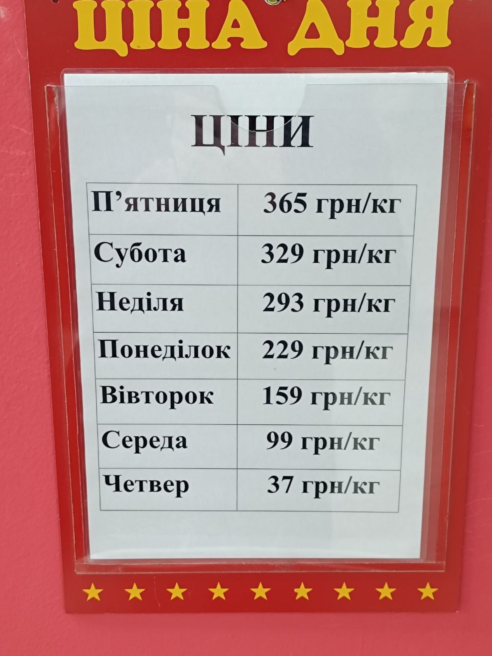 На інфографіці вказано ціни за кілограм одягу від дня оновлення товару. Ціни в день оновлення товару від 274 до 390 гривень. В останній день вартість – від 19 до 43 гривень за кілограм.