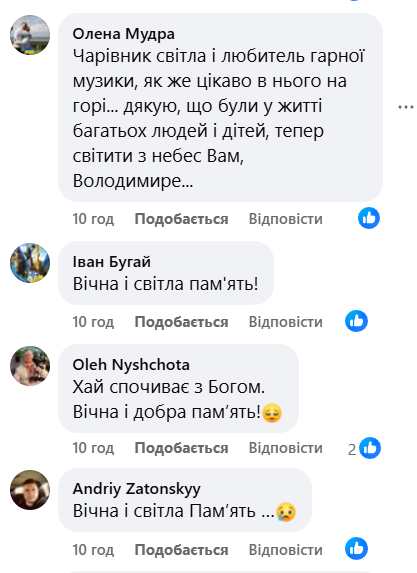 — Новина, яка наче грім серед ясного неба, сколихнула нашу театральну родину! Ще тиждень назад ми розмовляли з Володимиром по телефону, я бажав добре реабілітуватись, набратись сил і згодом продовжити співпрацю, варіанти були. На жаль, не судилося, — йдеться в повідомленні.