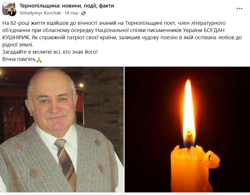 На 82-році життя відійшов до вічності знаний на Тернопільщині поет, член літературного обʼєднання при обласному осередку Національної спілки письменників України Богдан Кушнірик.