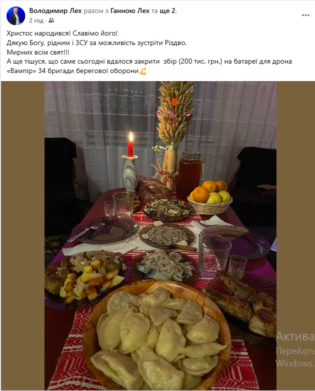 — Дякую Богу, рідним і ЗСУ за можливість зустріти Різдво. Мирних всім свят!!! А ще тішуся, що саме сьогодні вдалося закрити збір (200 тис. грн.) на батареї для дрона «Вампір» 34 бригади берегової оборони, —написав він.