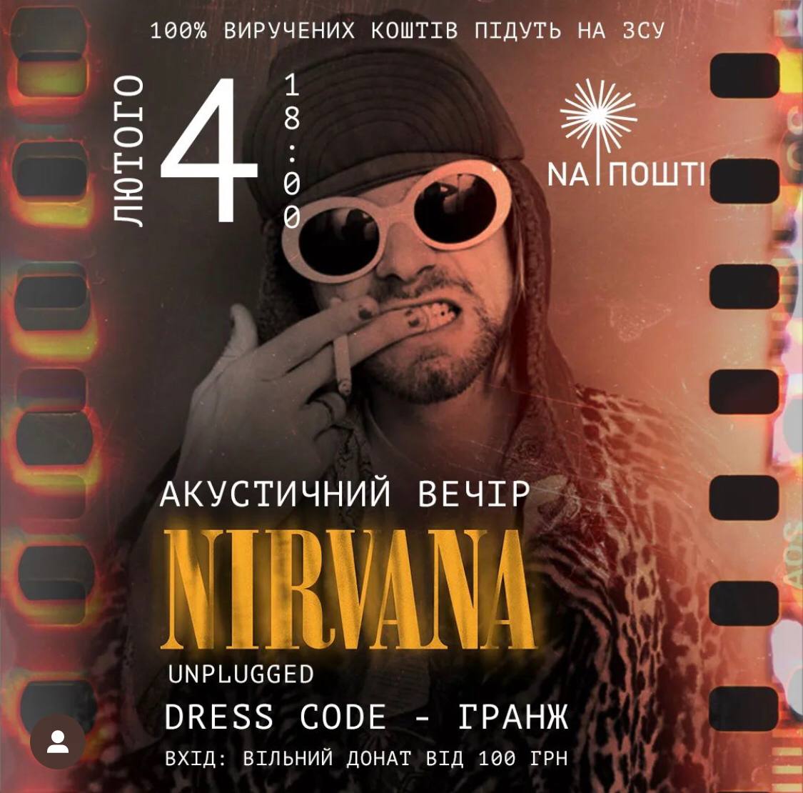 А як Вам ідея насолодитись музикою всесвітньо відомого гурту, які стали класикою року? Команда креативного кластера «Na пошті» запрошує прихильників важкої та акустичної музики на творчий вечір під назвою Nirvana Unplugged. На всіх присутніх очікує неймовірна атмосфера драйву. Ви зможете забути про негатив, трохи відпочити та зарядитися енергією на весь наступний тиждень.