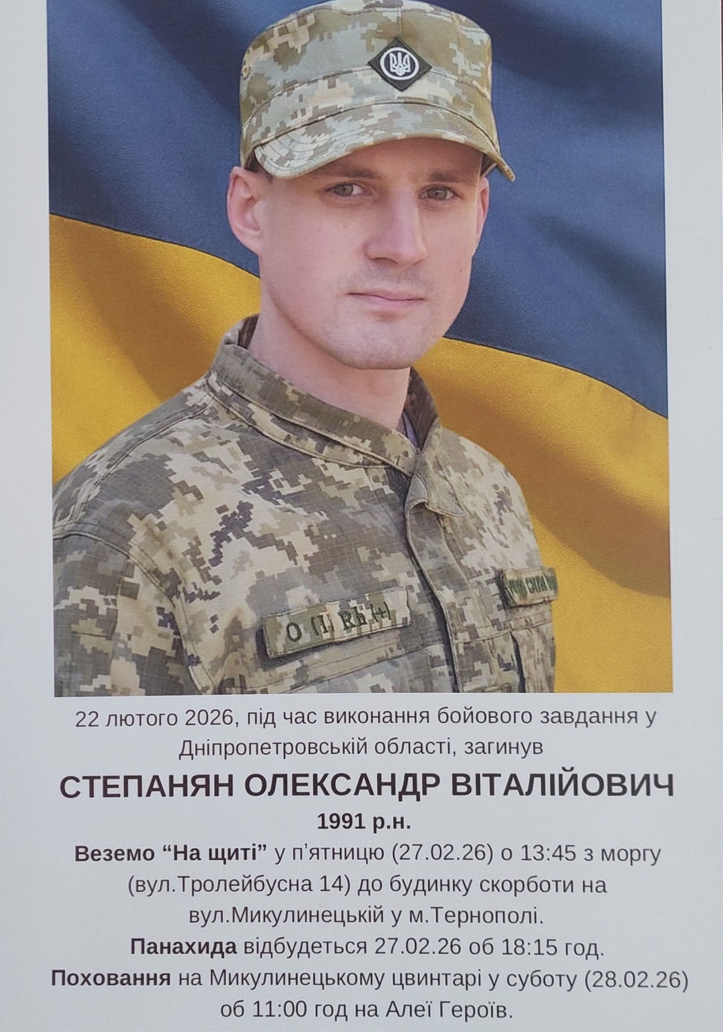 22 лютого на Дніпропетровщині обірвалось життя молодого тернополянина Олександра Степаняна. Вічна пам'ять Герою!