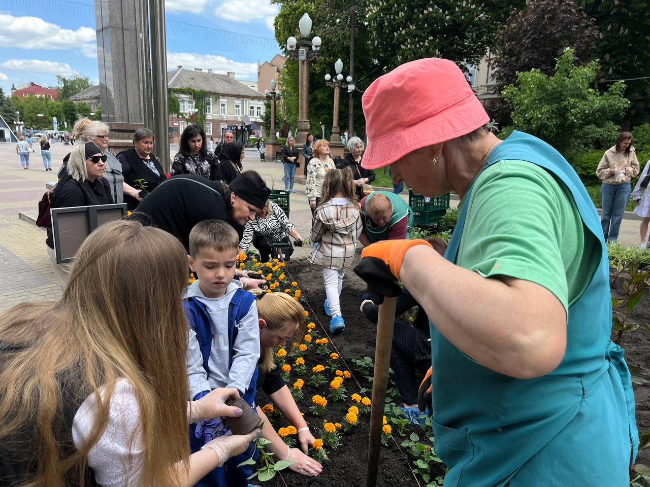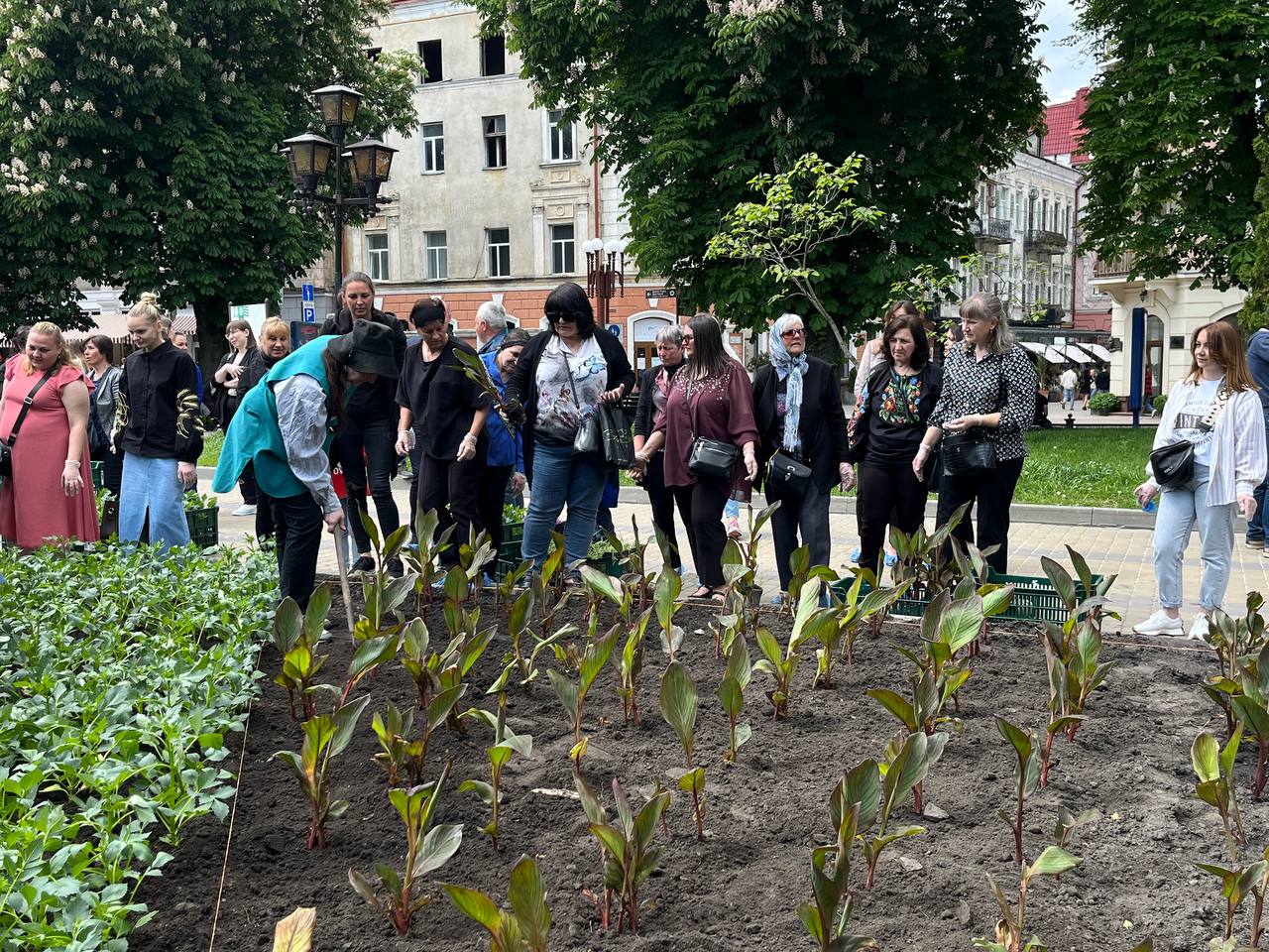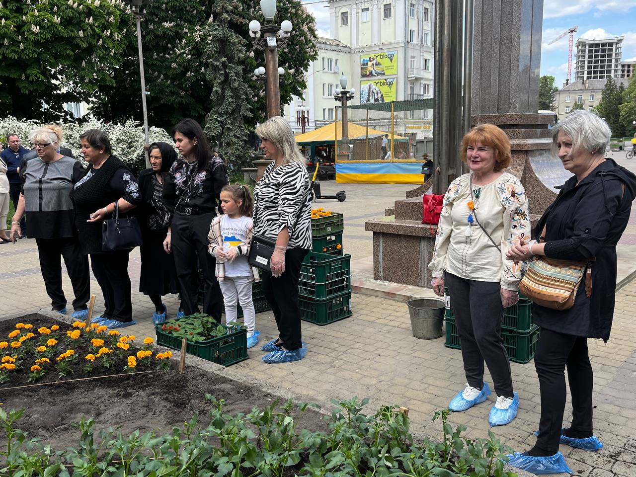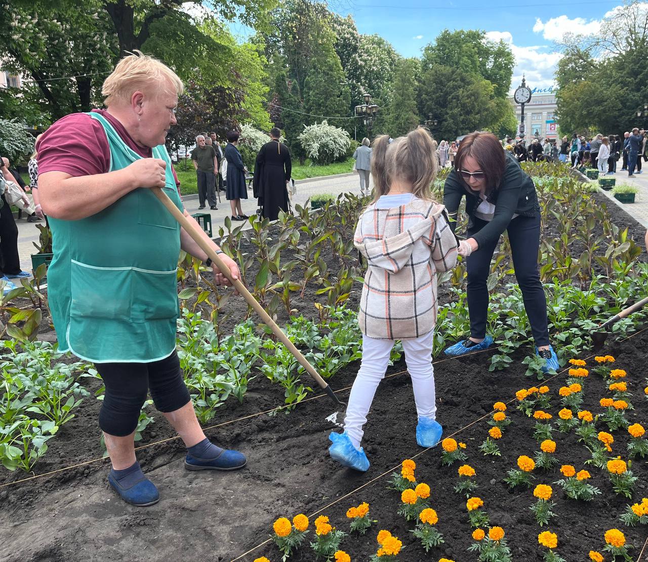 Матусі, жінки, сестри, діти захисників працювали злагоджено. Перша команда жінок діставали розсаду зі спецстаканів, друга – передавала на клумбу, а вже третя – саджали у землю та розрівнювали землю навкруги.