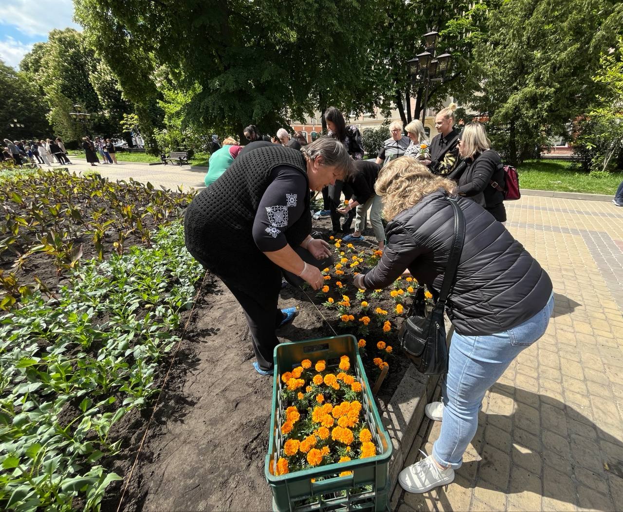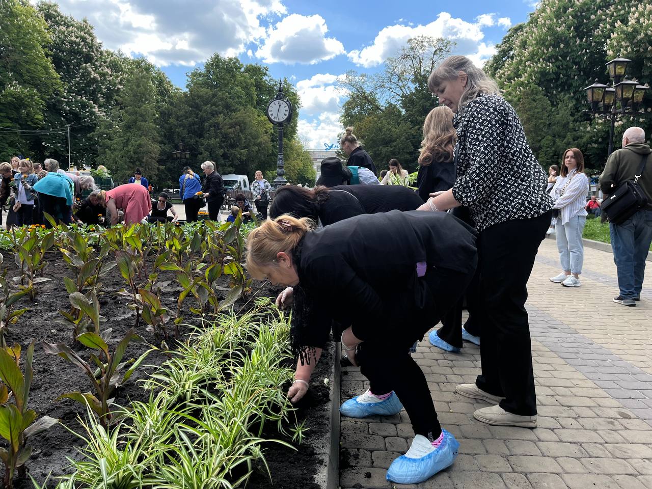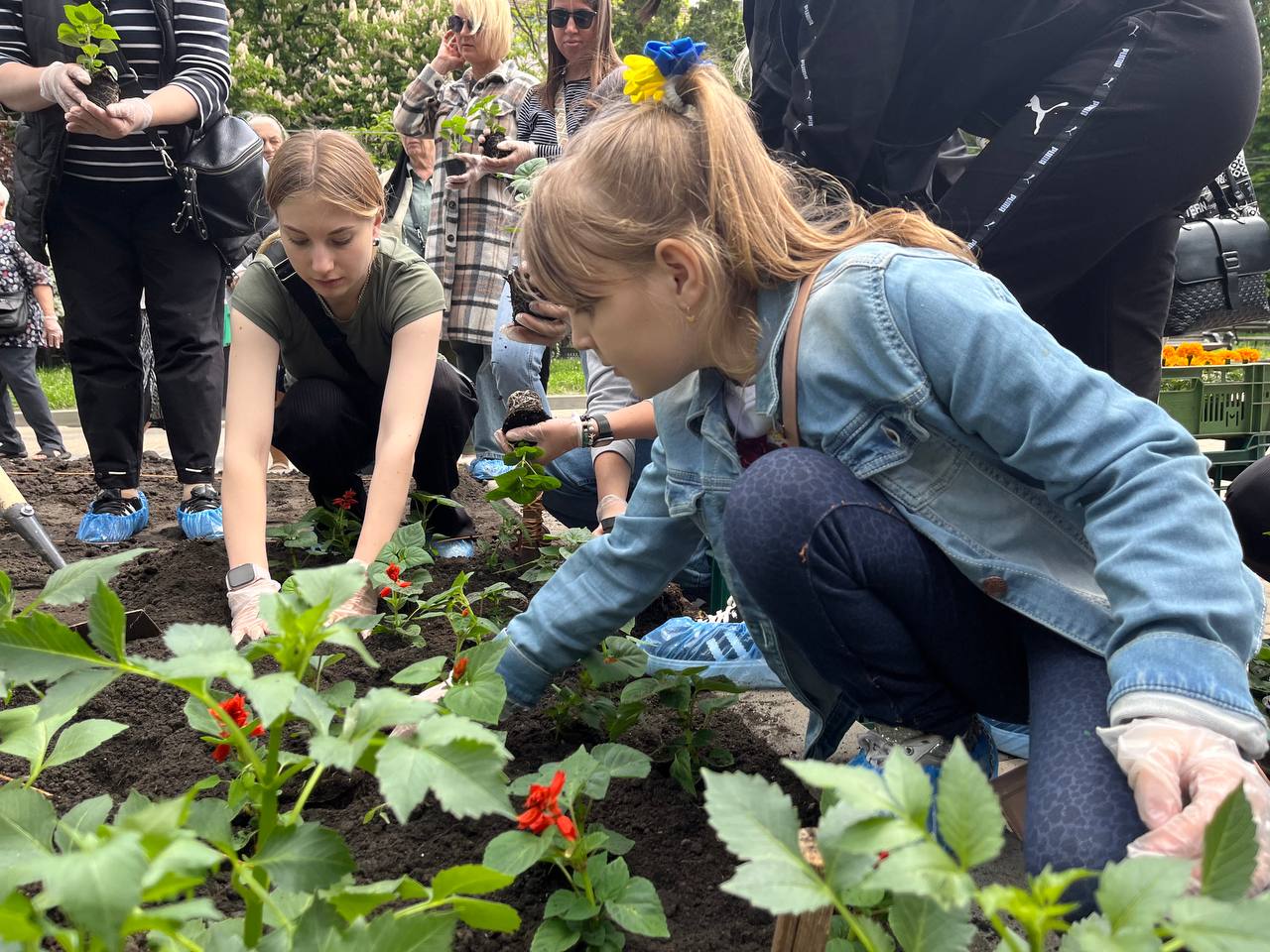 Матусі, жінки, сестри, діти захисників працювали злагоджено. Перша команда жінок діставали розсаду зі спецстаканів, друга – передавала на клумбу, а вже третя – саджали у землю та розрівнювали землю навкруги.