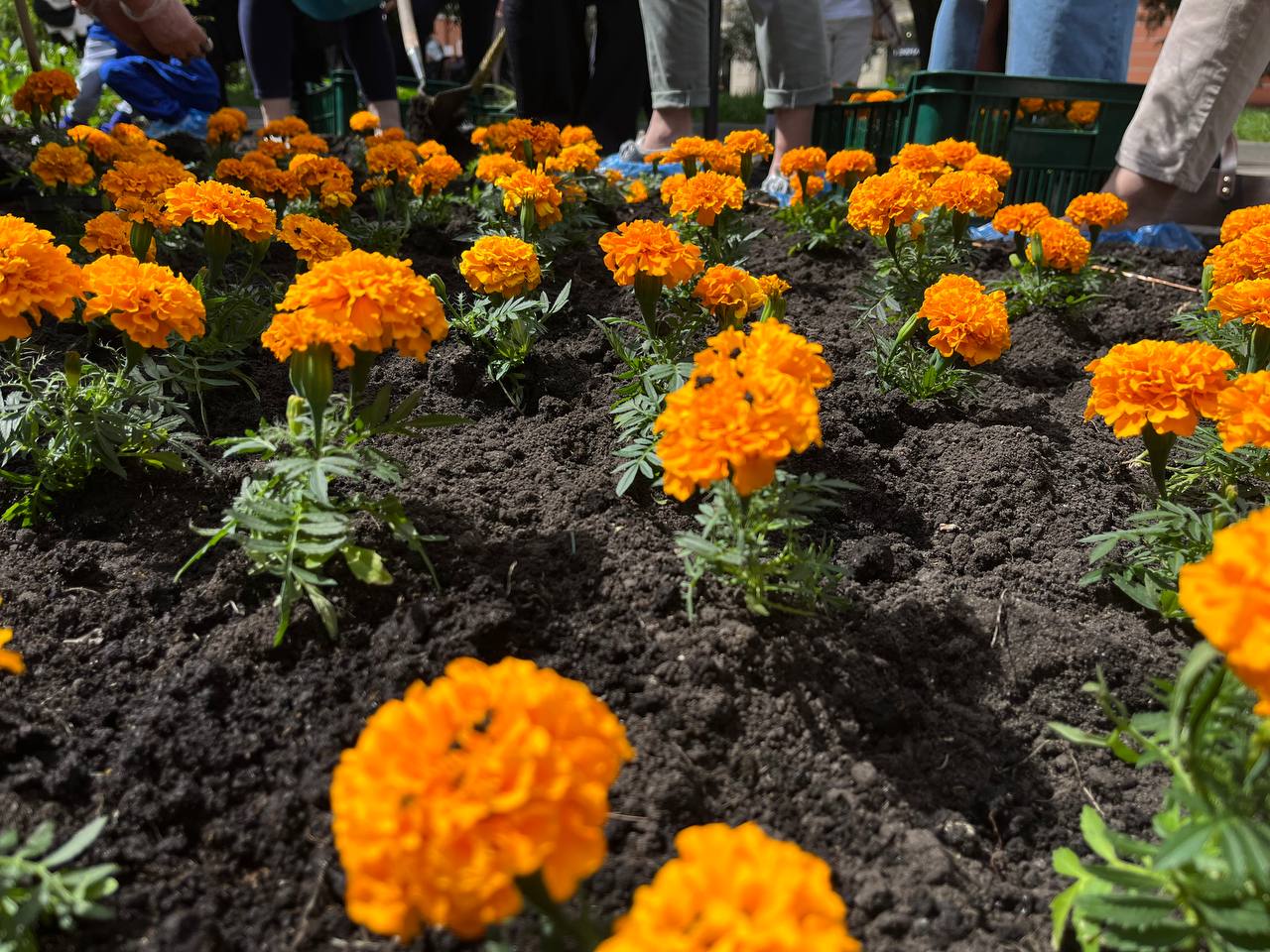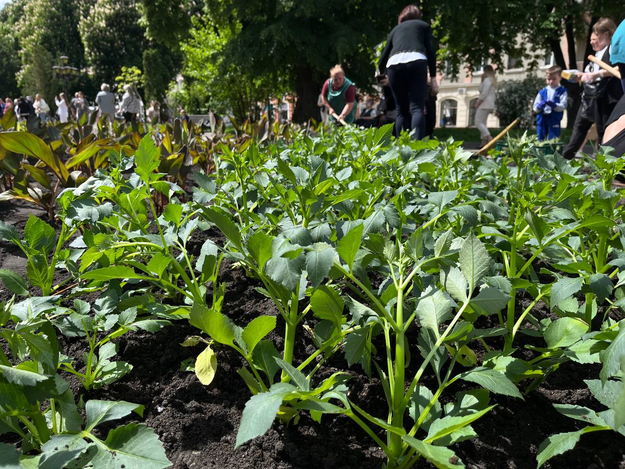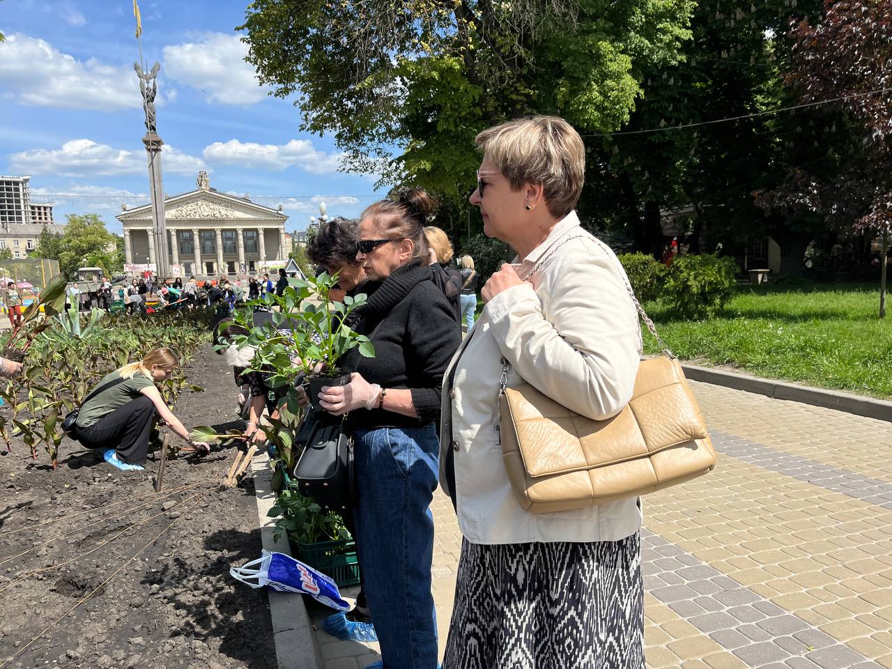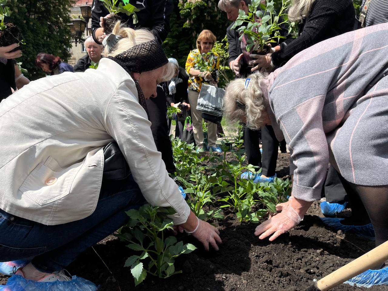 Матусі, жінки, сестри, діти захисників працювали злагоджено. Перша команда жінок діставали розсаду зі спецстаканів, друга – передавала на клумбу, а вже третя – саджали у землю та розрівнювали землю навкруги.