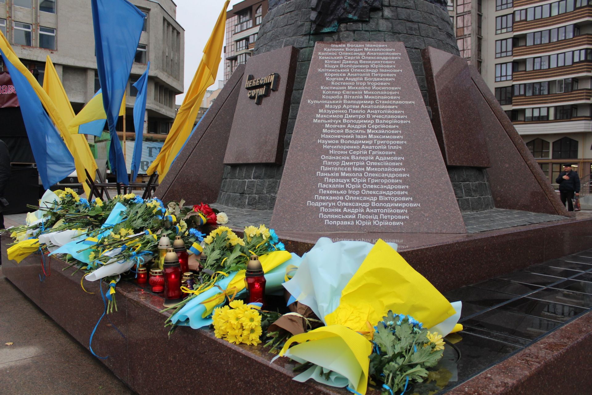Рідні загиблих, представники влади та правоохоронних органів, військові та десятки тернополян поклали квіти та запалили свічки біля символічного знаку пам’яті Героїв, та вшанували загиблих учасників Революції гідності.