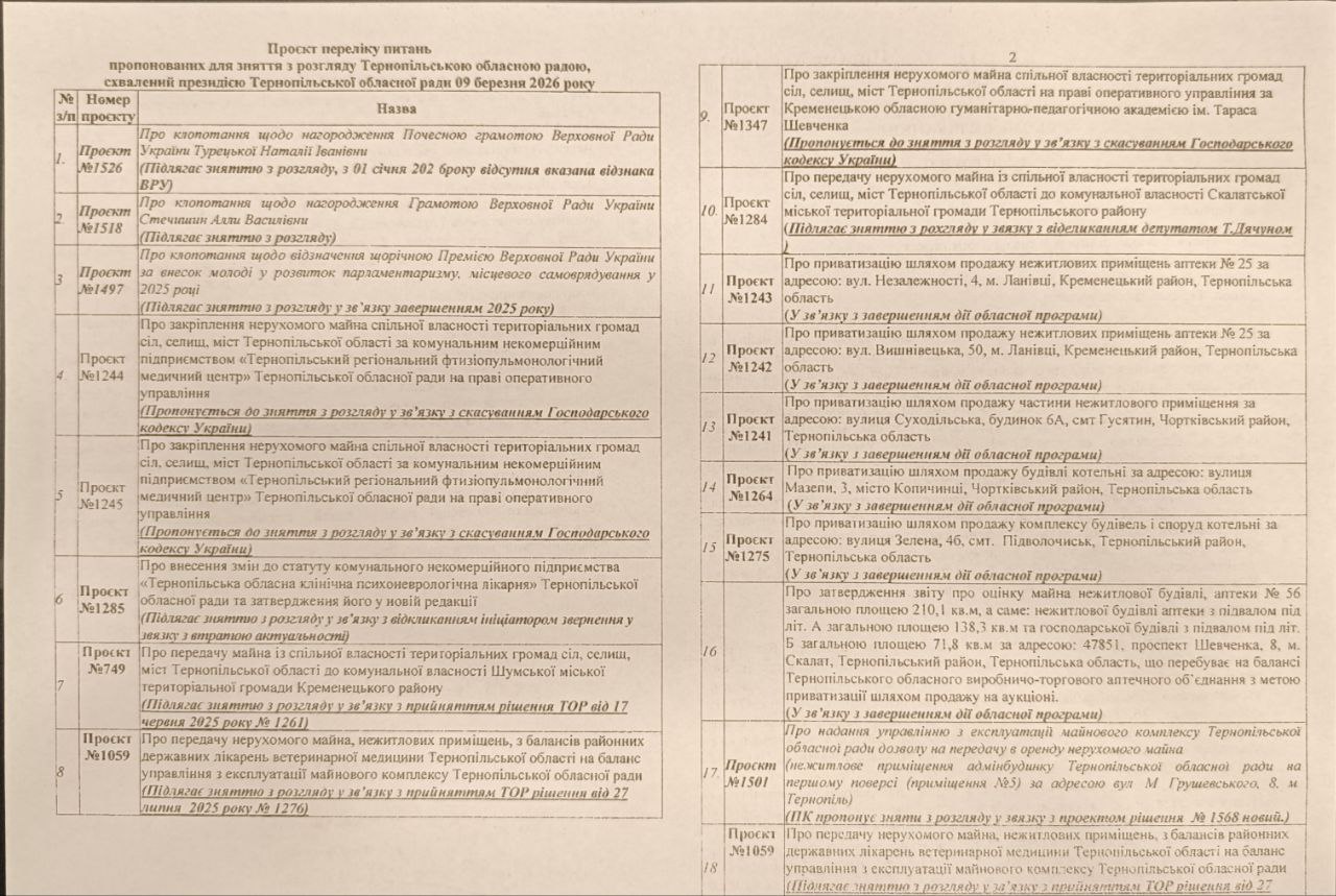 На порядку денному сесії попередньо 268 питань.З них 78 проєктів рішення Про присвоєння звання «Почесний громадянин Тернопільської області» (посмертно). Ще 18 проєктів зняли з порядку денного.