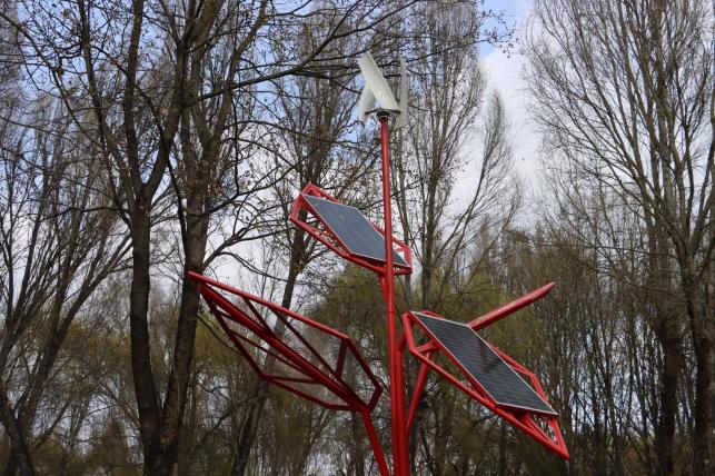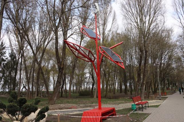 Вздовж пішохідних доріжок провели електромережу. Біля водойми встановили сонячне дерево, де можна підзарядити телефони.