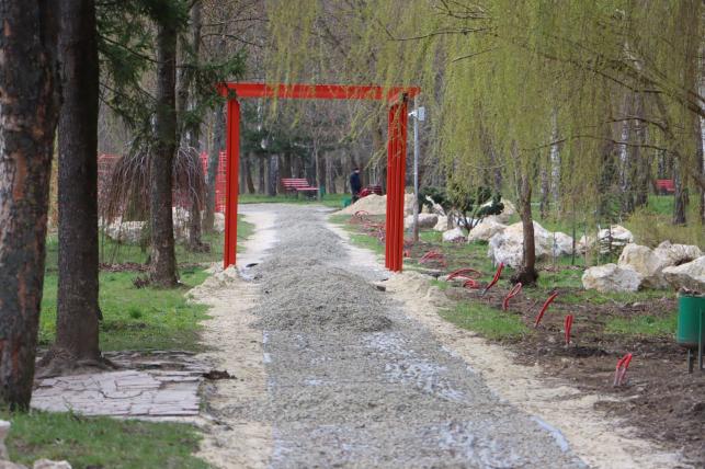 Японський сад облаштовують біля водойми зі штучним підводним гейзером. Там вже висадили нові рослини, завезли декоративне каміння та встановили дві арки на бетонний фундамент.