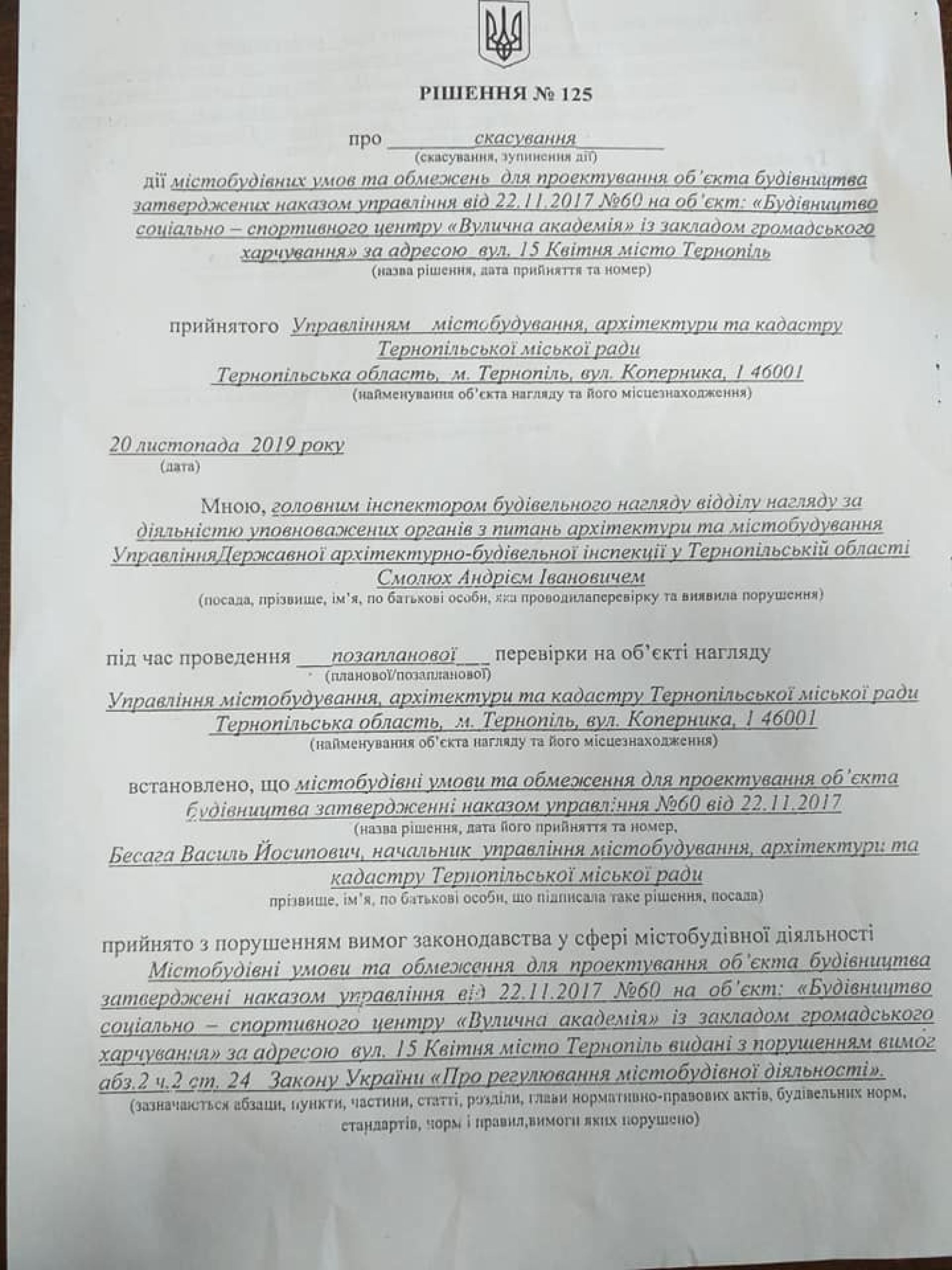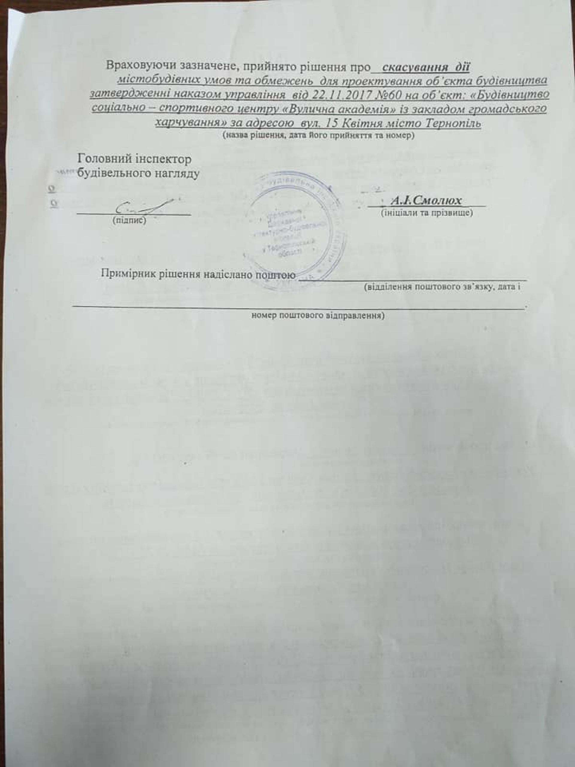 “Ми домоглися скасування містобудівних умов та обмежень для готелю "Вуличної академії" в парку Національного відродження. Жодні будівельні роботи на вказаному об'єкті вестися не можуть. Прошу поліцію взяти до уваги цей доказ. Окремо готуються документи по чиновниках ТМР, що підписують незаконні дозвільні документи. Далі буде.”, - написала Юлія на своїй сторінці і додала фото рішення у якому йдеться про скасування. Скасував містобудівні умови та обмеження “Вуличної академії” в парку Нацвідродження Держархбудконтроль області.