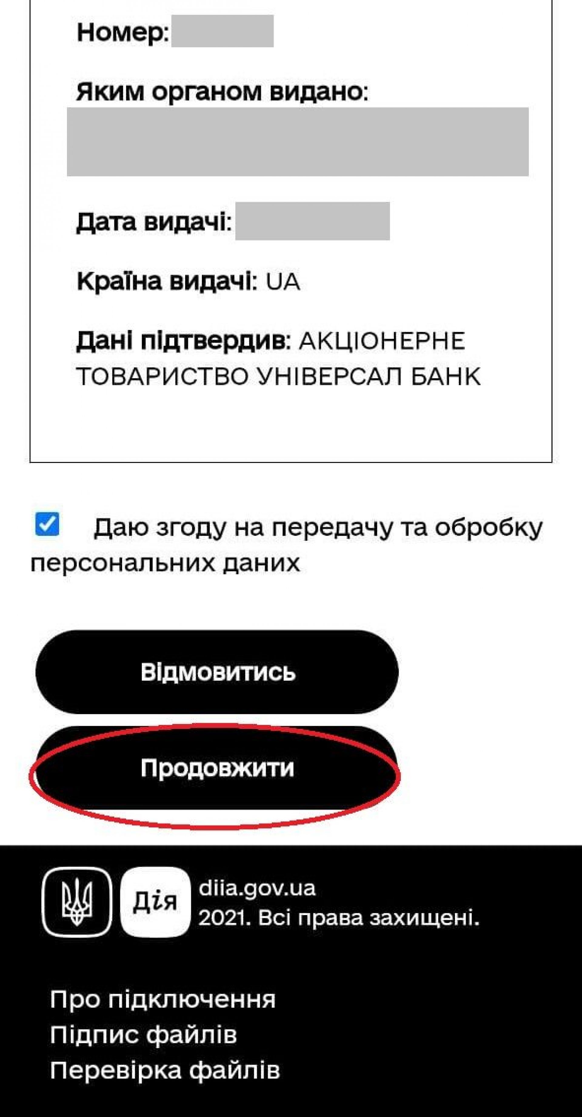 Далі авторизуємося через ваш банк, послугами якого ви користуєтеся. Треба підтвердити вхід та передачу даних. Перевірте дані та натисніть «Продовжити».
