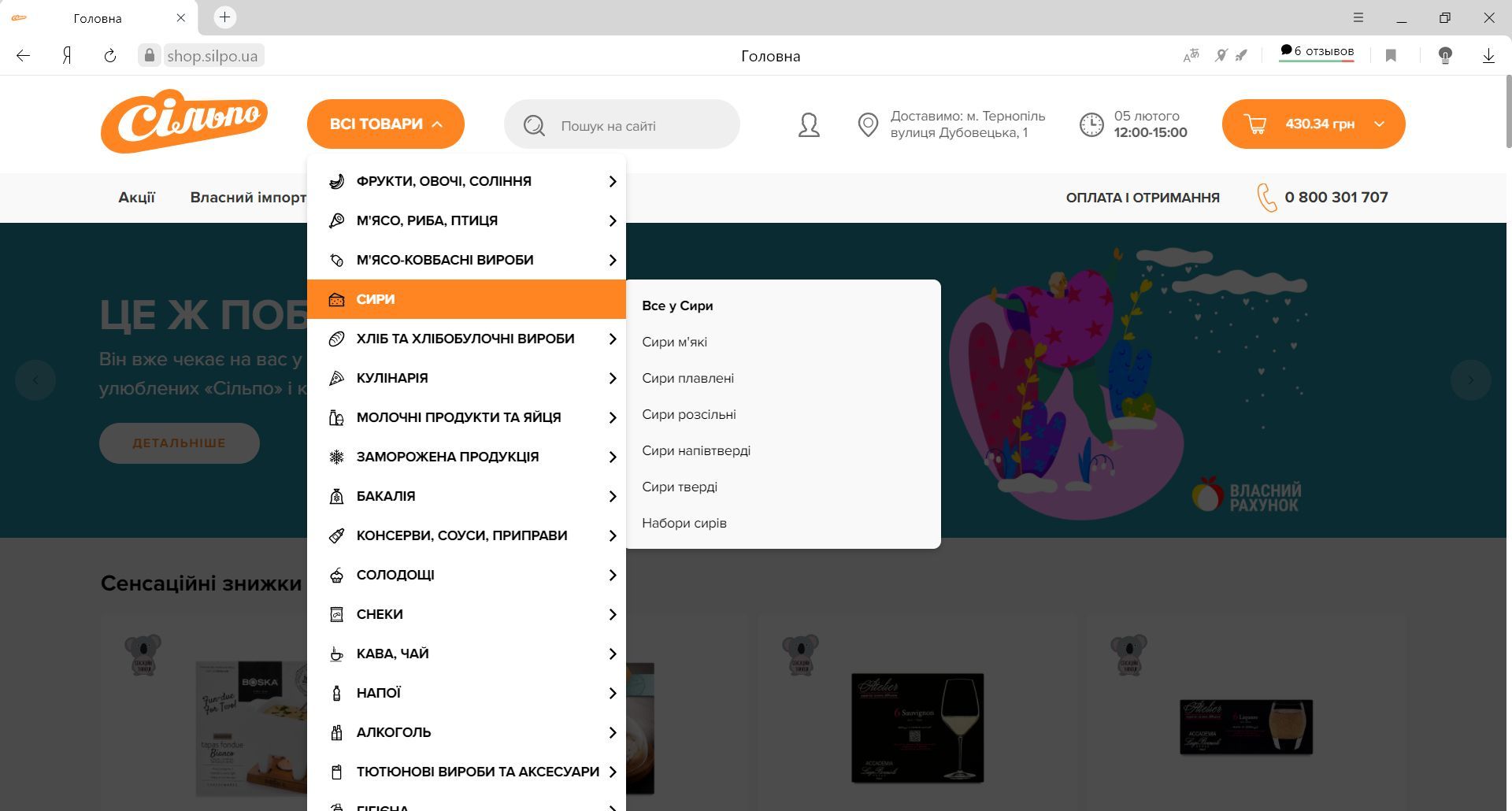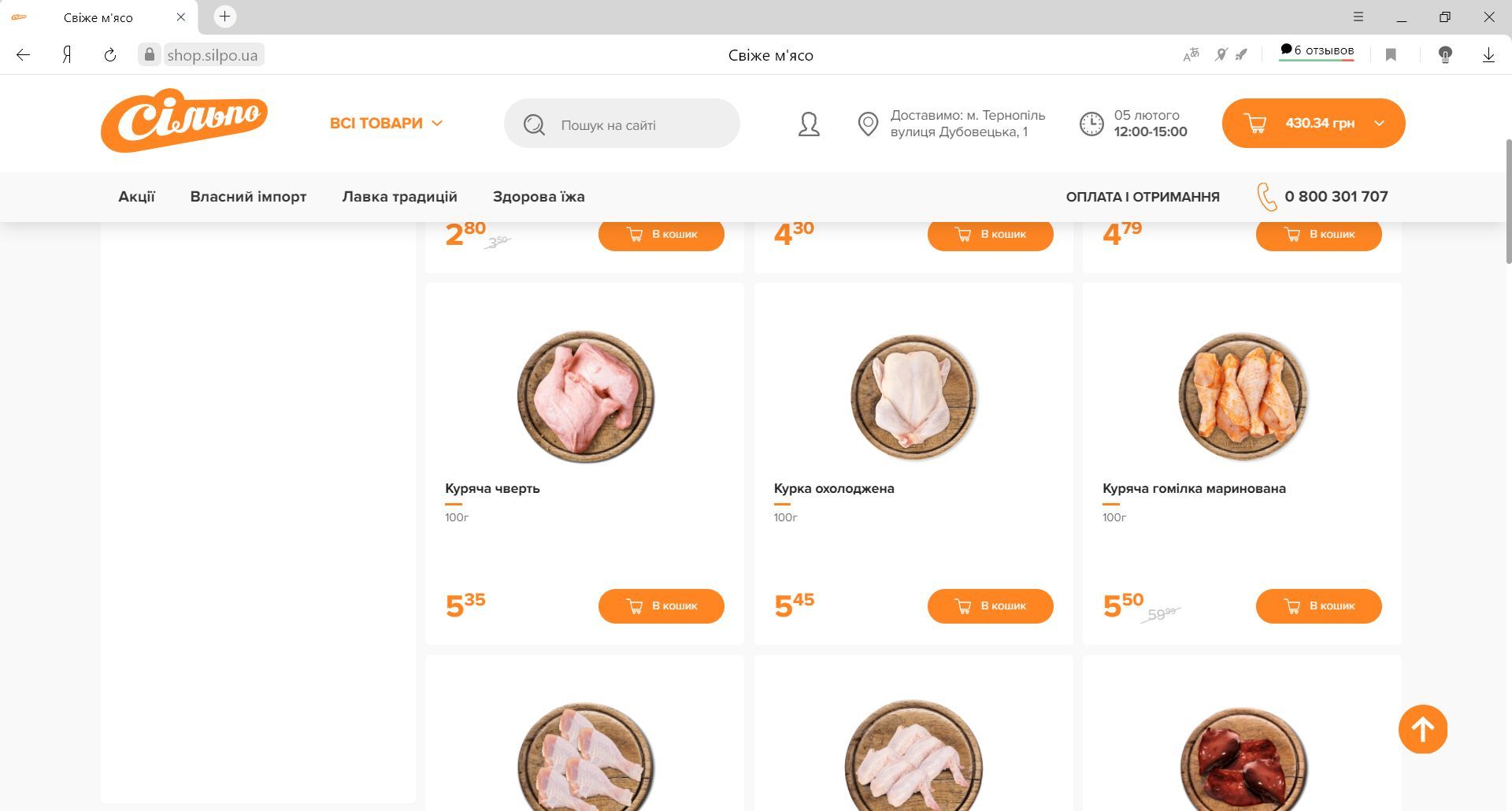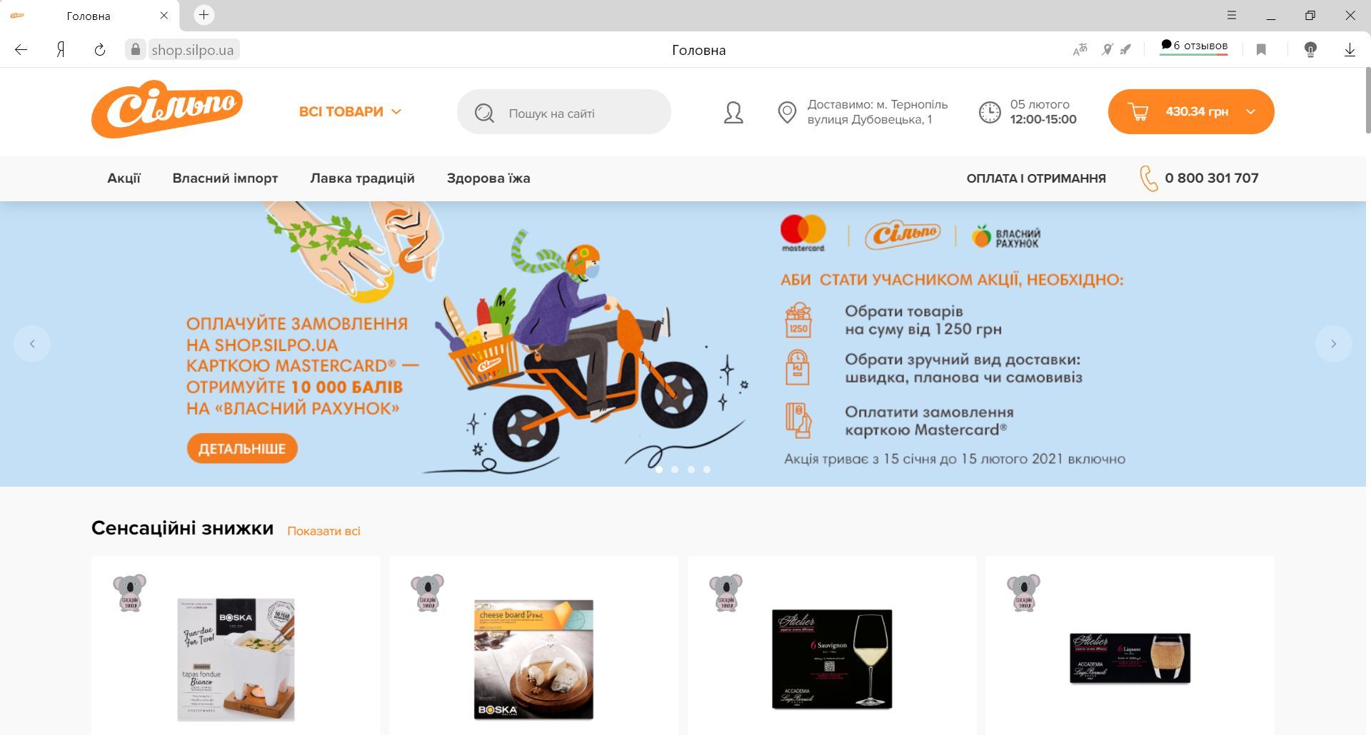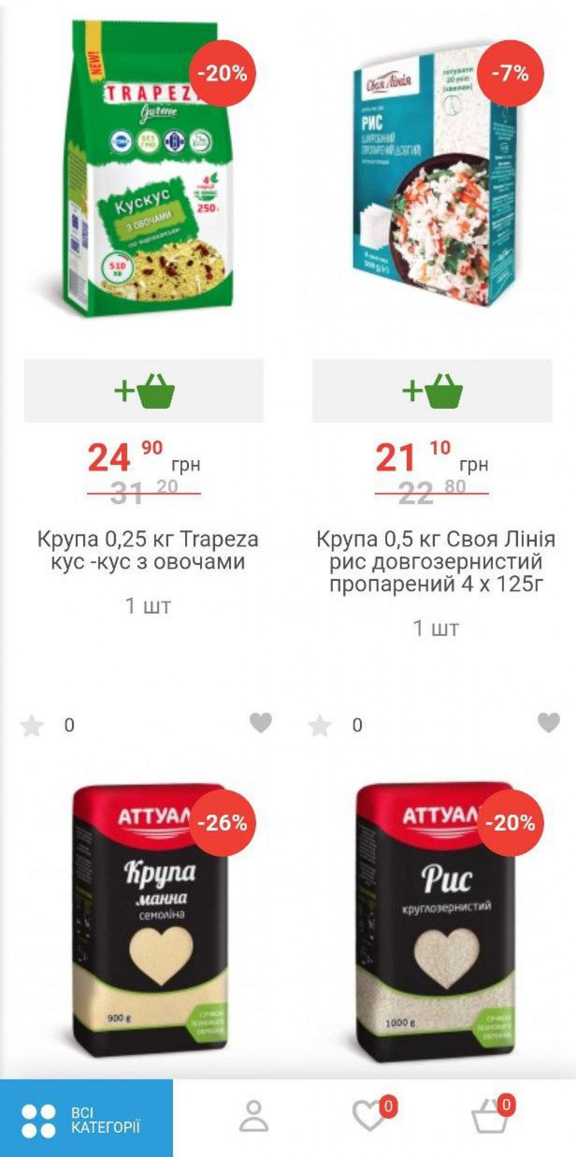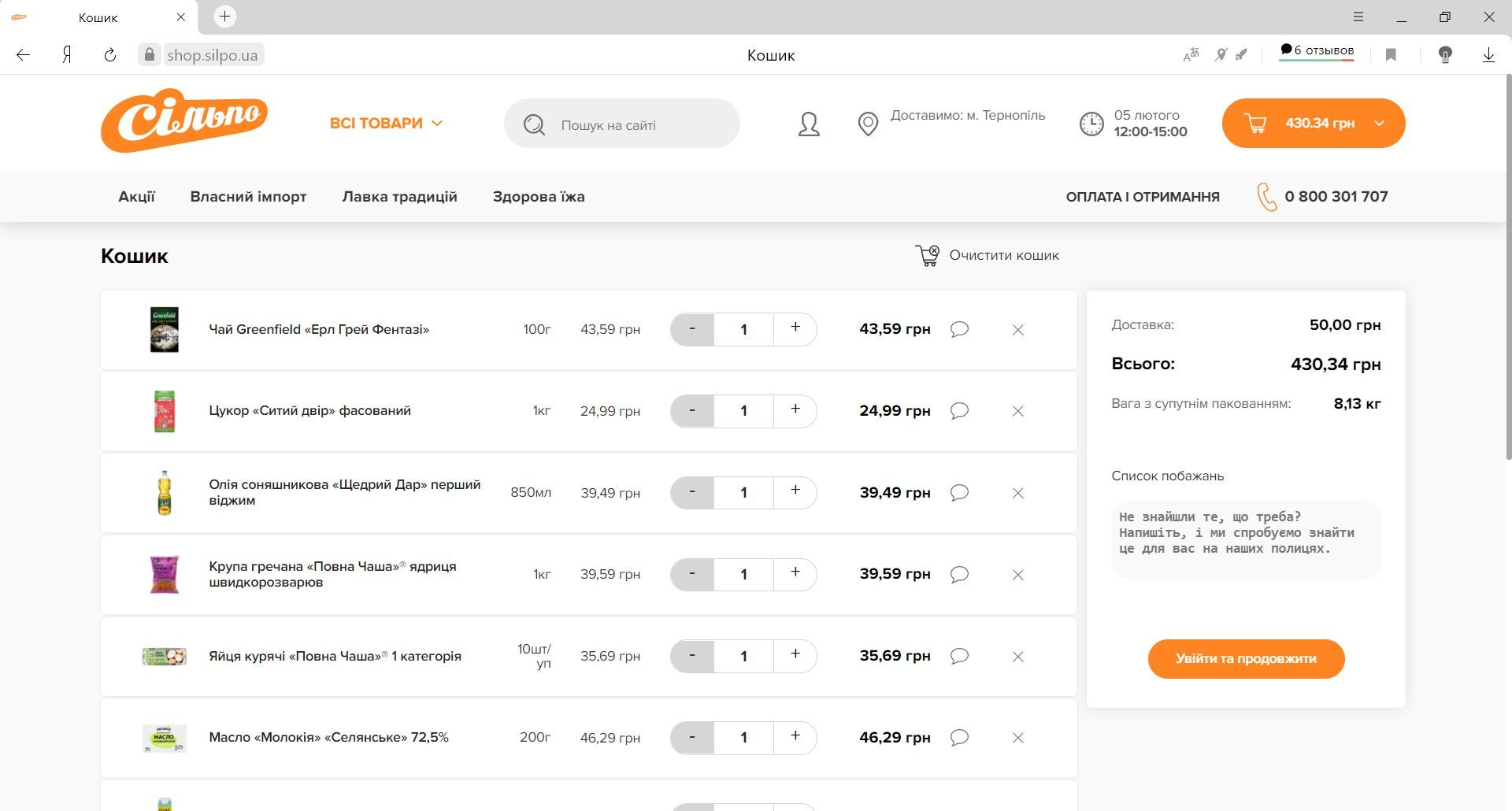 На сайті «Сільпо» також можна знайти все необхідне. Доставка – 50 гривень. Загалом кошик разом з доставкою обійшовся в 430 гривень.