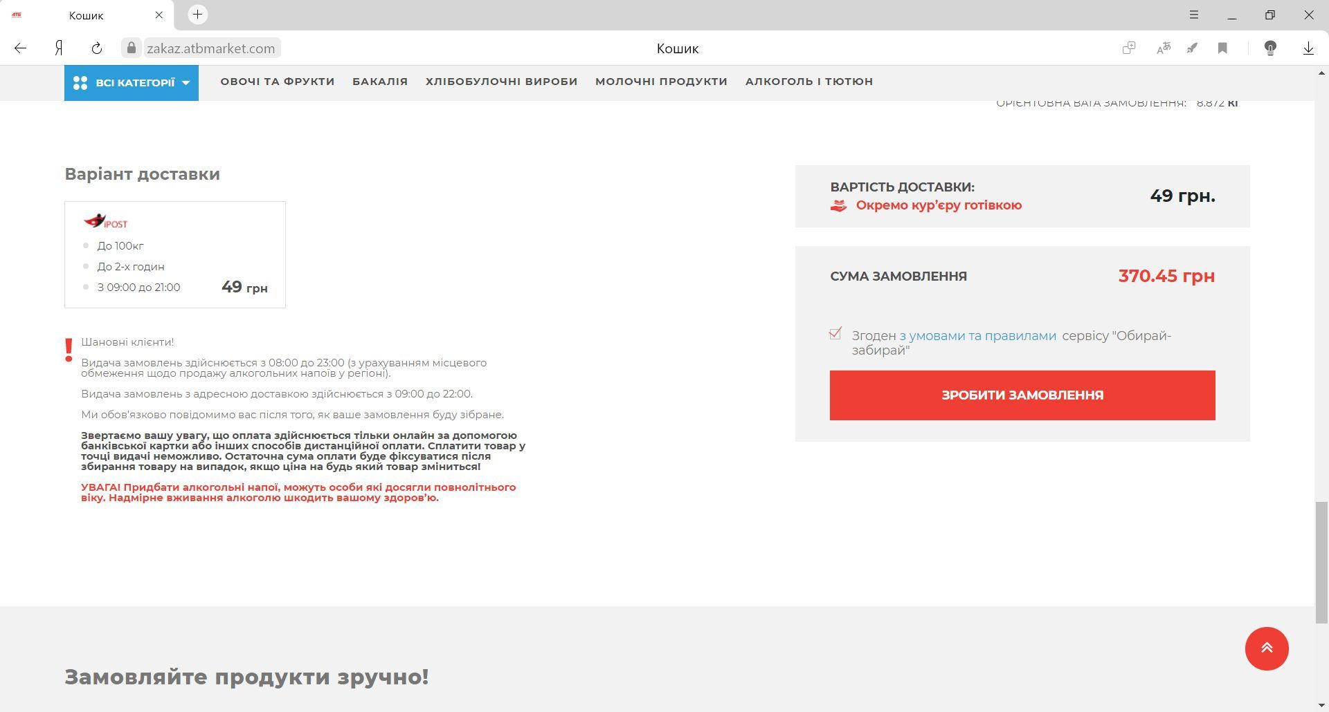 Вартість доставки в супермаркеті «АТБ» коштує 49 гривень. Замовити товар можна на офіційному сайті магазину. Крупи, цукор, м’ясо – фасовані. Овочі та фрукти – на вагу. Наш кошик обійшовся в 368 гривень, разом з доставкою – 417.