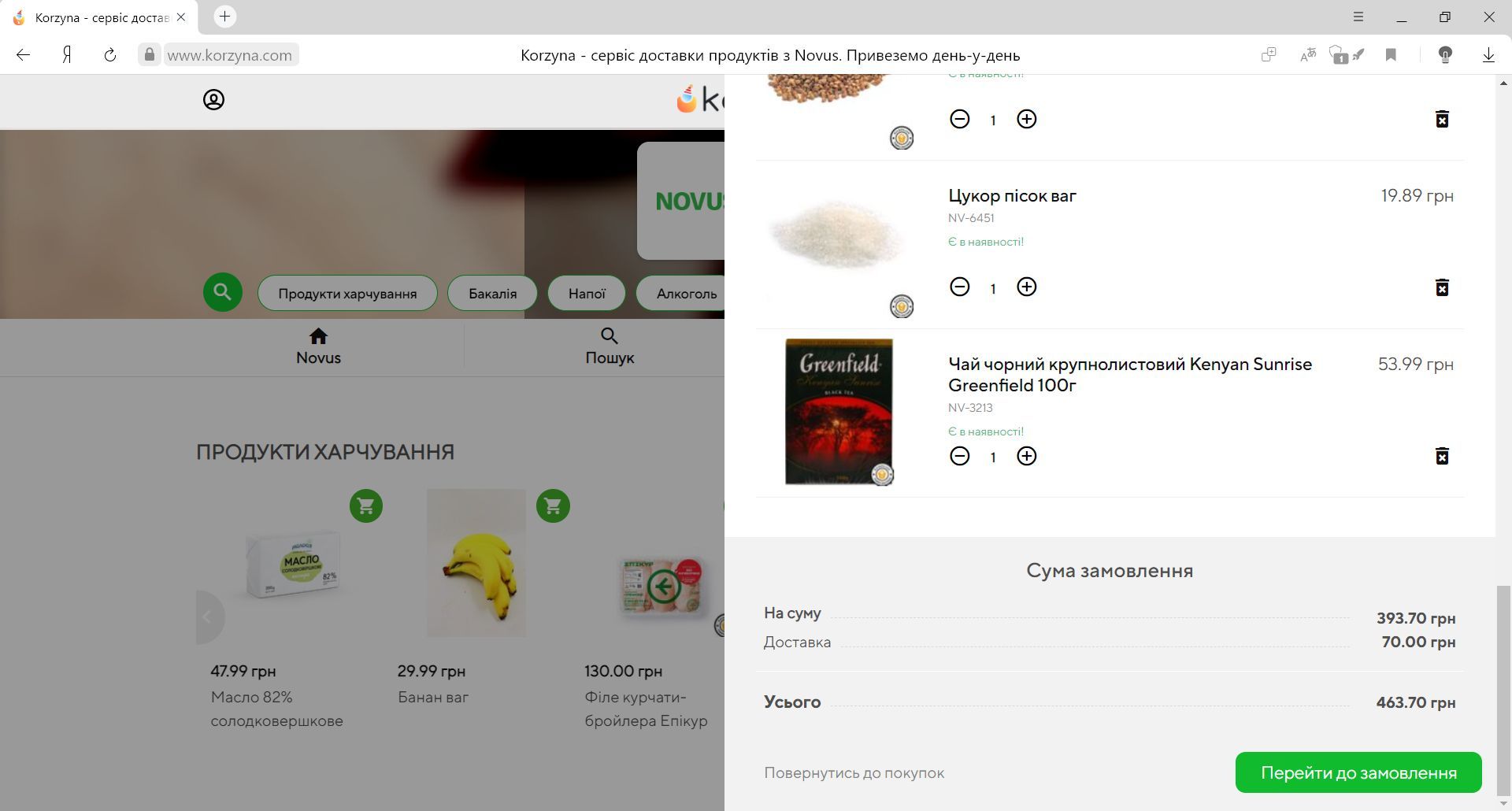Доставка нашого продуктового кошика з «Новуса» через «Корзину» коштує майже 464 гривні, через GLOVO – 448 гривень.