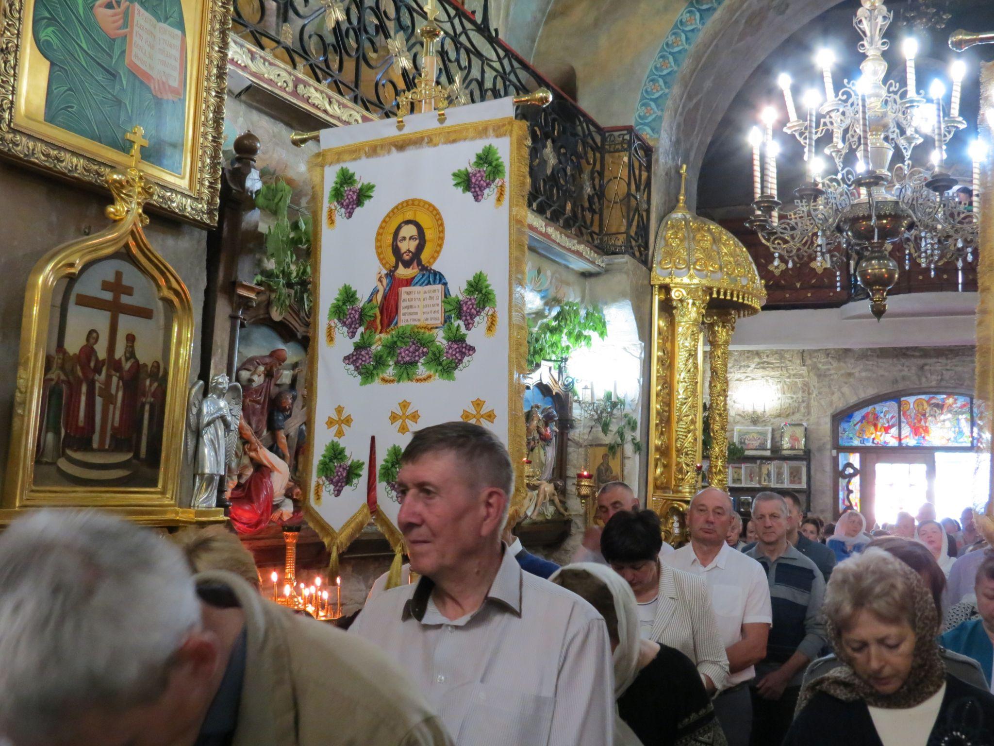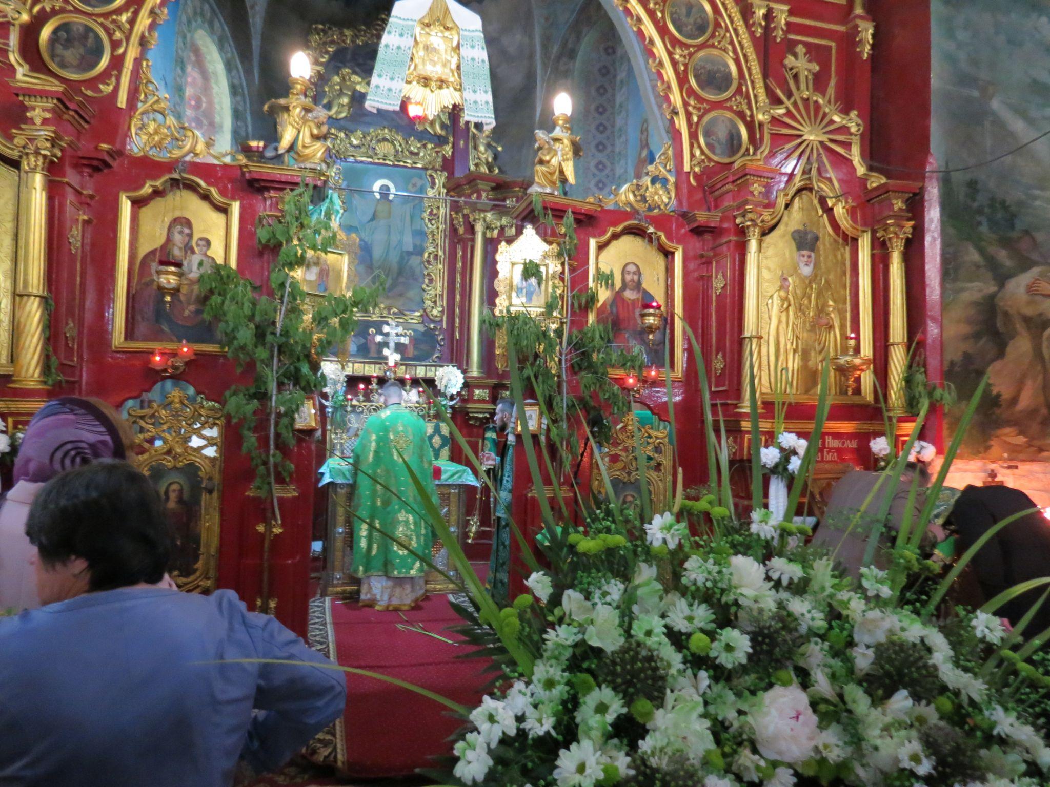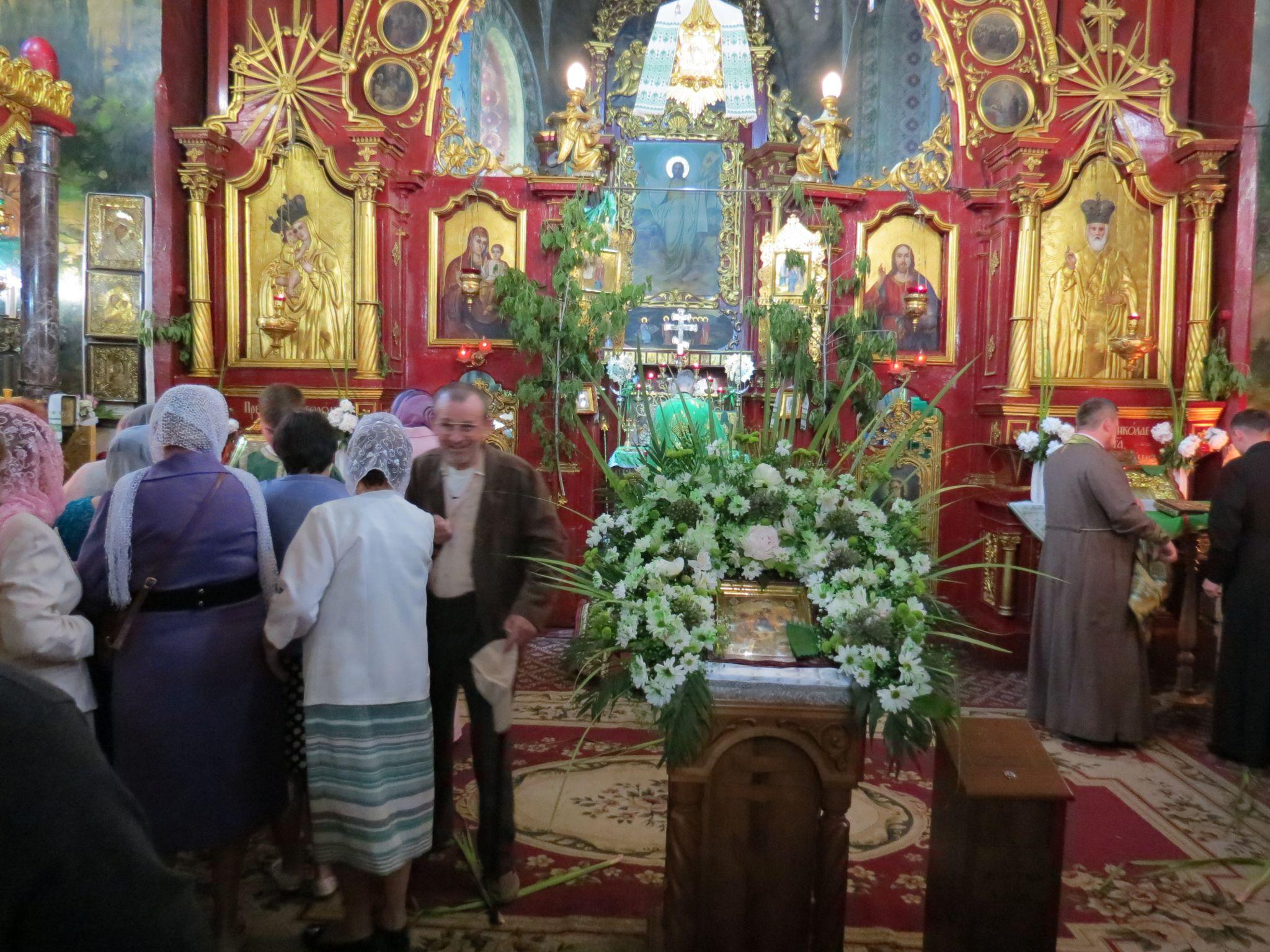 Під час служби всередині храму було багато людей. Ікони прикрасили зеленню. На вулиці стояли всього кілька людей.