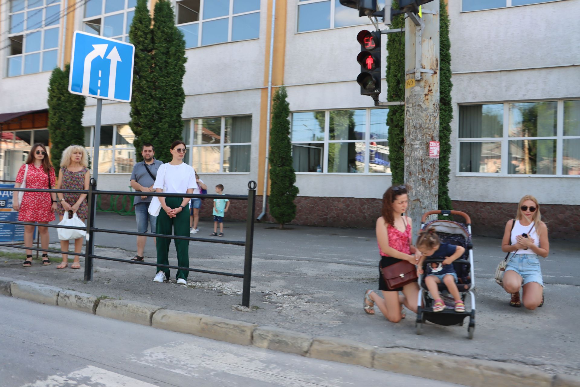 Ще одна жінка з дитячим візком хотіла перейти дорогу перед колоною на вулиці Київській. Вона пропустила поліцейську машину та вже рушила, однак зрозуміла, що рухається колона «На щиті» та одразу відійшла назад, показуючи жестами, що не помітила і просить вибачення.